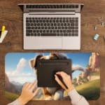 There is a little brown and white dog on the Infidu desk mat that looks happy and excited. Behind the subject is a soft, light-colored scene with gentle hills or mountains, a blue sky, and a few soft clouds. The design is happy and light, and the color scheme is mostly soft blues, greens, and earthy tones. The skilled digital artists who made this high-quality desk mat added a fun and cute touch to your workspace. Get it now to make someone happy!
