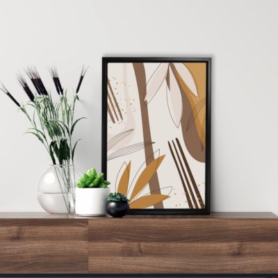 Boho Art – Tropical Leaves and Shapes Boho Style Floating Canvas Wall Art With Brown and Orange Colors – Art Model No – Single Frame – bohoart-1f-78-a