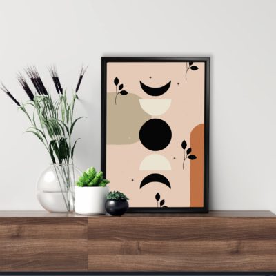 Boho Art – Tropical Leaves and Shapes Boho Style Floating Canvas Wall Art With Black and Beige Colors – Art Model No – Single Frame – bohoart-1f-76-b