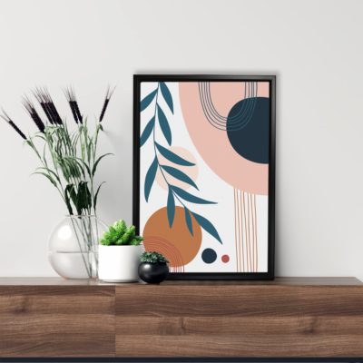 Boho Art – Tropical Leaves and Shapes Bohemian Style Floating Canvas Wall Art With Blue and Orange Colors – Art Model No – Single Frame – bohoart-1f-73-a