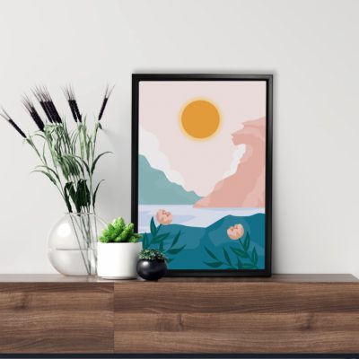 Boho Art – Sun With Plants Style Floating Canvas Wall Art With Orange and Blue Colors – Art Model No – Single Frame – bohoart-1f-70-a