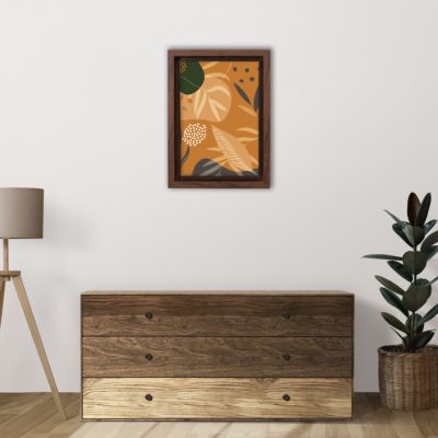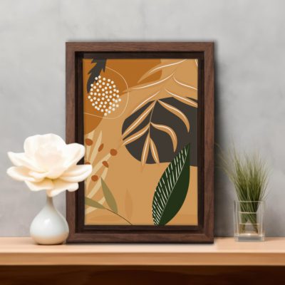 Boho Art – Tropical Leaves and Shapes Boho Style Floating Canvas Wall Art With Orange and Brown Colors – Art Model No – Single Frame – bohoart-1f-28-b