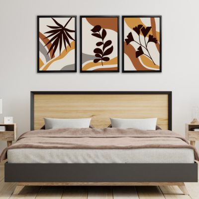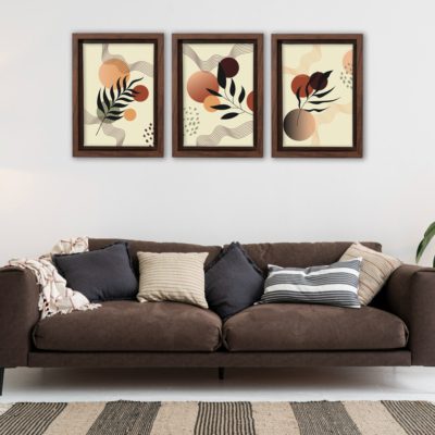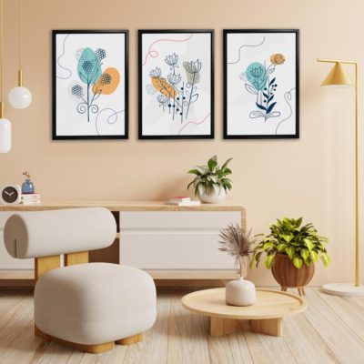 Boho Art – Botanical Boho Style Floating Canvas Minimalist Wall Art With Blue and Orange Colors – Art Model No – Three Frame – bohoart-3f-98