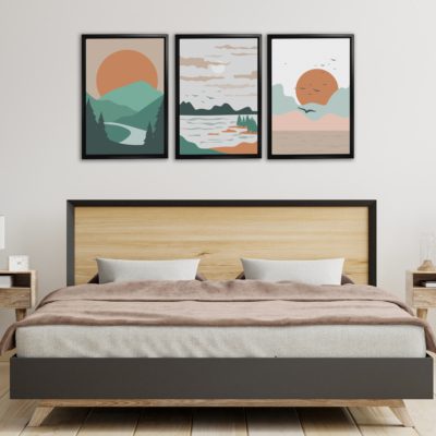Boho Art – Sun With Mountains Boho Style Floating Canvas Minimalist Wall Art With Orange and Green Colors – Art Model No – Three Frame – bohoart-3f-99