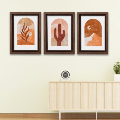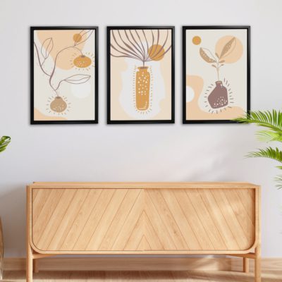 Boho Art – Sun With Plants Boho Style Floating Canvas Minimalist Wall Art With Brown and Orange Colors – Art Model No – Three Frame – bohoart-3f-12