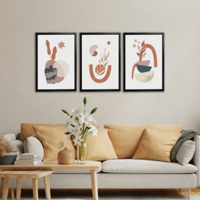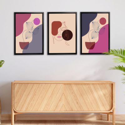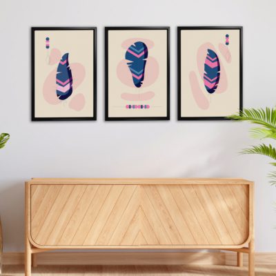 Boho Art – Botanical Boho Style Floating Canvas Minimalist Wall Art With Pink and Blue Colors – Art Model No – Three Frame – bohoart-3f-22