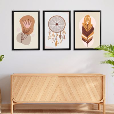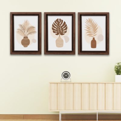 Boho Art – Tropical Leaves and Shapes Boho Style Floating Canvas Wall Art With Brown and Beige Colors – Art Model No – Three Frame – bohoart-3f-16