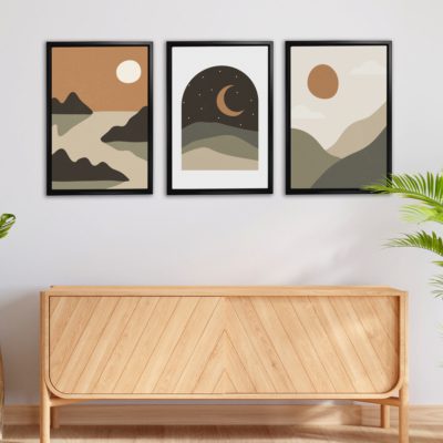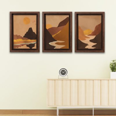 Boho Art – Sun With Mountains Boho Style Floating Canvas Minimalist Wall Art With Brown and Beige Colors – Art Model No – Three Frame – bohoart-3f-18