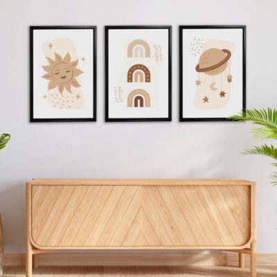 Boho Art – Sun With Shapes Boho Style Floating Canvas Minimalist Wall Art With Brown and Beige Colors – Art Model No – Three Frame – bohoart-3f-13