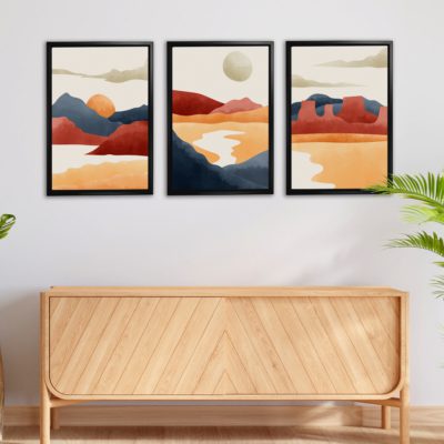 Boho Art – Sun With Mountains Boho Style Floating Canvas Minimalist Wall Art With Red and Blue Colors – Art Model No – Three Frame – bohoart-3f-17