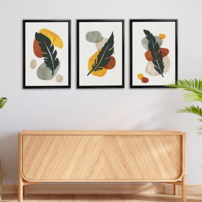 Boho Art – Tropical Leaves and Shapes Boho Minimalist Art Prints Set of 3 Bohemian Style Floating Canvas Wall Art With Yellow and Green Colors – Art Model No – Three Frame – bohoart-3f-19