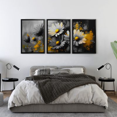 Monochrome Sunshine: Set of 3 Floating Canvas Wall Art Featuring Colorful Sunflower Paintings on Black Background – Art Model No: Three Frame – ffd7-a