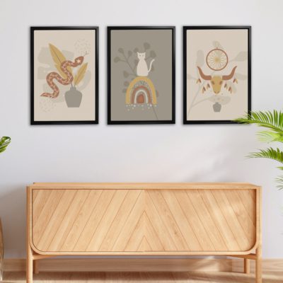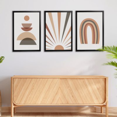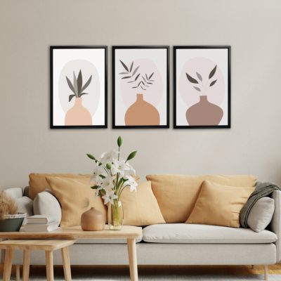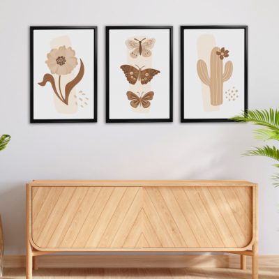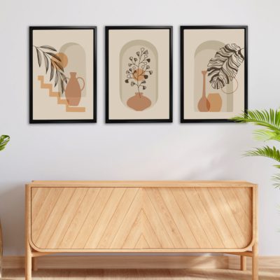 Boho Art – Botanical Boho Style Floating Canvas Minimalist Wall Art With Beige and Brown Colors – Art Model No – Three Frame – bohoart-3f-08
