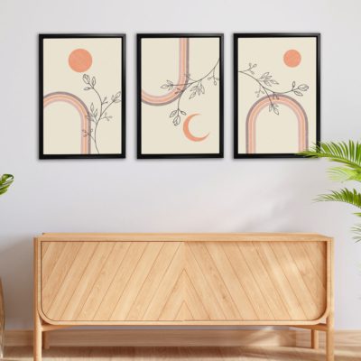 Boho Art – Sun With Plants Boho Art Prints Set of 3 Bohemian Style Floating Canvas Wall Art With Orange and Beige Colors – Art Model No – Three Frame – bohoart-3f-07