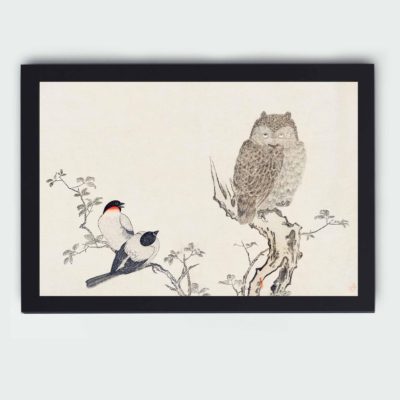 Infidu Mimizuku Uso by Utamaro Kitagawa (1753-1806), a traditional Japanese ukiyo-e style illustration of bullfinch and horned owl birds and a Japanese poem written on both sides of the pages in high resolution Vintage Art