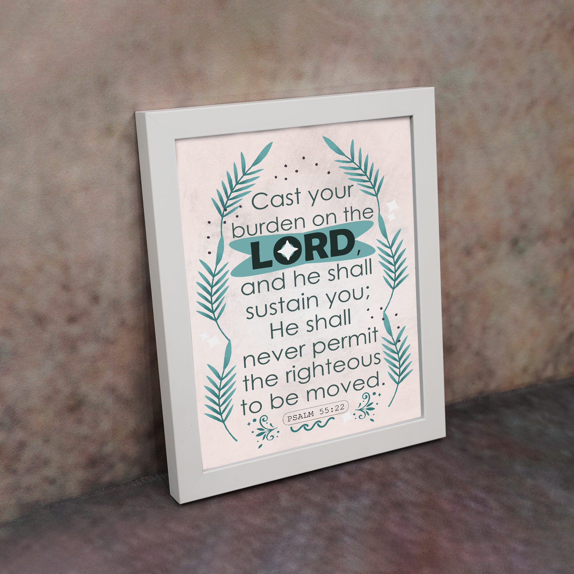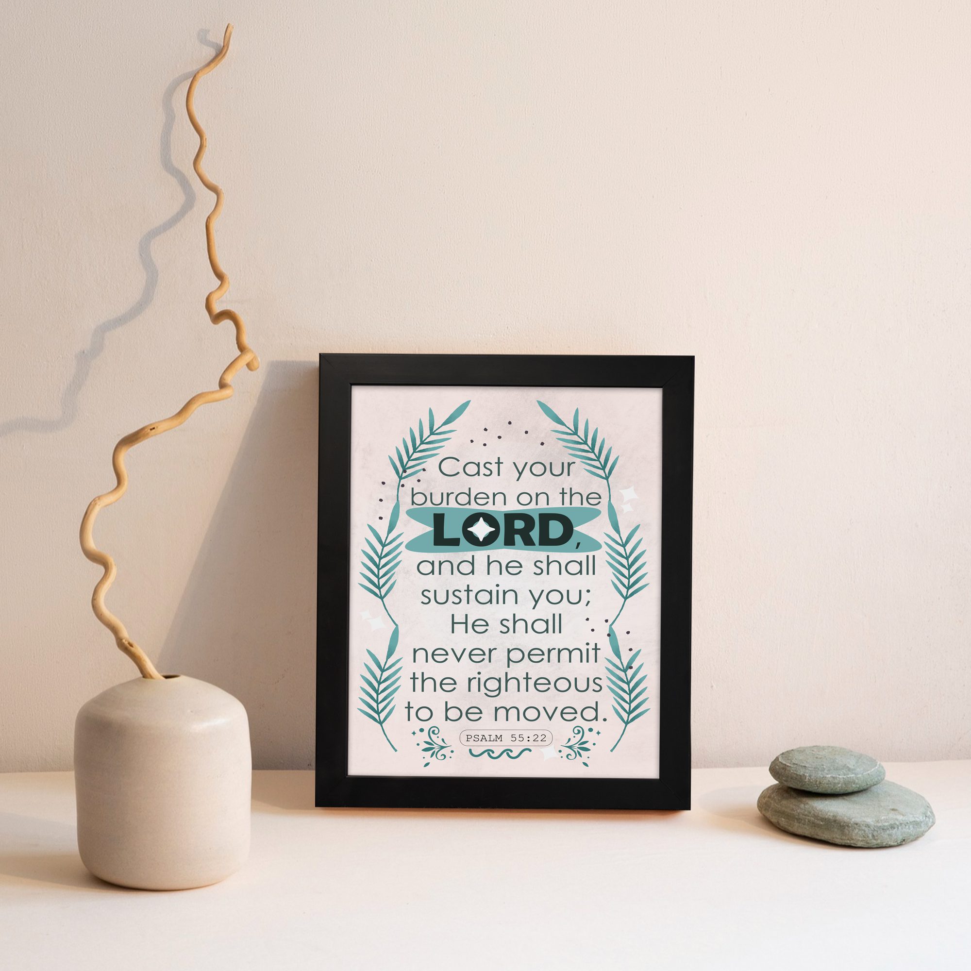 This is Psalm 55:22, which says, “Cast Your Burden On The Lord, and He Will Deliver You; He Shall Never Permit The Righteous to Be Moved.” The Christian Wall Art has a simple, clean look with a beige background and bright green text. Small dots and delicate palm leaf branches around the edges beautifully lay out the verse. When you mix modern style with botanical elements, you get a piece for your home that is both peaceful and inspiring. Skilled digital artists create this wall art, instilling a religious feel in your room. This is the best place to buy Christian wall art, Bible verse wall art, or wall decor for your home!