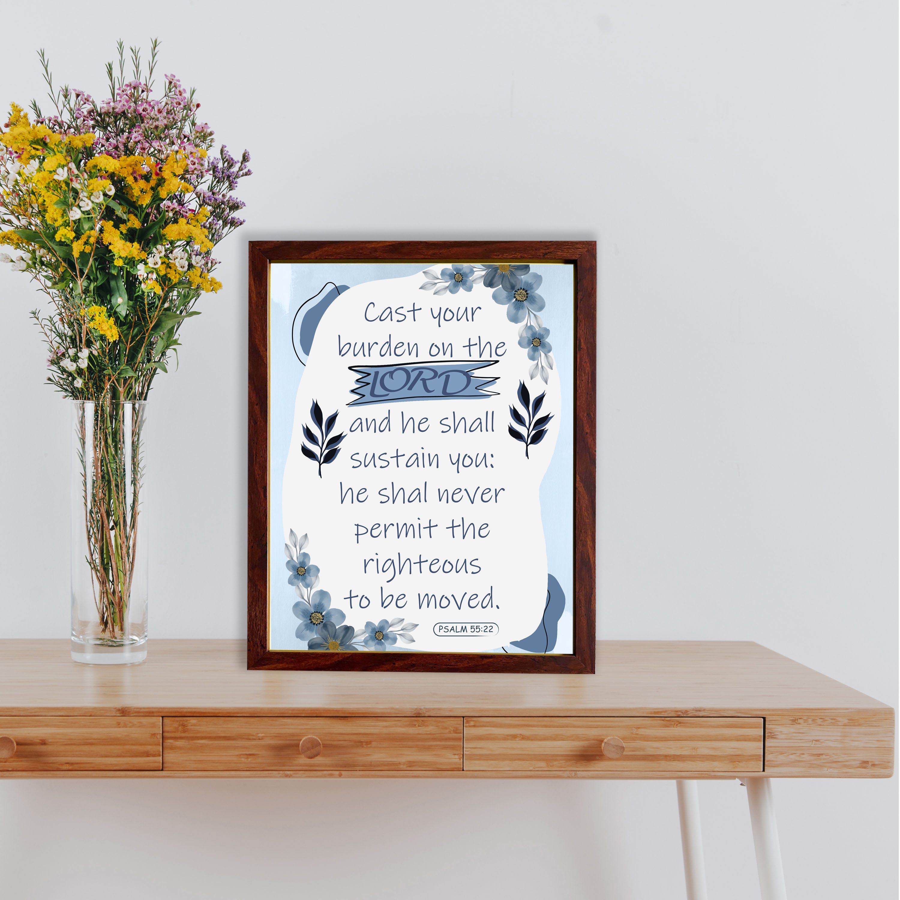 This lovely piece of Christian wall art features the encouraging verse, “Cast Your Burden On The Lord, and He Shall Sustain You; He Shall Never Permit The Righteous to Be Moved.” Psalm 55:22 asserts that He will never move the righteous. The light blue and white background makes the design feel calm. The navy blue text stands out, and the small blue flowers and leaves in the corners make it even more charming. This Bible verse wall art will look great on your wall and remind you that God is with you every day. Very skilled digital artists have created this outstanding product. This product is ideal for those seeking to purchase Bible verse wall art that will infuse their home with a sense of calm and tranquility!