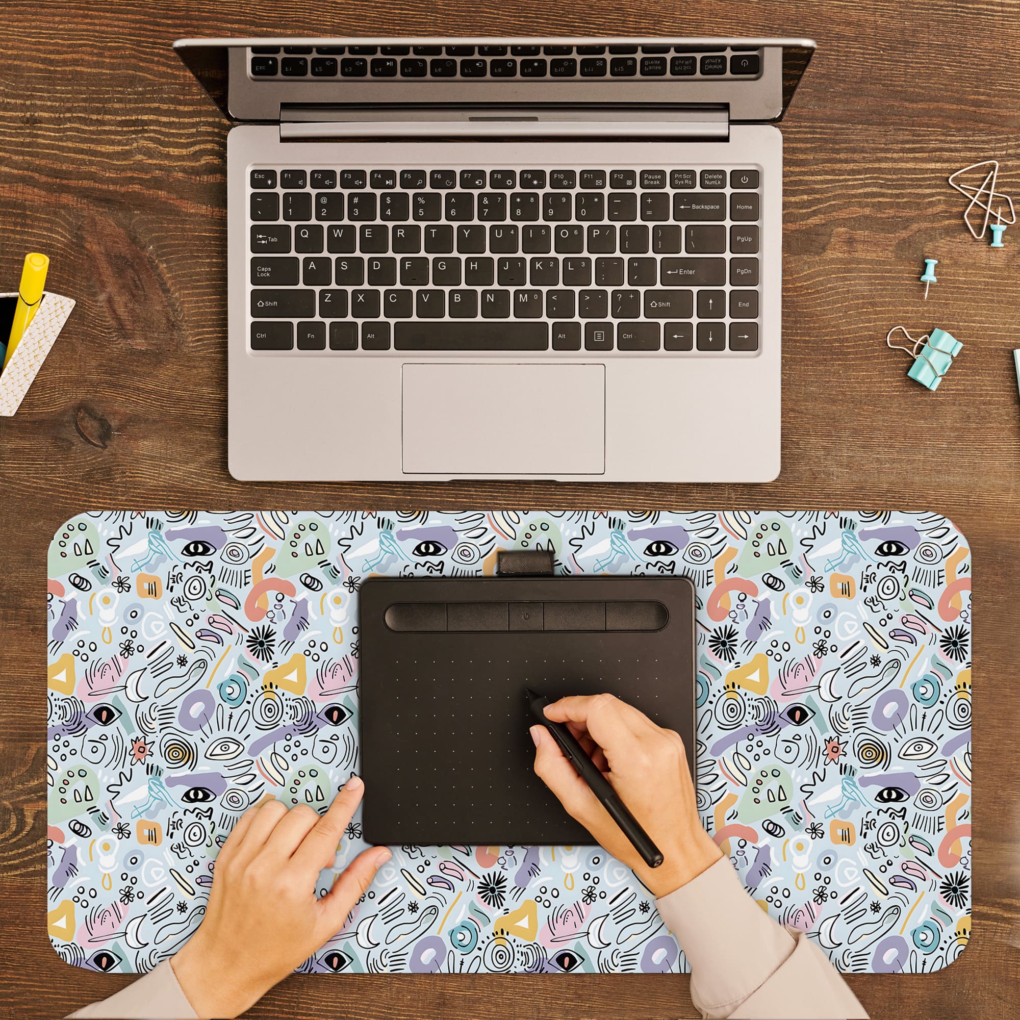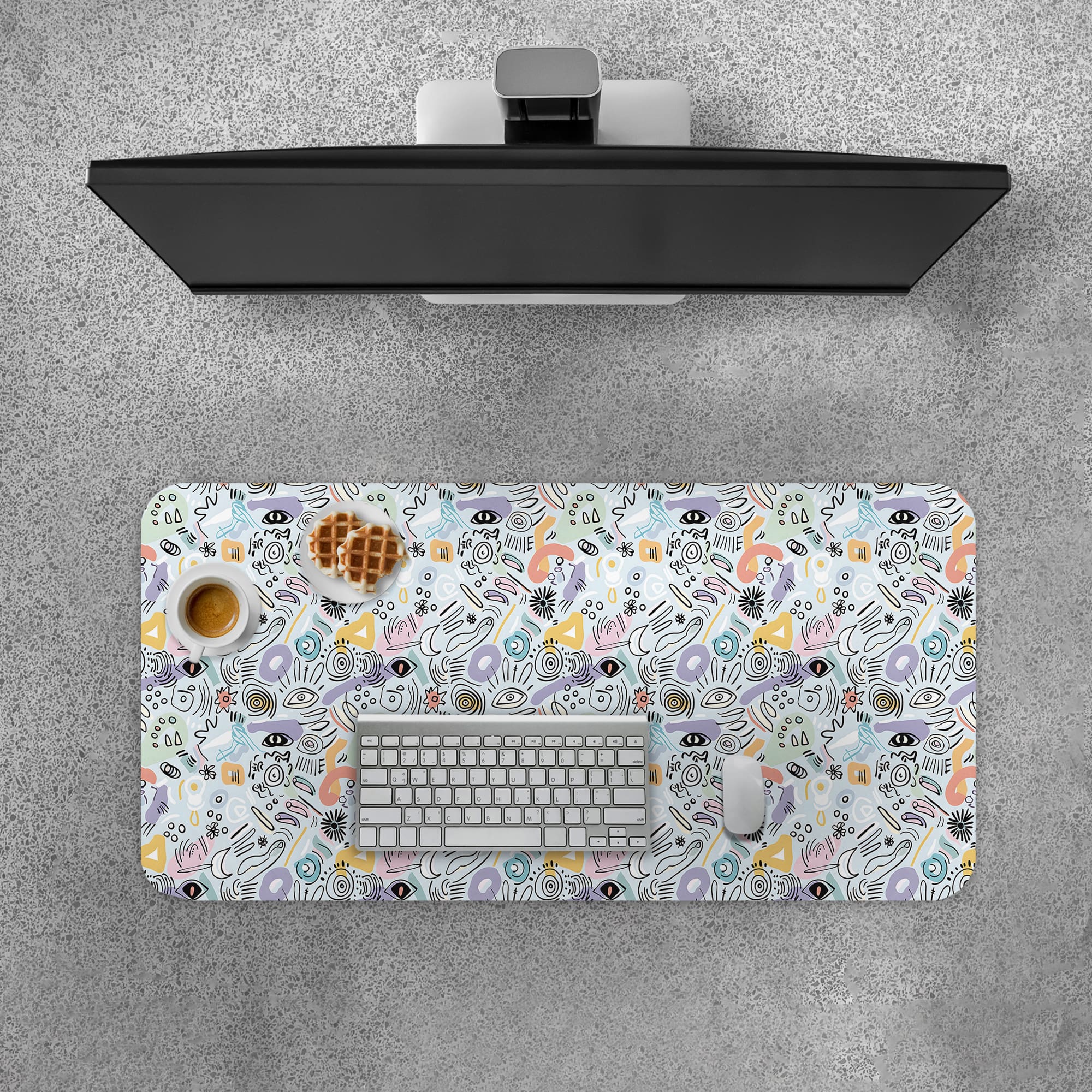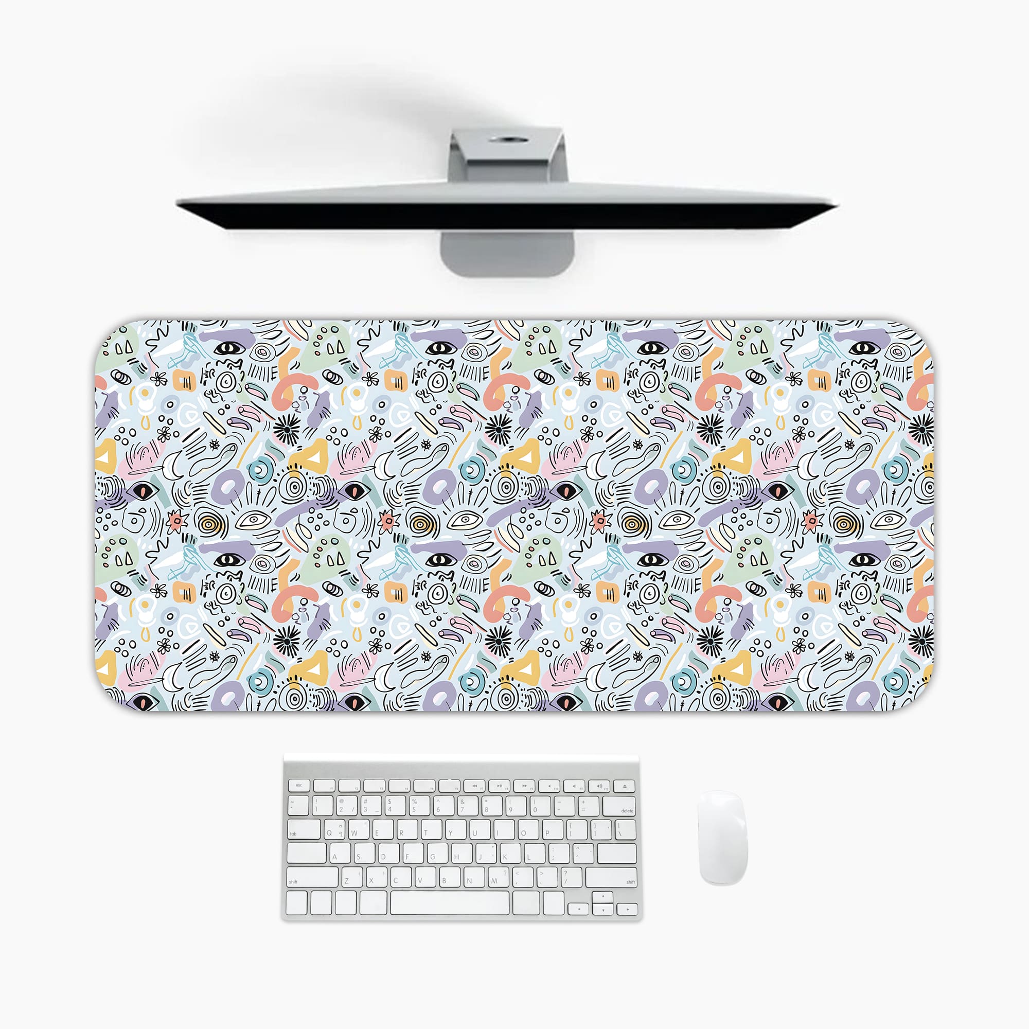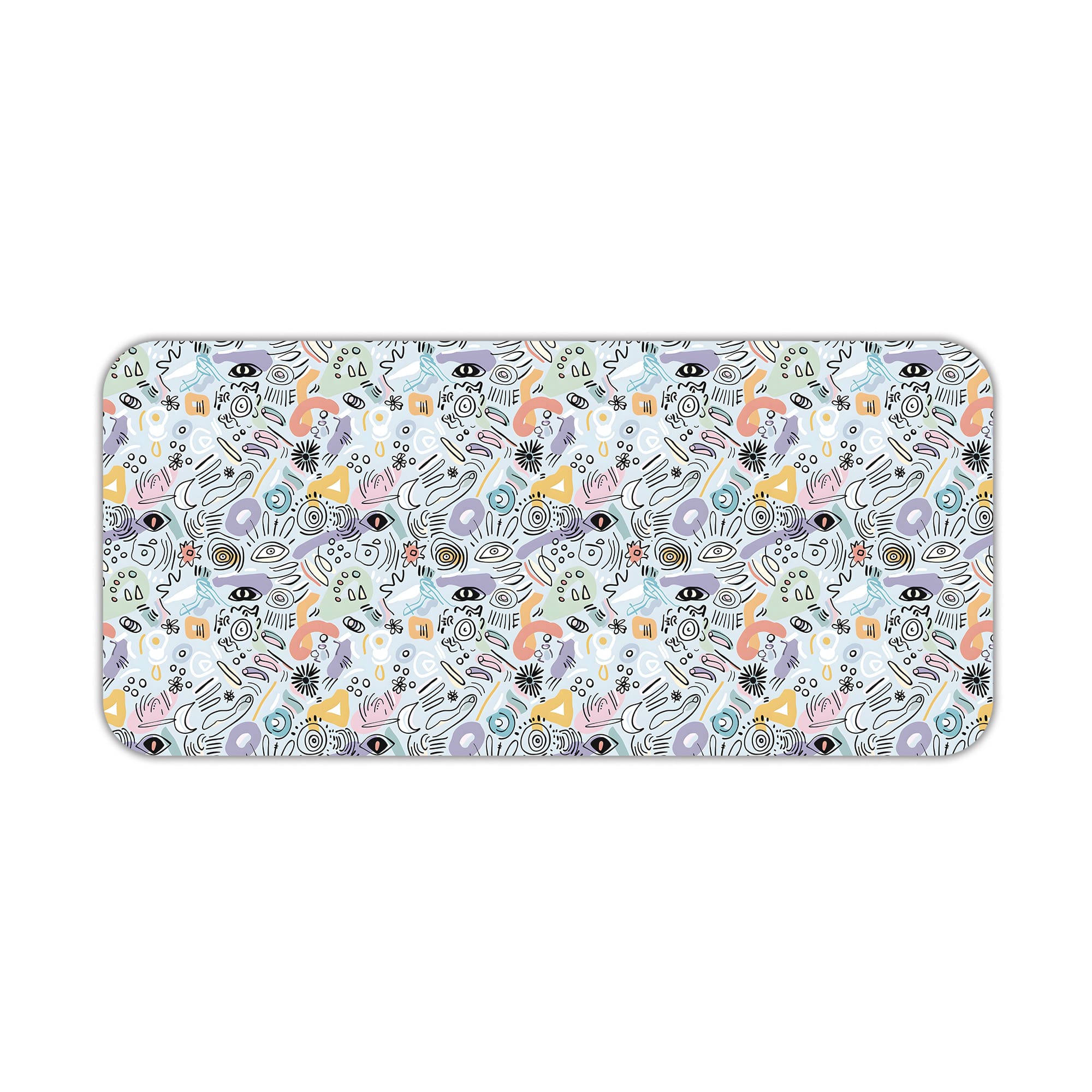 Add a creative and modern touch to your workspace with this Abstract Doodle Desk Pad. The design features a dense mix of hand-drawn icons, shapes, lines, and playful symbols in soft pastel tones, creating a lively and artistic pattern.