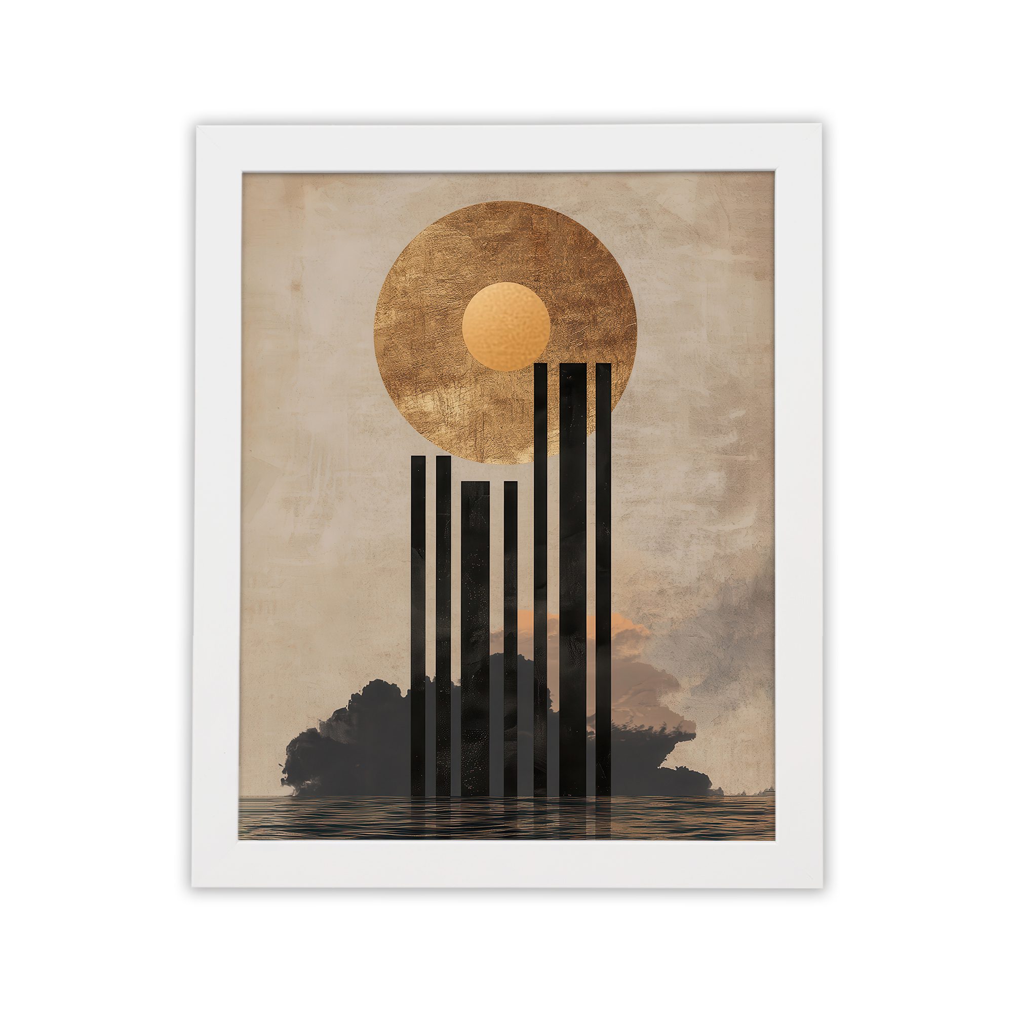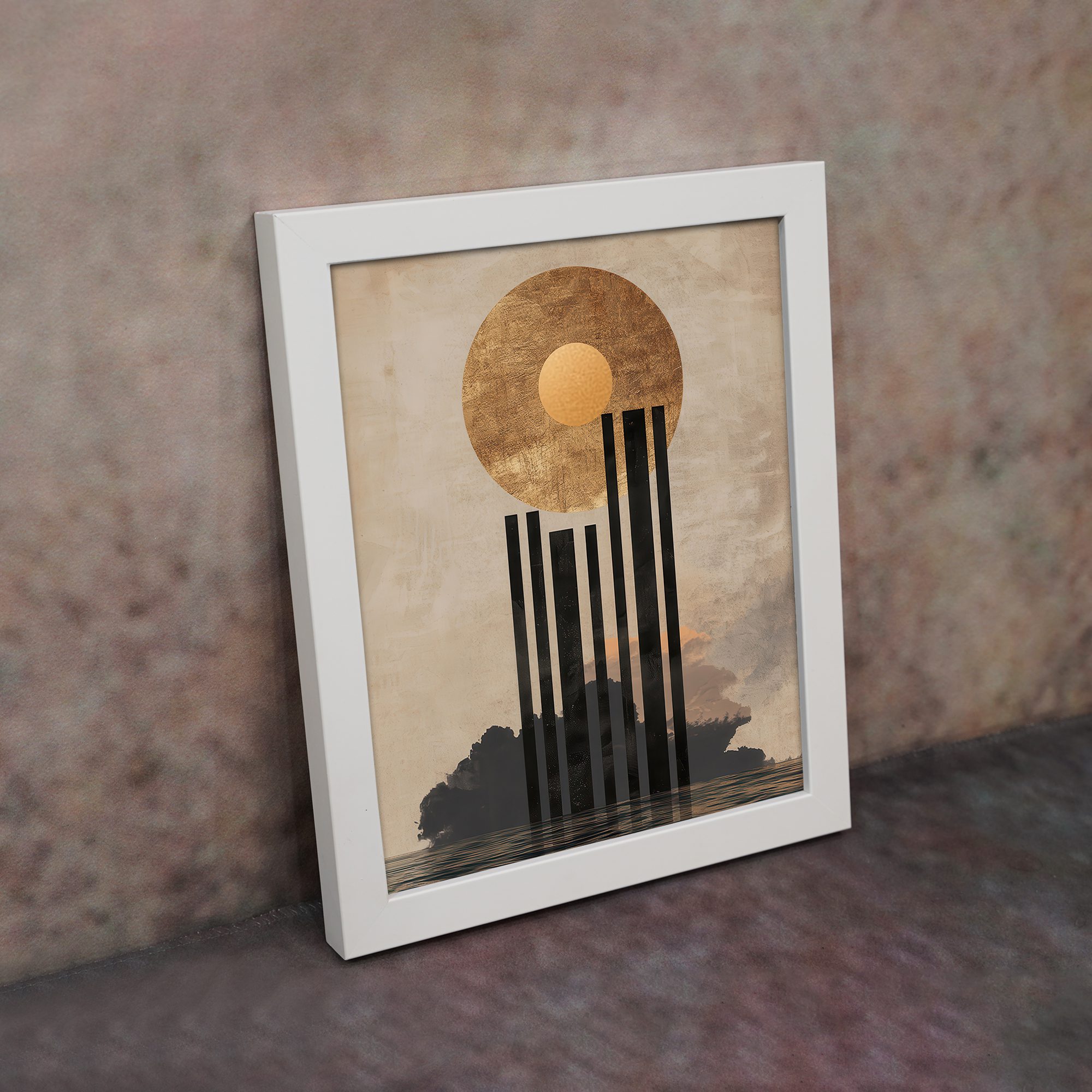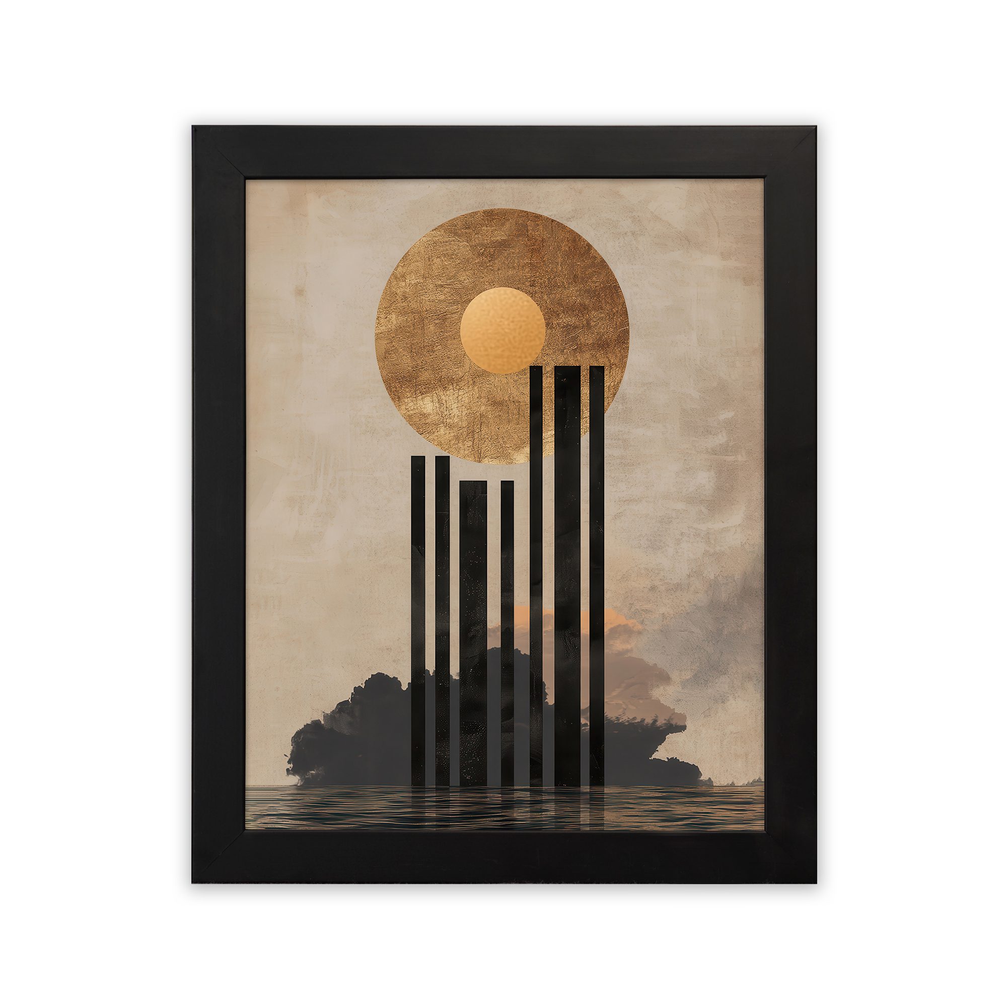 Add a bold and artistic touch to your space with this Kotart aesthetic modern wall art. This design features a large textured sun with vertical abstract lines flowing downward over a calm landscape. The mix of earthy tones and geometric elements creates a unique and modern visual appeal.