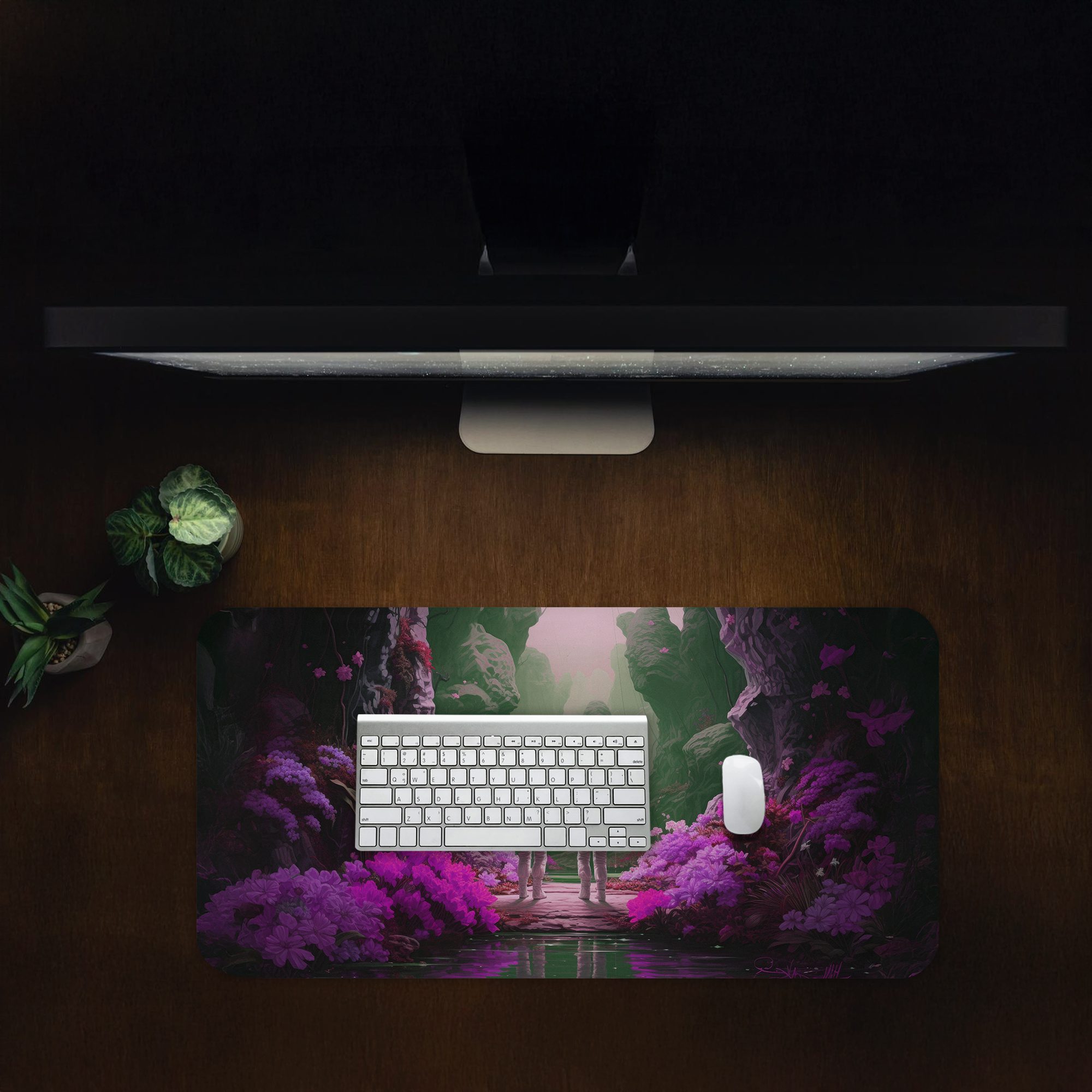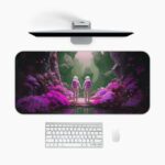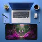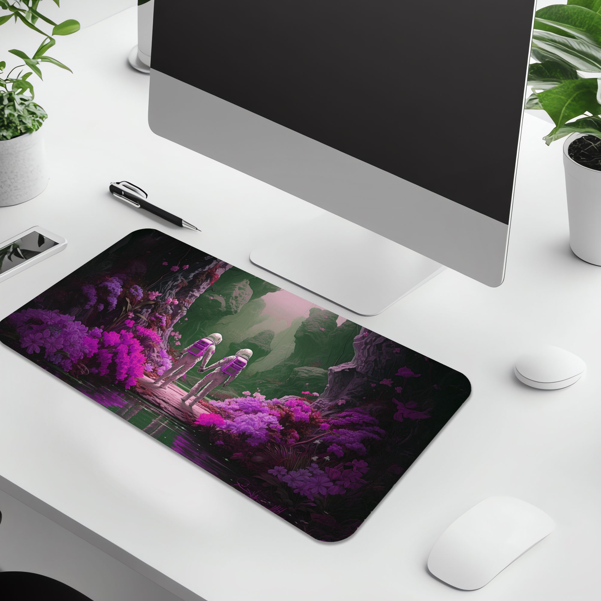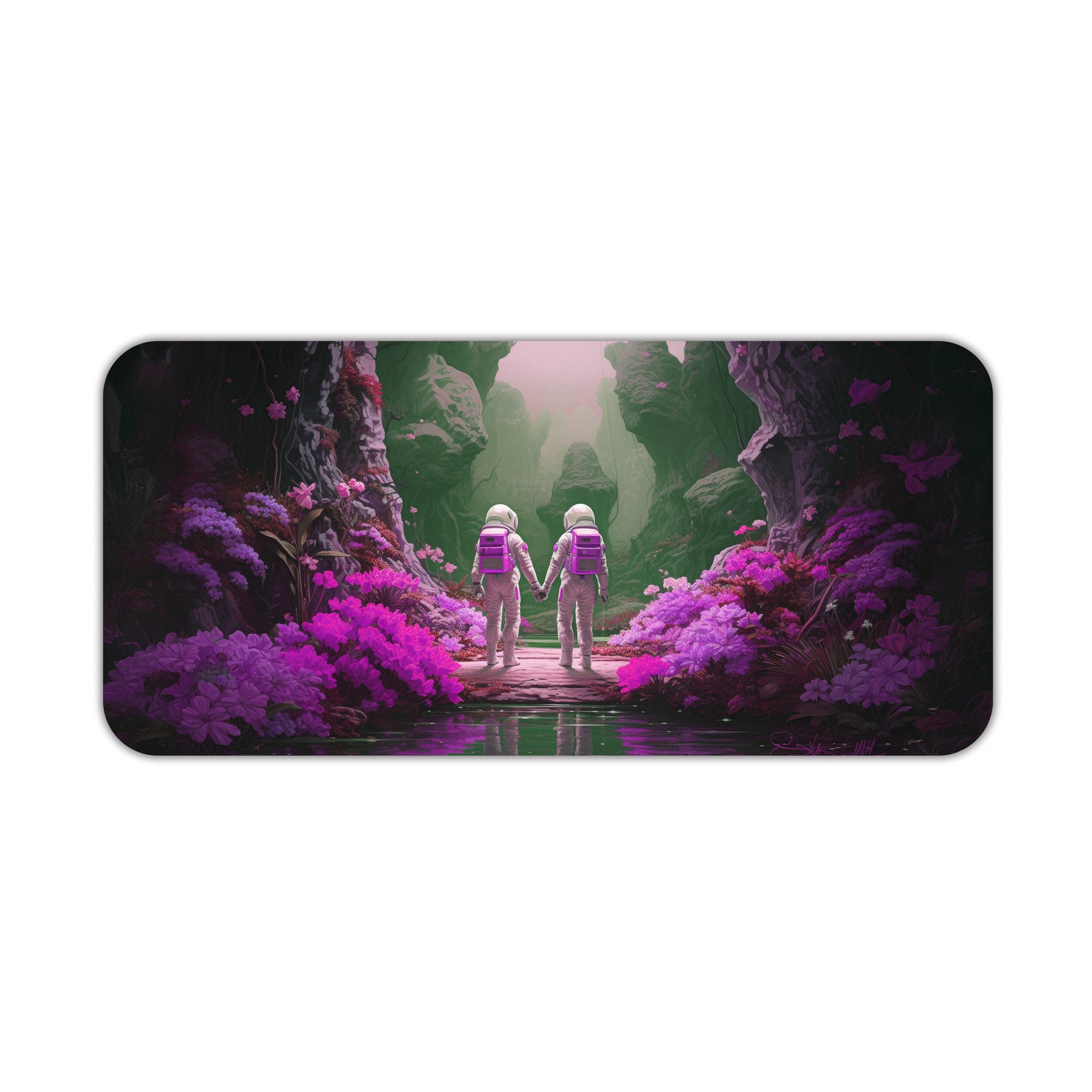 Give your workspace a dreamy and creative look with our Astronaut Fantasy Garden Desk Mat. This design shows two astronauts walking through a glowing garden filled with vibrant purple plants and soft green light. The mix of nature and space creates a unique and peaceful visual.