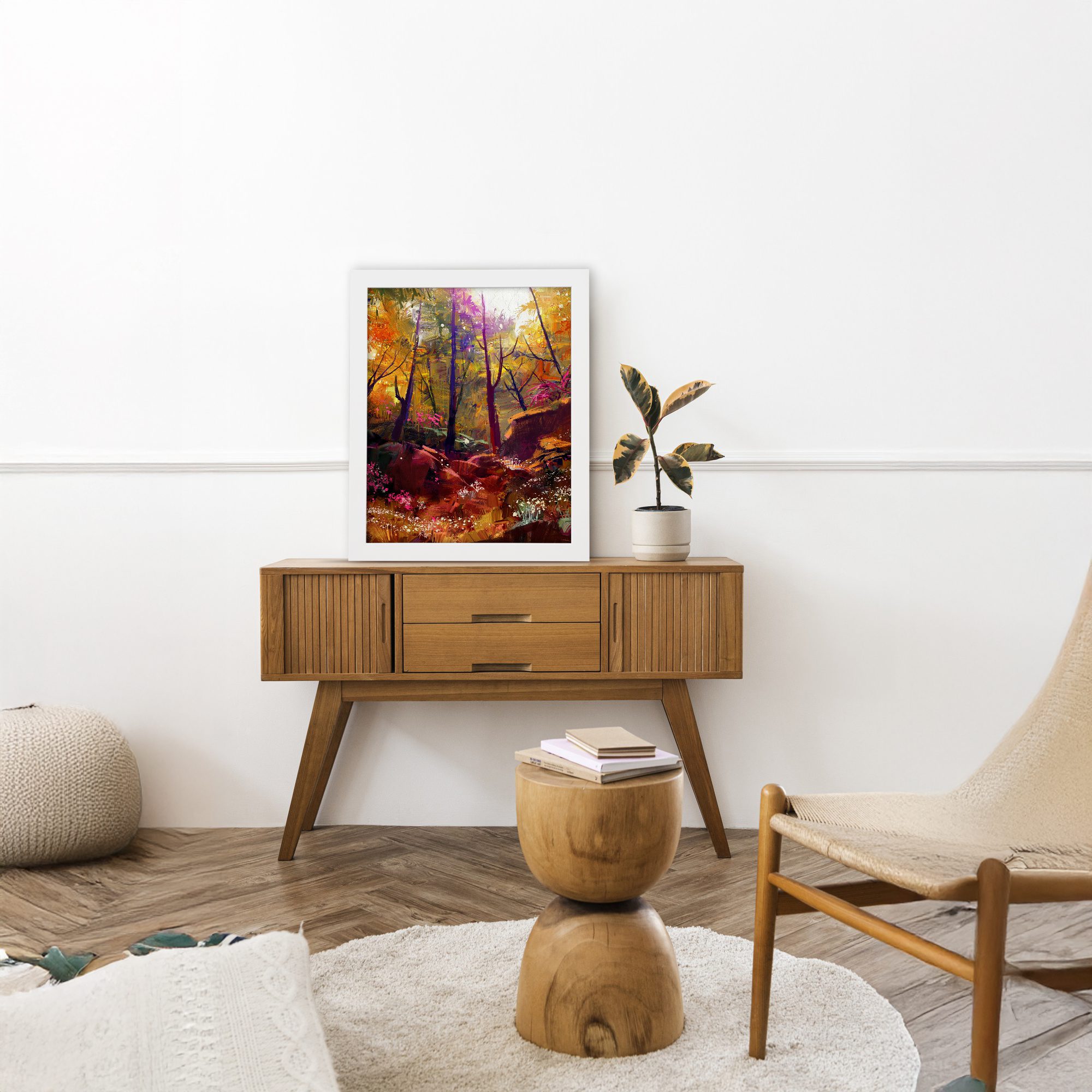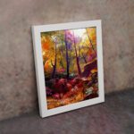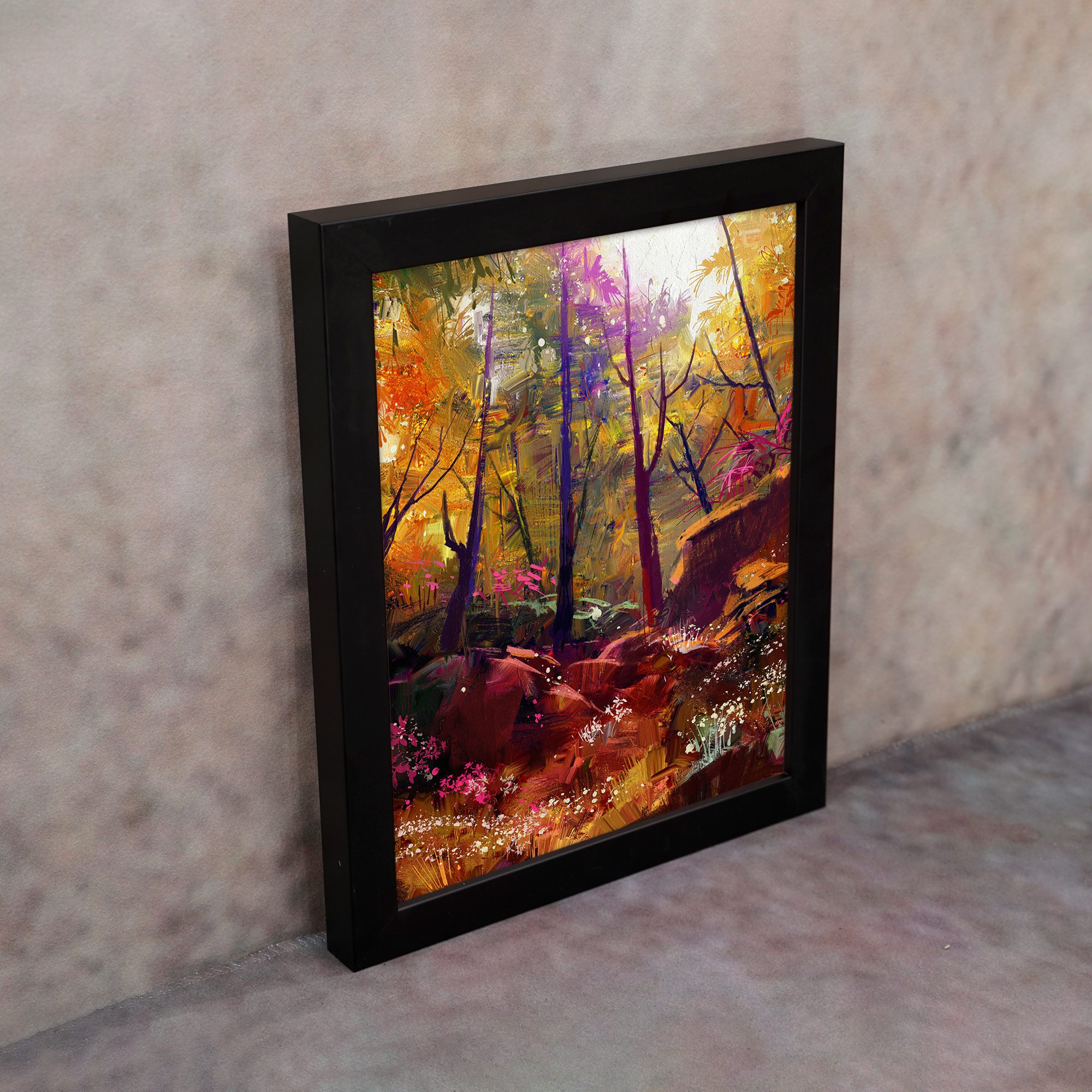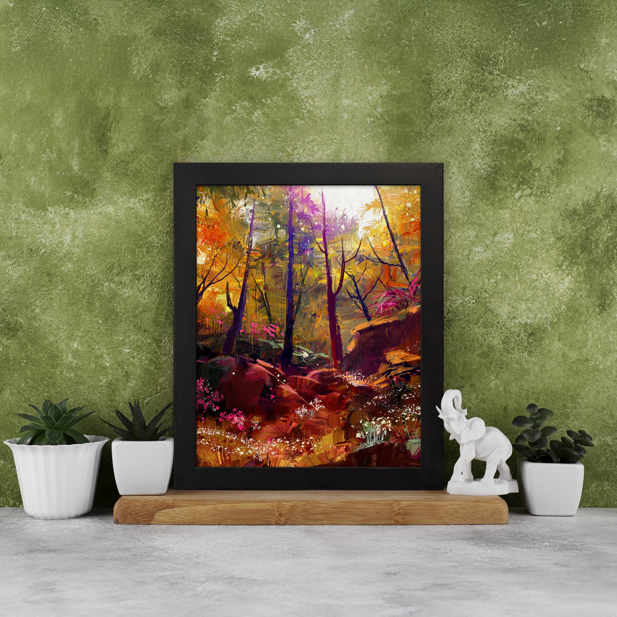 Bring rich colors and warmth into your space with this Autumn Forest Glow Wall Art. This artwork features a vibrant forest scene filled with tall trees, colorful foliage, and a glowing stream flowing through the landscape. The mix of warm autumn shades creates a cozy and lively atmosphere.