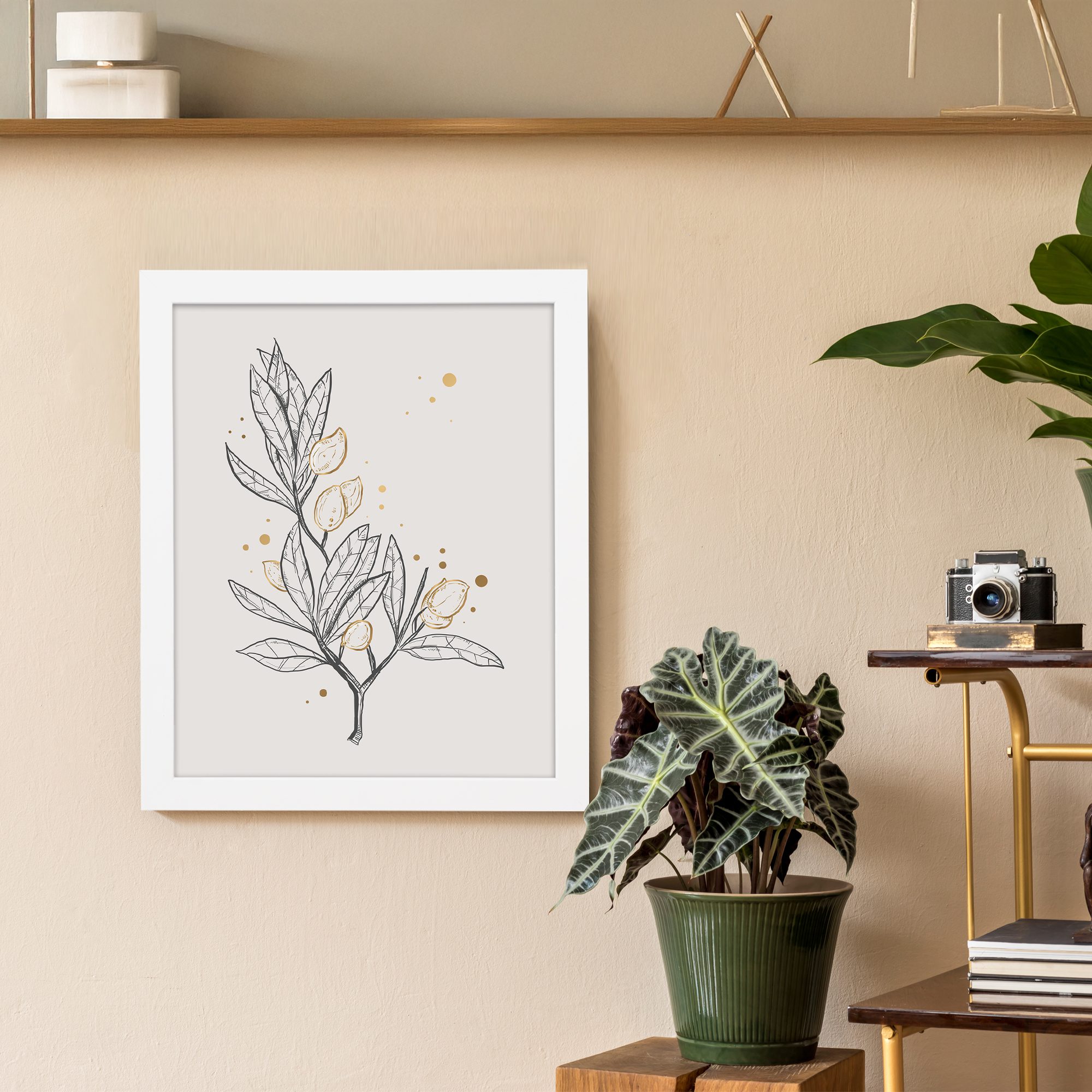 Add a stylish and modern touch to your space with our Botanical Line Art. This artwork features a detailed leaf branch design with black line work, enhanced by soft gold accents and scattered gold elements. The combination creates a unique and eye-catching look.