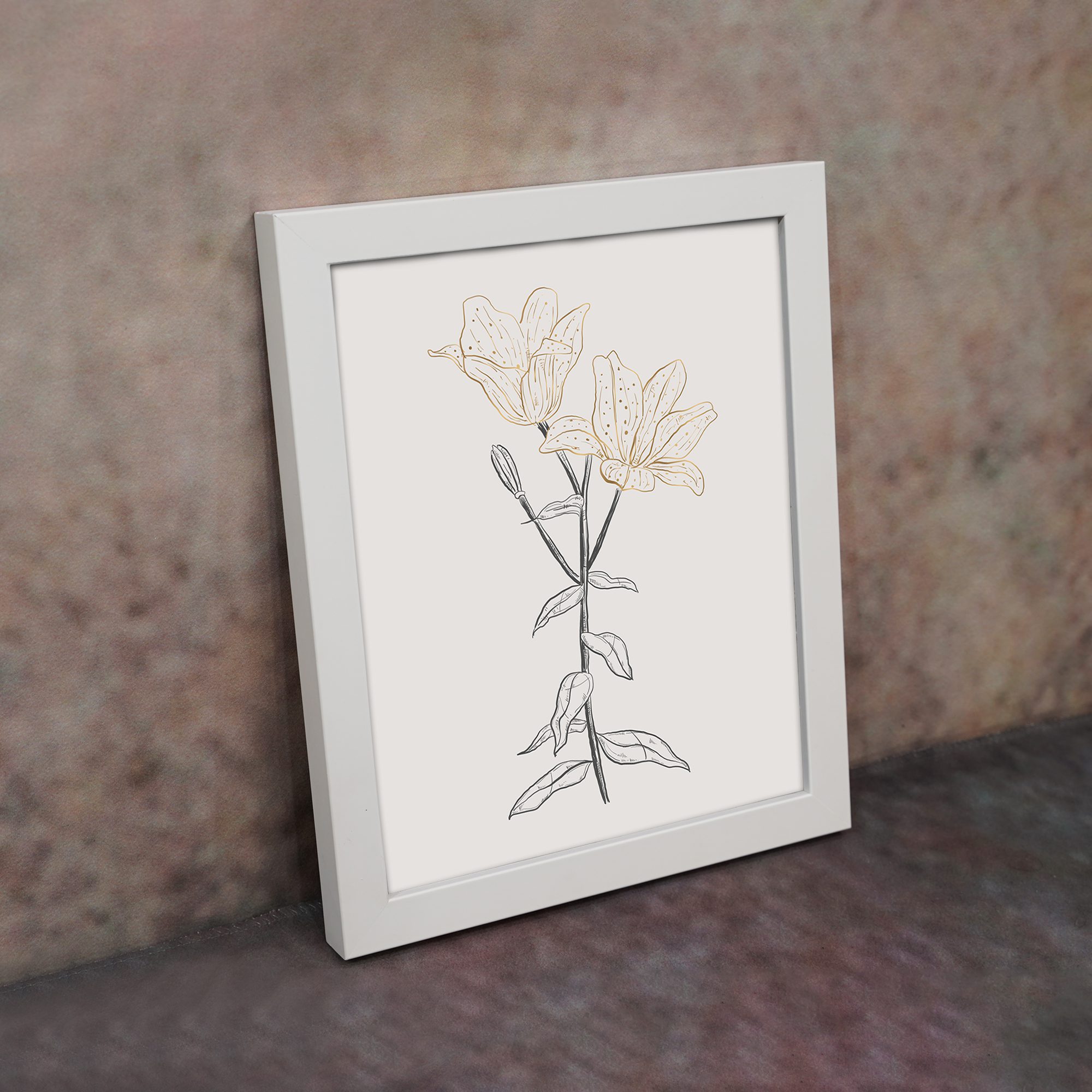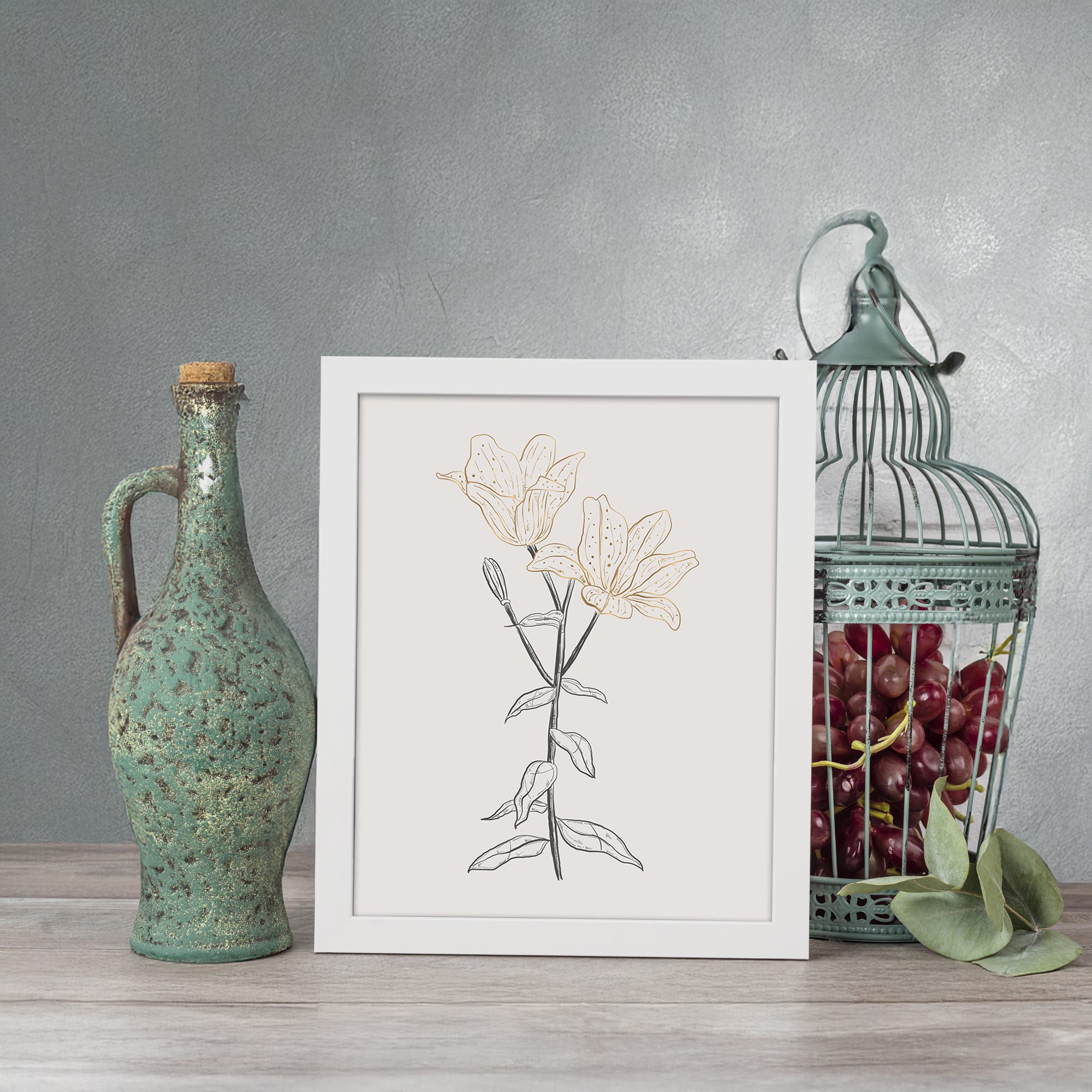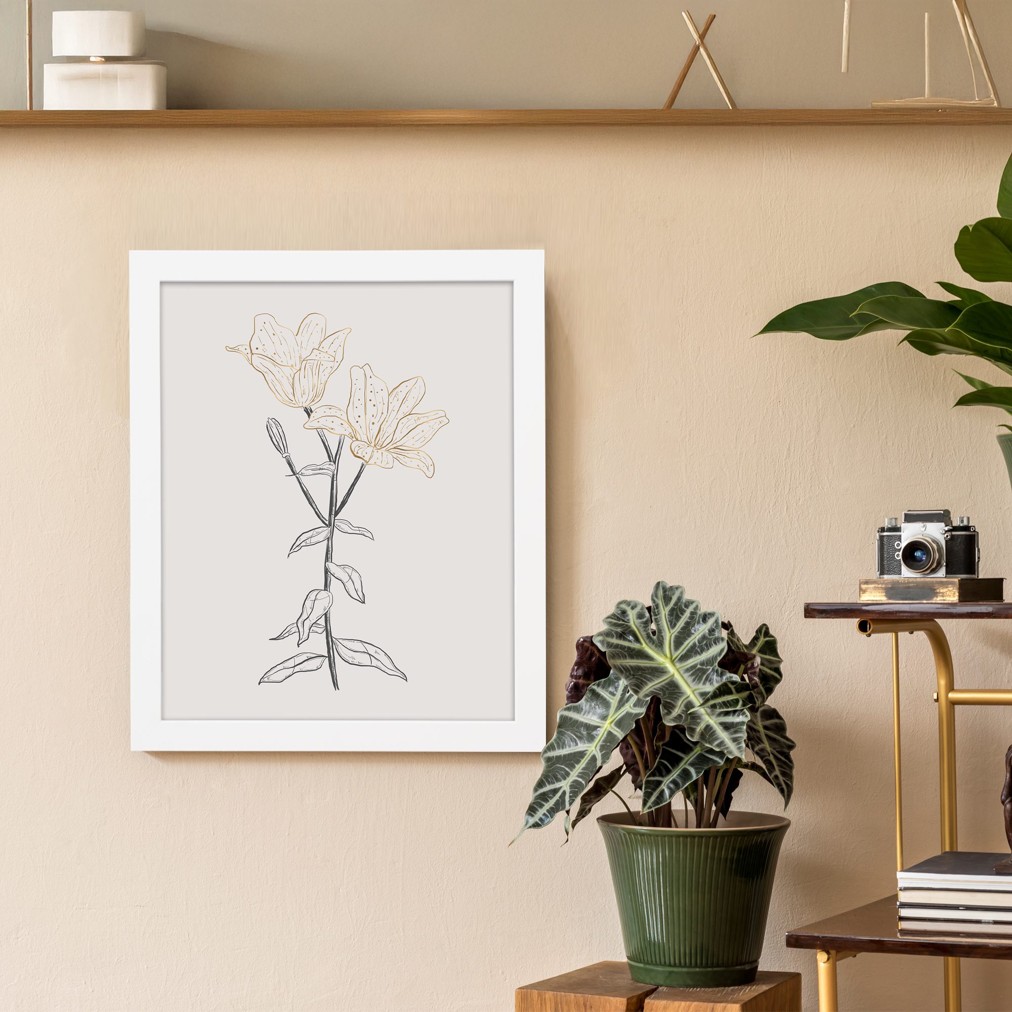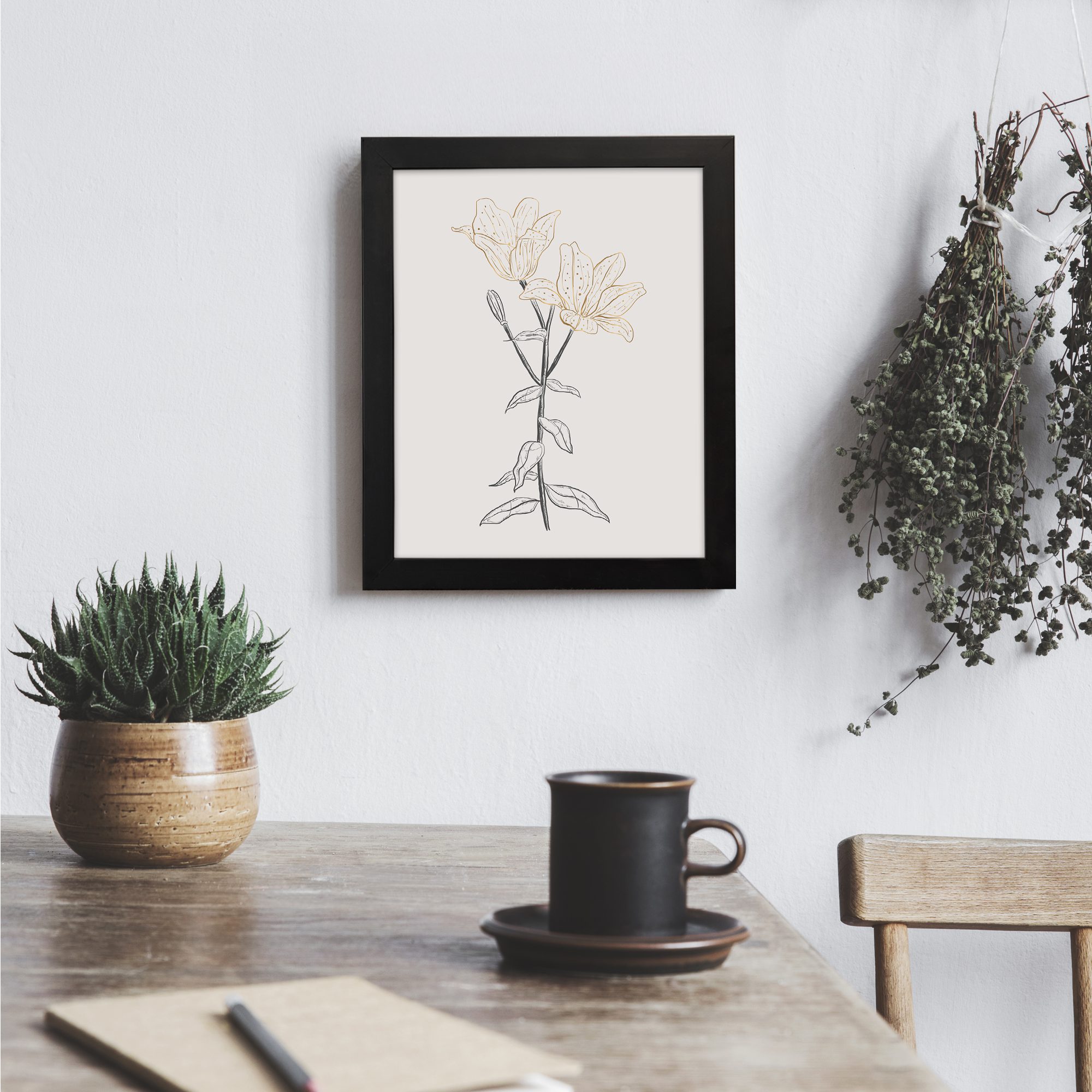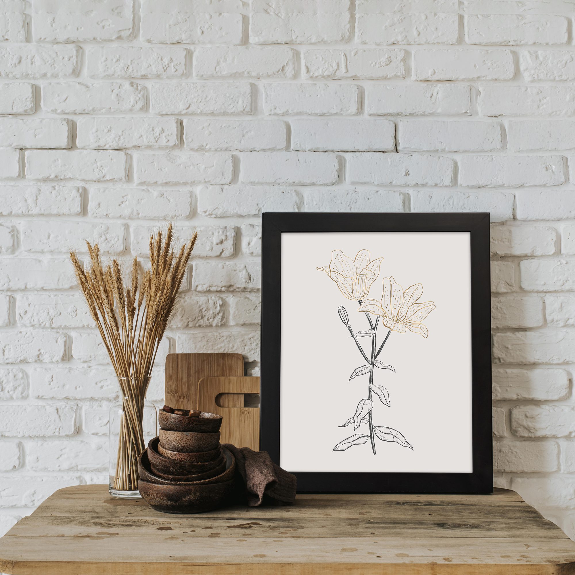 Bring a refined and graceful look to your space with our Botanical Line Art. This artwork features delicate lily flowers highlighted with soft gold detailing, combined with a clean black line stem. The dual-tone design creates a perfect balance between minimal and premium style.