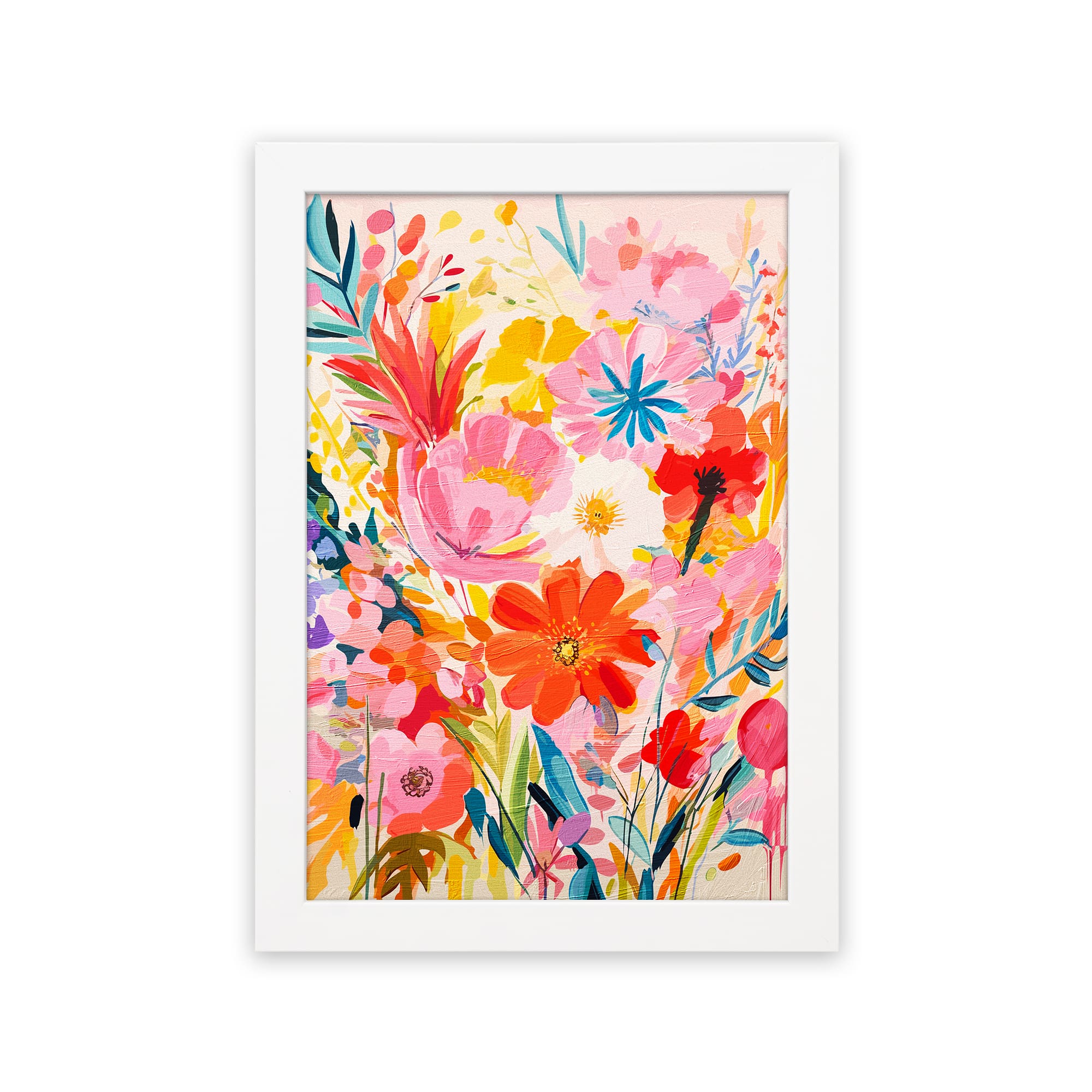 Bring a fresh and cheerful vibe to your space with this Bright Spring Floral Wall Art. This artwork features a lively mix of blooming flowers in vibrant shades of red, pink, yellow, and blue, set against a soft light background. The flowing shapes and scattered petals create a joyful and uplifting feel.