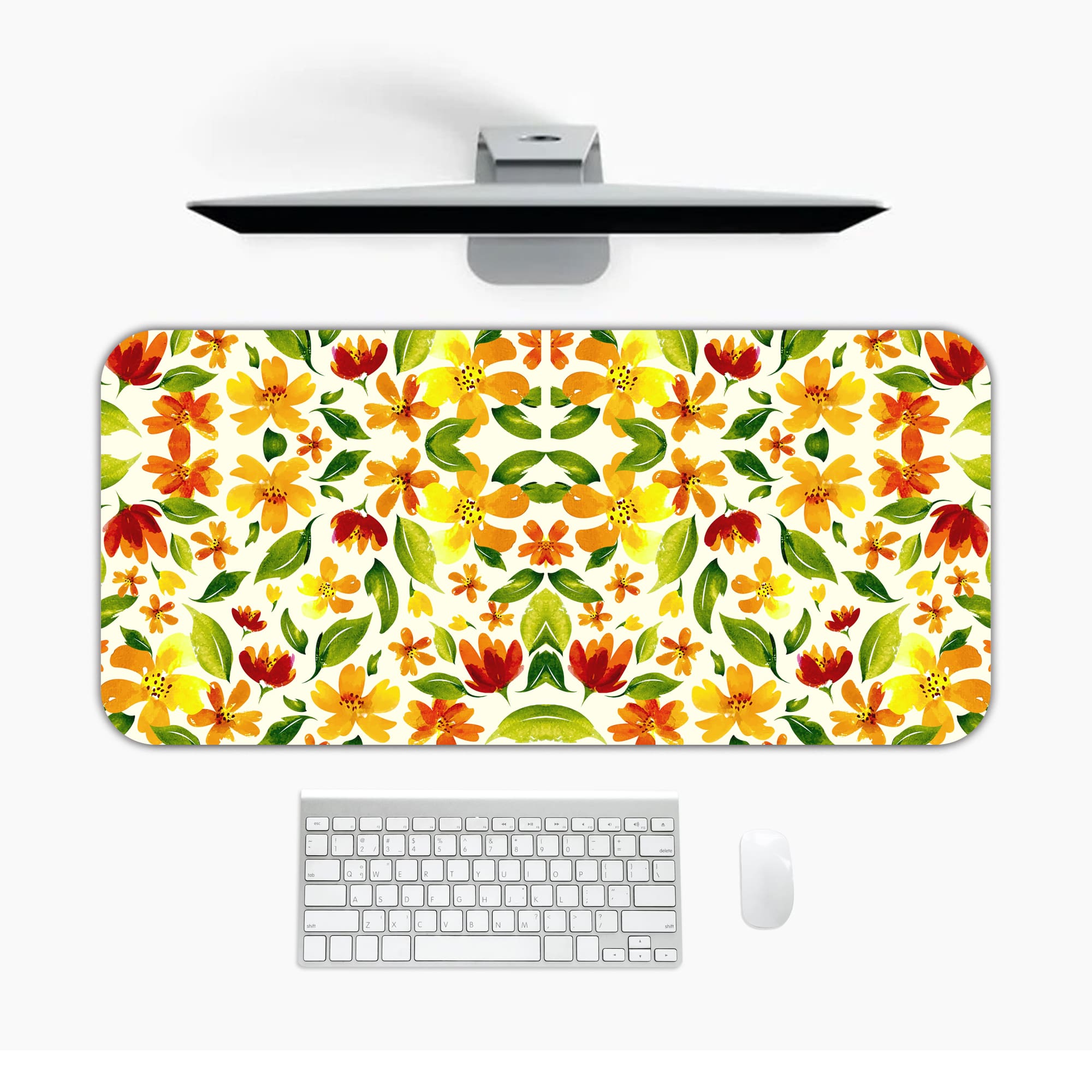 The Infidu will make your desk look better. Add some beauty to your desk with a work mat with a flower pattern. The flower pattern on this mat has an autumn theme and is made up of stylized orange, yellow, and green leaves and flowers. The background is white. The skilled digital artists who made it thought it would be fun and interesting to add to your workspace. Get a desk mat today to make your desk look more fall-like!