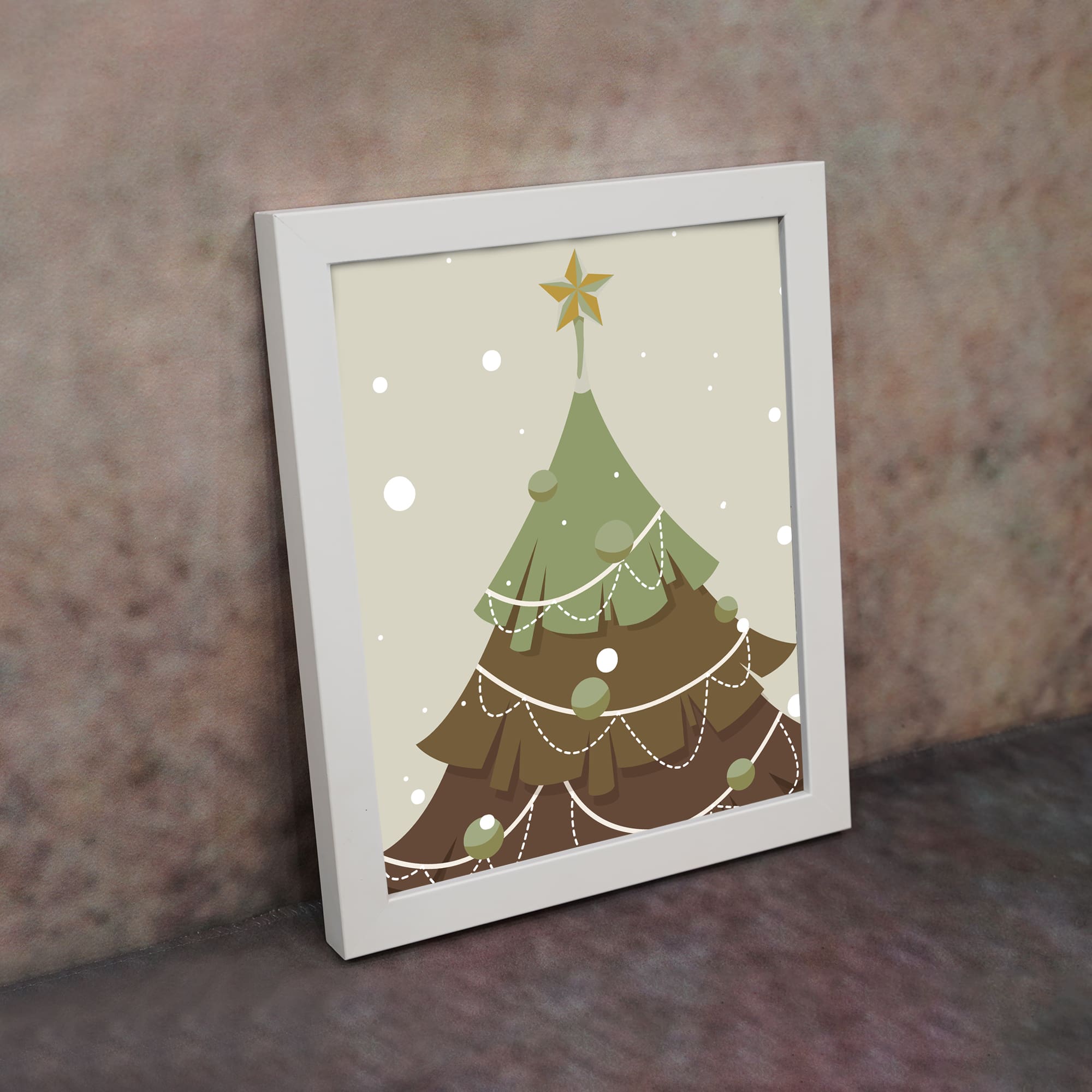Infidu Christmas Tree Art, with its pleasant and charming design, brings the warmth of the holiday season into your home. This artwork depicts a nicely decorated Christmas tree in soft light brown and green tones, adorned with white decorations and garlands that add a festive mood. The image is set on a light gray background, with gentle snowflakes falling, providing a serene and snowy atmosphere.