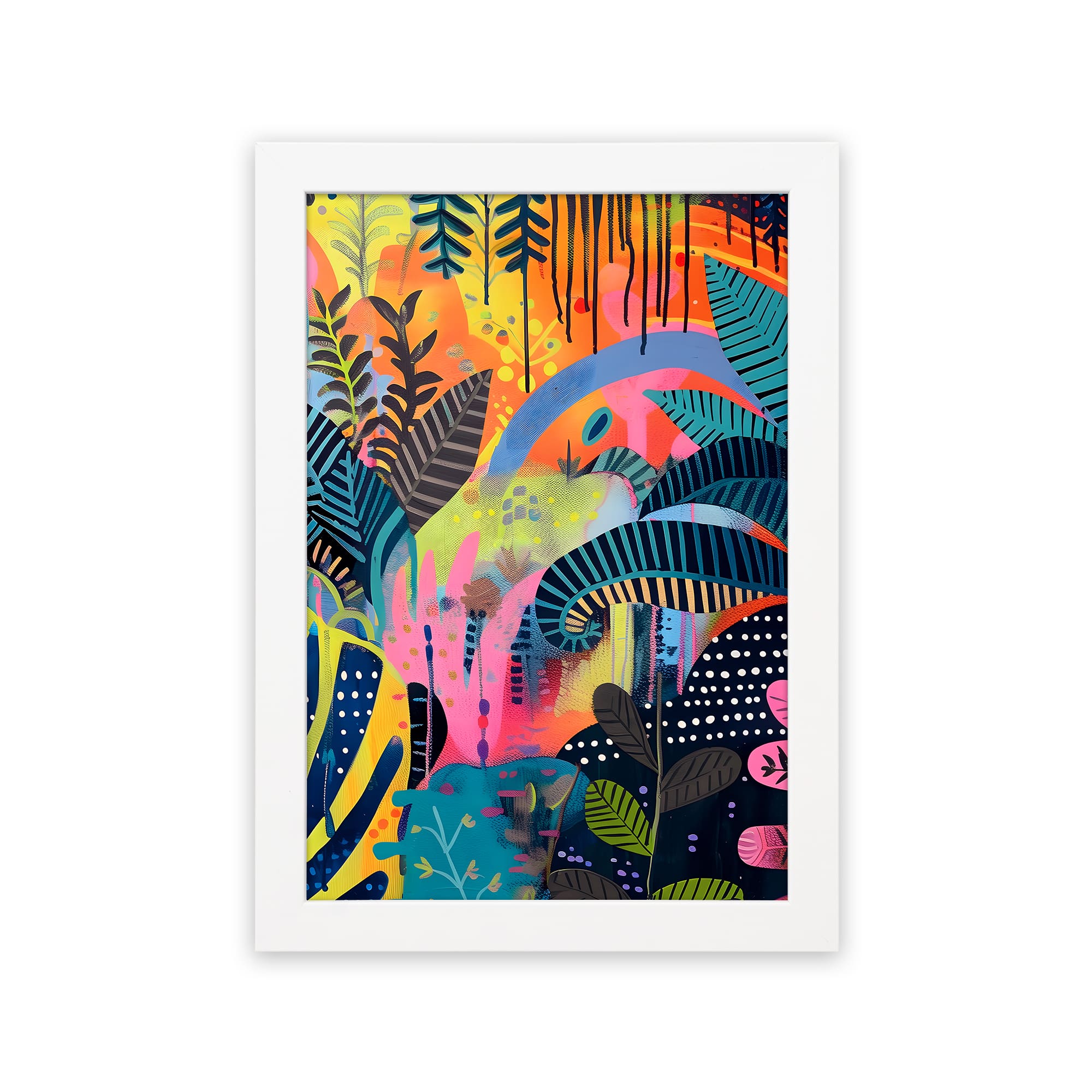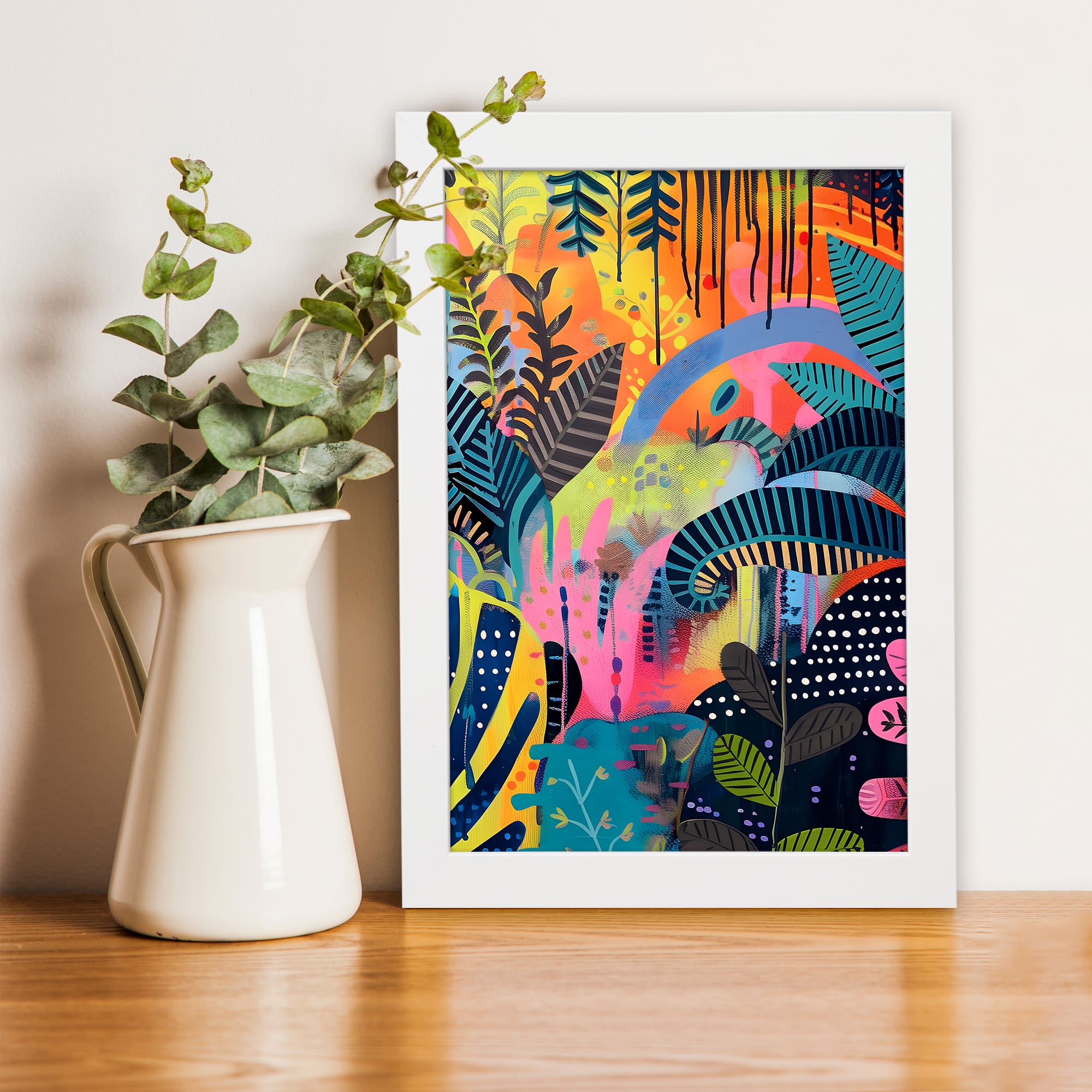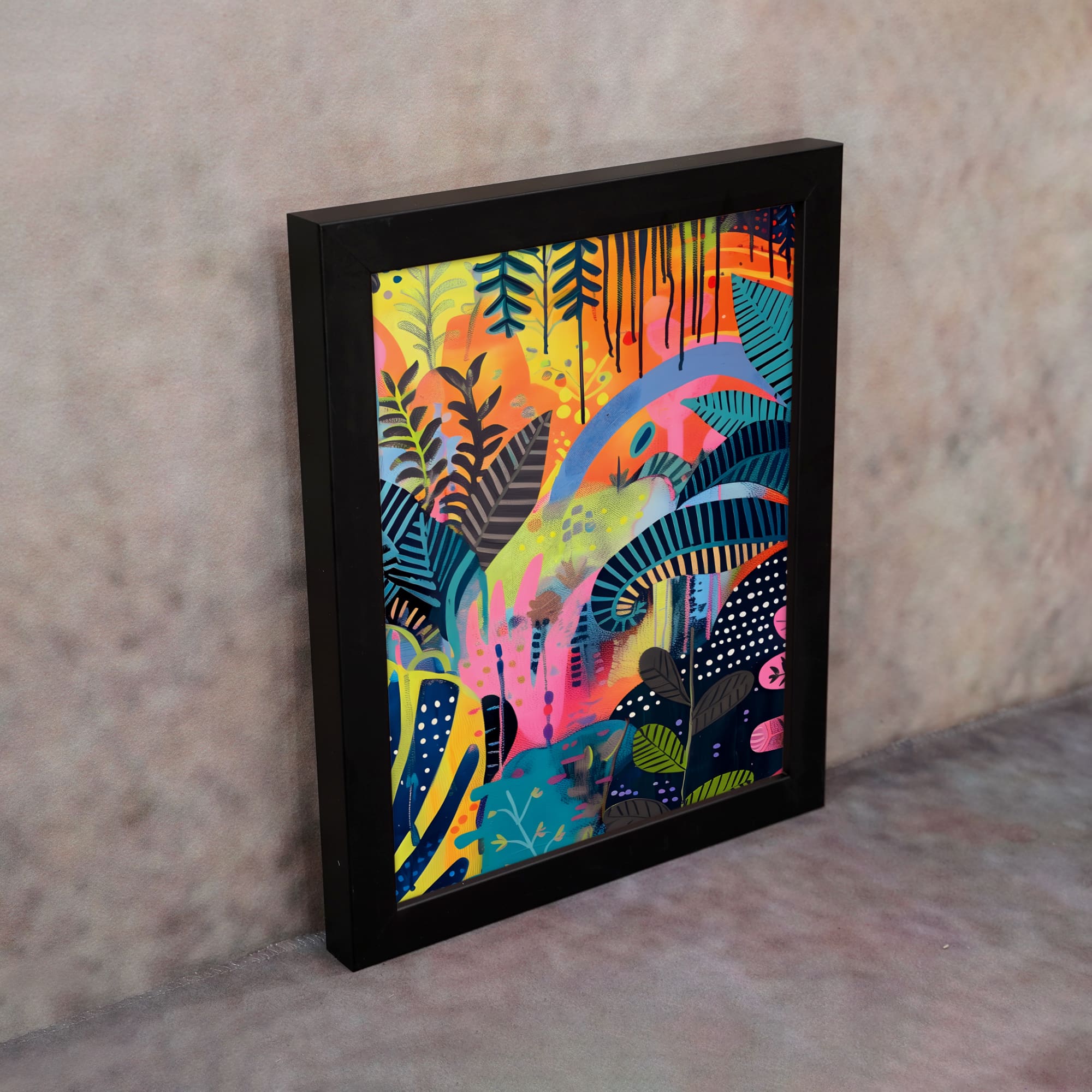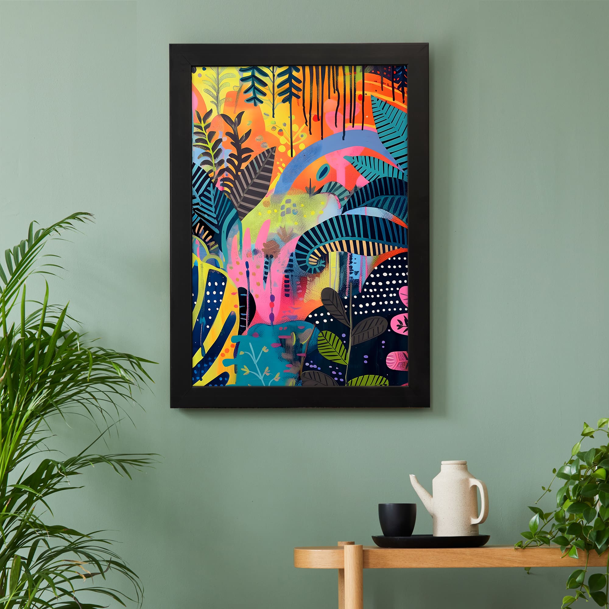Bring a tropical and artistic vibe to your space with this Colorful Floral Tropical Wall Art. This artwork features a vibrant blend of floral and leafy elements with flowing shapes and bold colors like orange, pink, blue, green, and yellow. The layered composition creates a lively and dynamic visual effect.