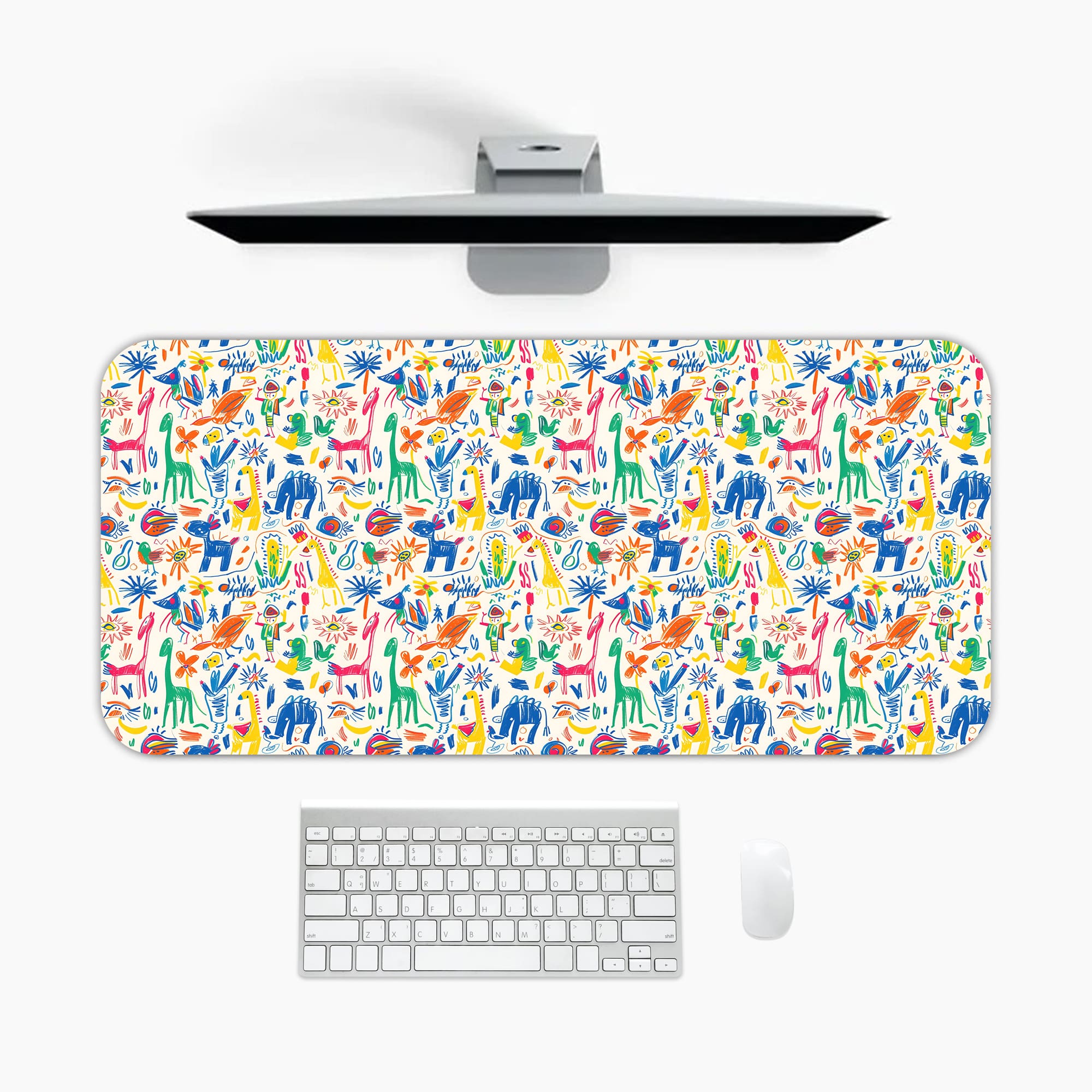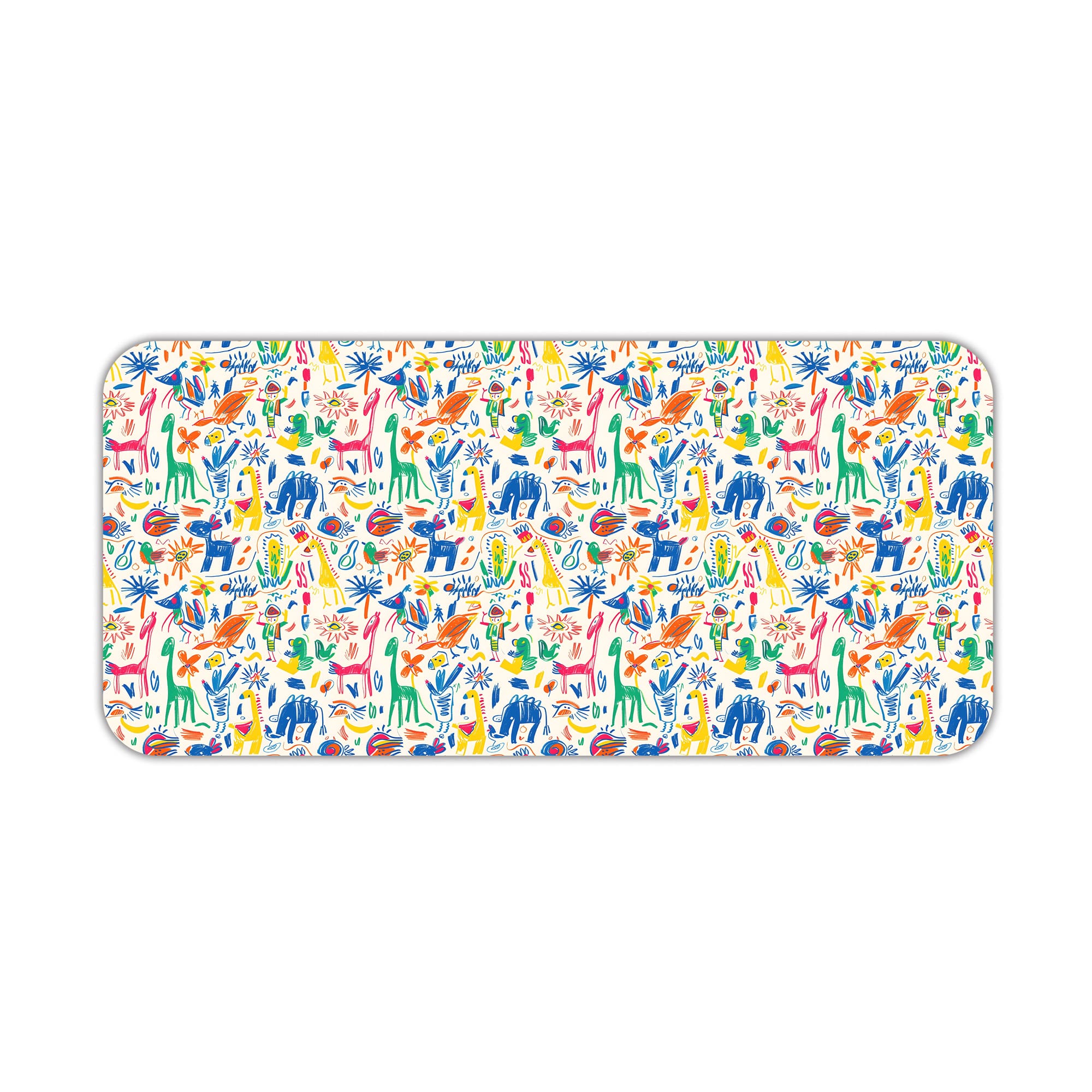 Bring energy and creativity to your workspace with this Colorful Jungle Doodle Desk Mat. The design features a lively mix of hand-drawn animals, plants, and playful elements in bright, vibrant colors, creating a fun jungle-inspired pattern.