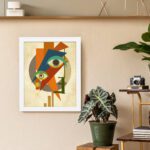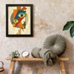 The mix of orange, green, beige, and muted tones adds contrast and depth. The layered shapes and sharp angles give the artwork a unique and expressive feel, perfect for contemporary interiors.