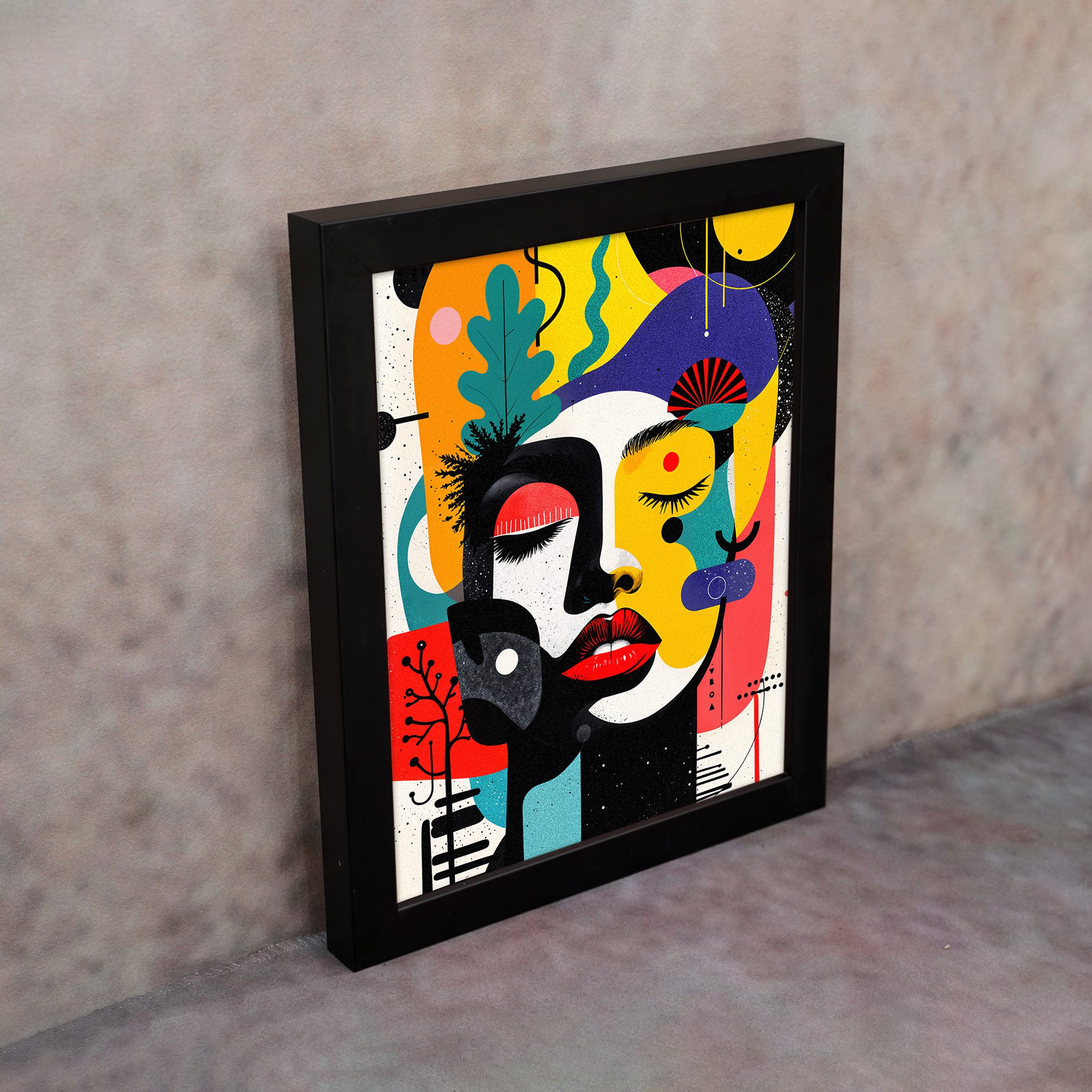 The mix of bright tones like yellow, red, blue, and black creates strong contrast and energy. The layered shapes and creative elements give the artwork a modern and expressive feel, perfect for statement interiors.