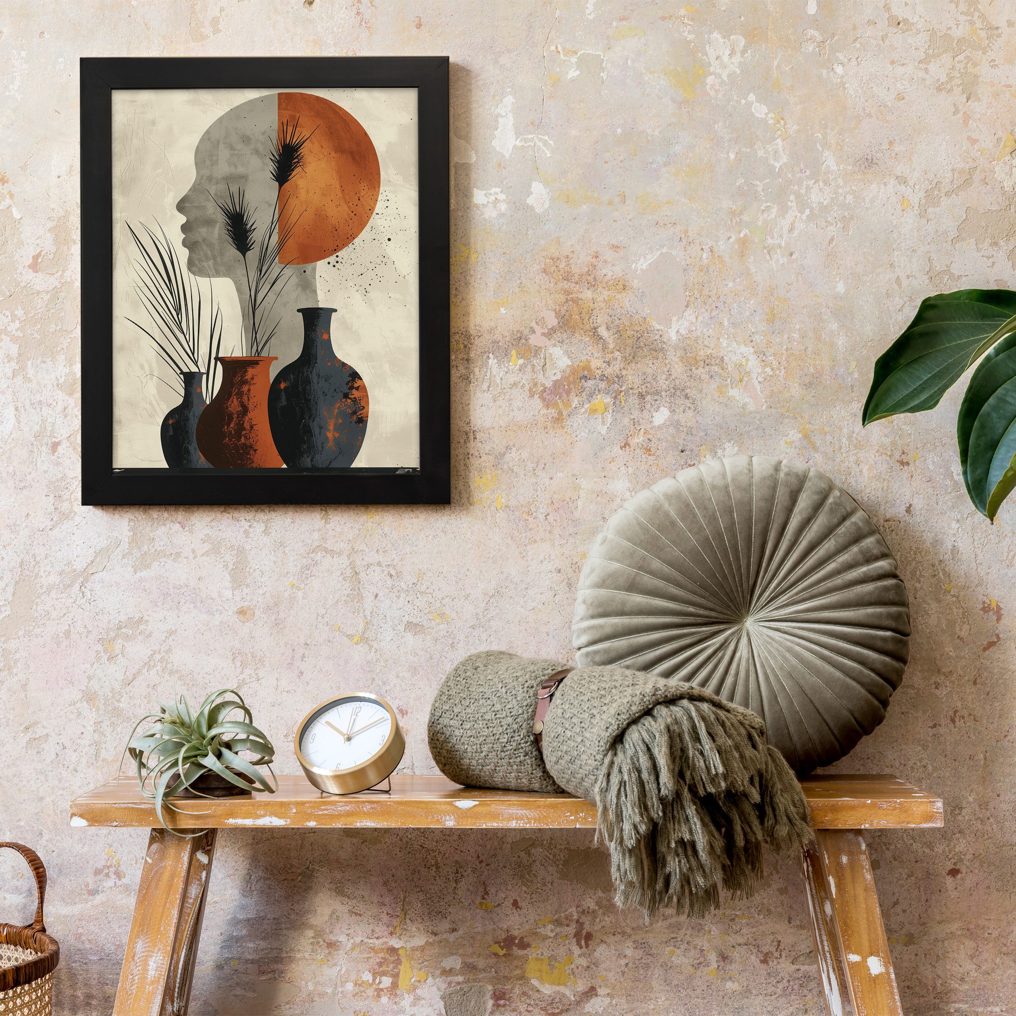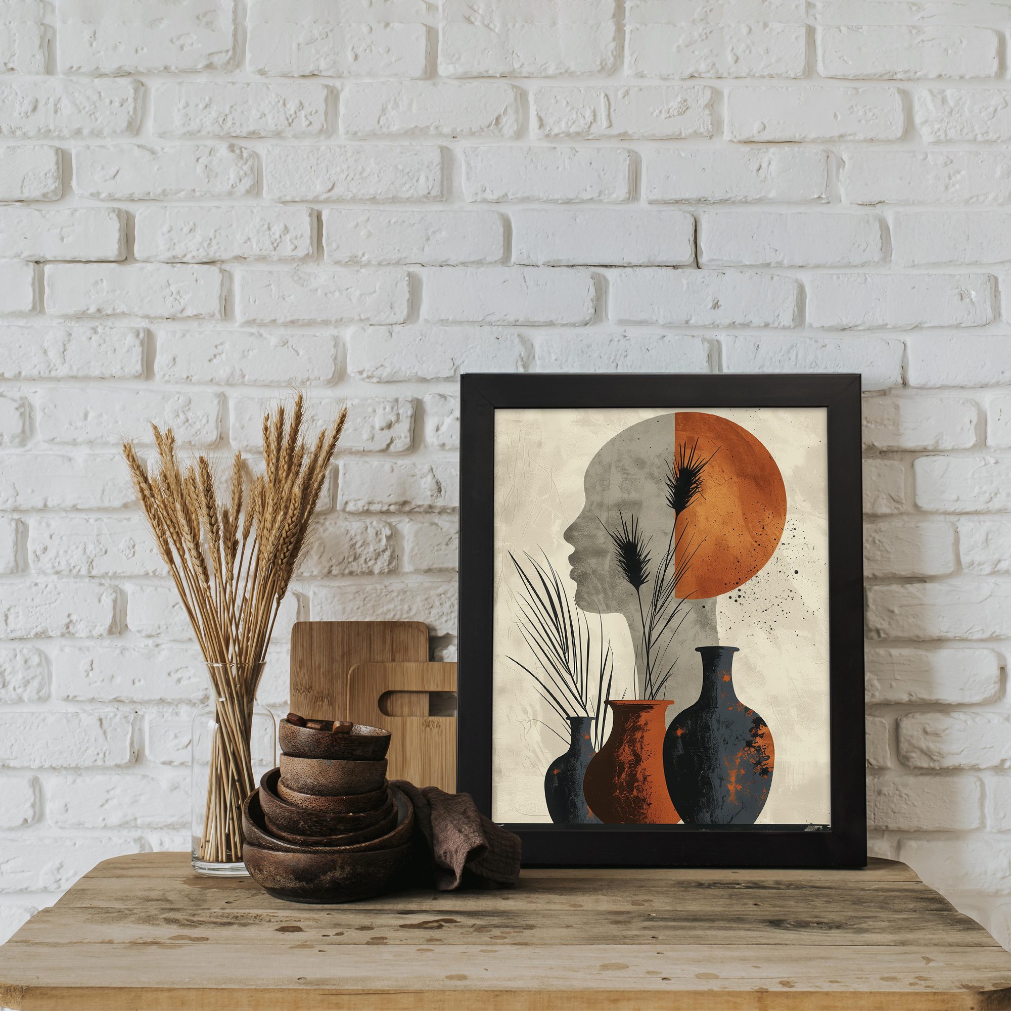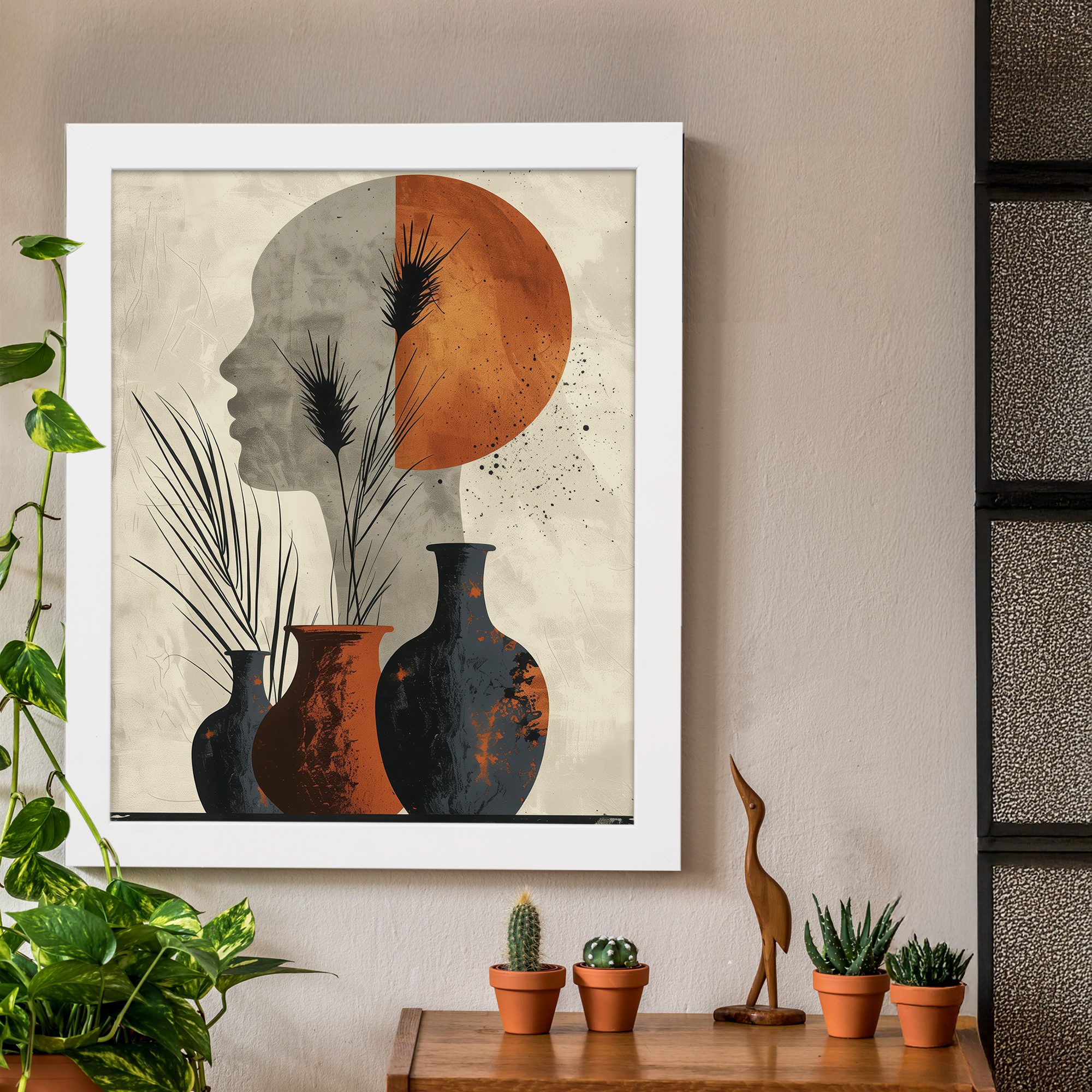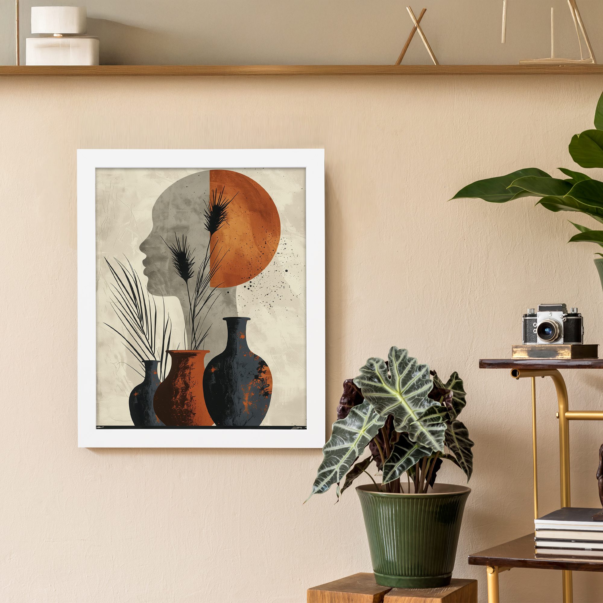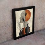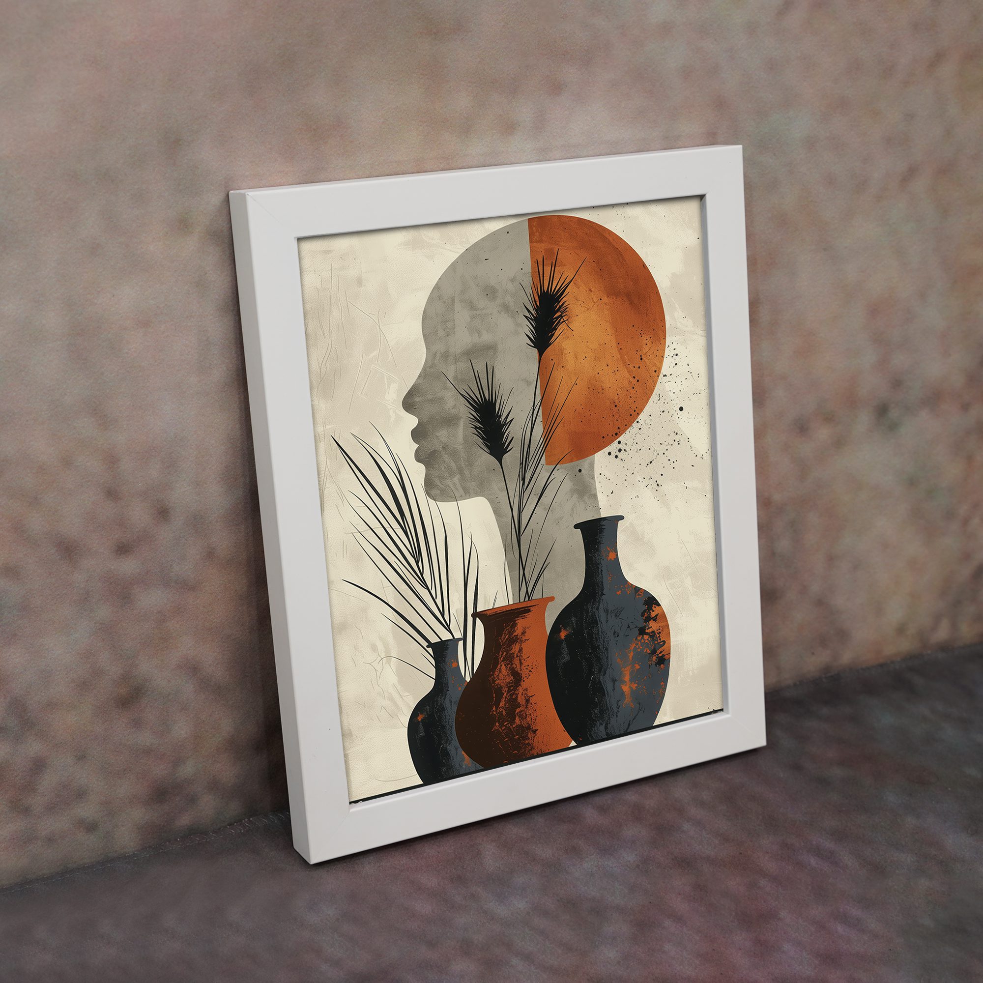 Bring a calm and artistic touch to your space with our Contemporary Wall Art. This design features an abstract face silhouette combined with botanical elements and decorative vases. The composition is enhanced with a bold circular background, creating a balanced and modern look.