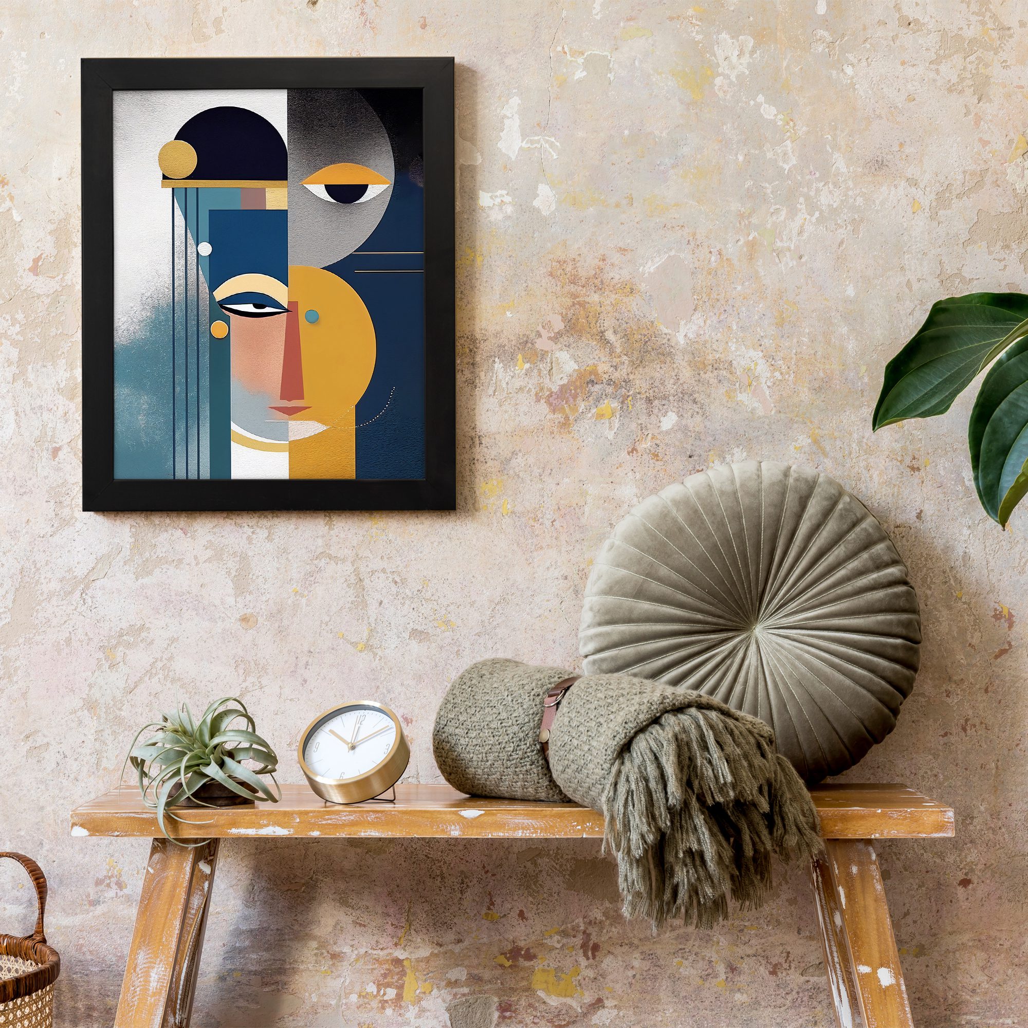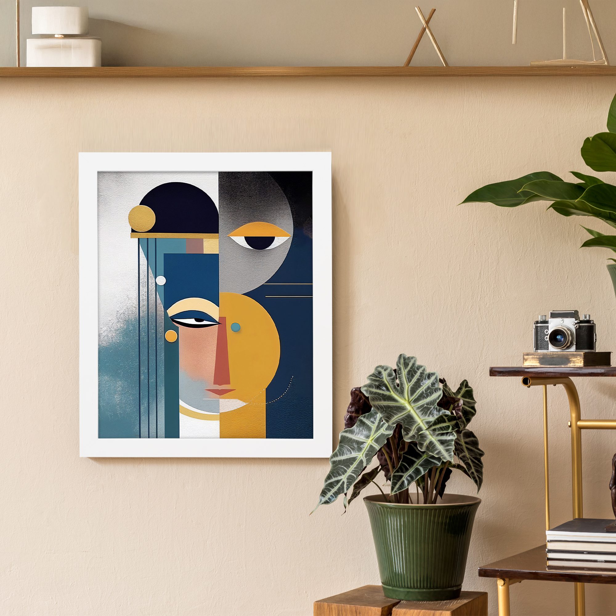 The use of deep blue, mustard yellow, grey, and soft neutral tones create a calm yet striking visual. The combination of shapes and colors adds depth while maintaining a clean and modern aesthetic.