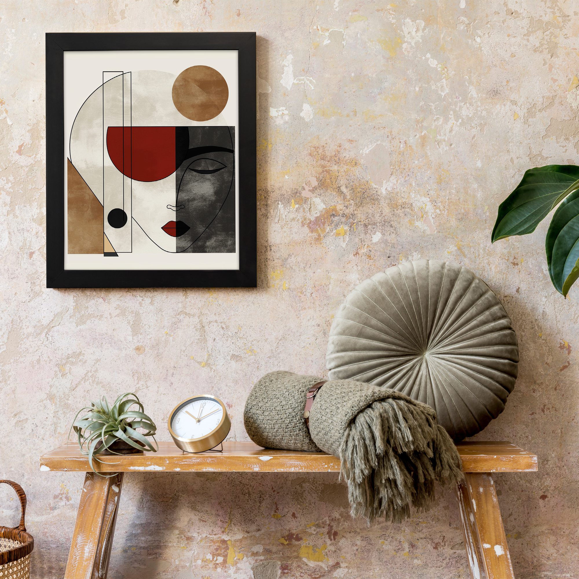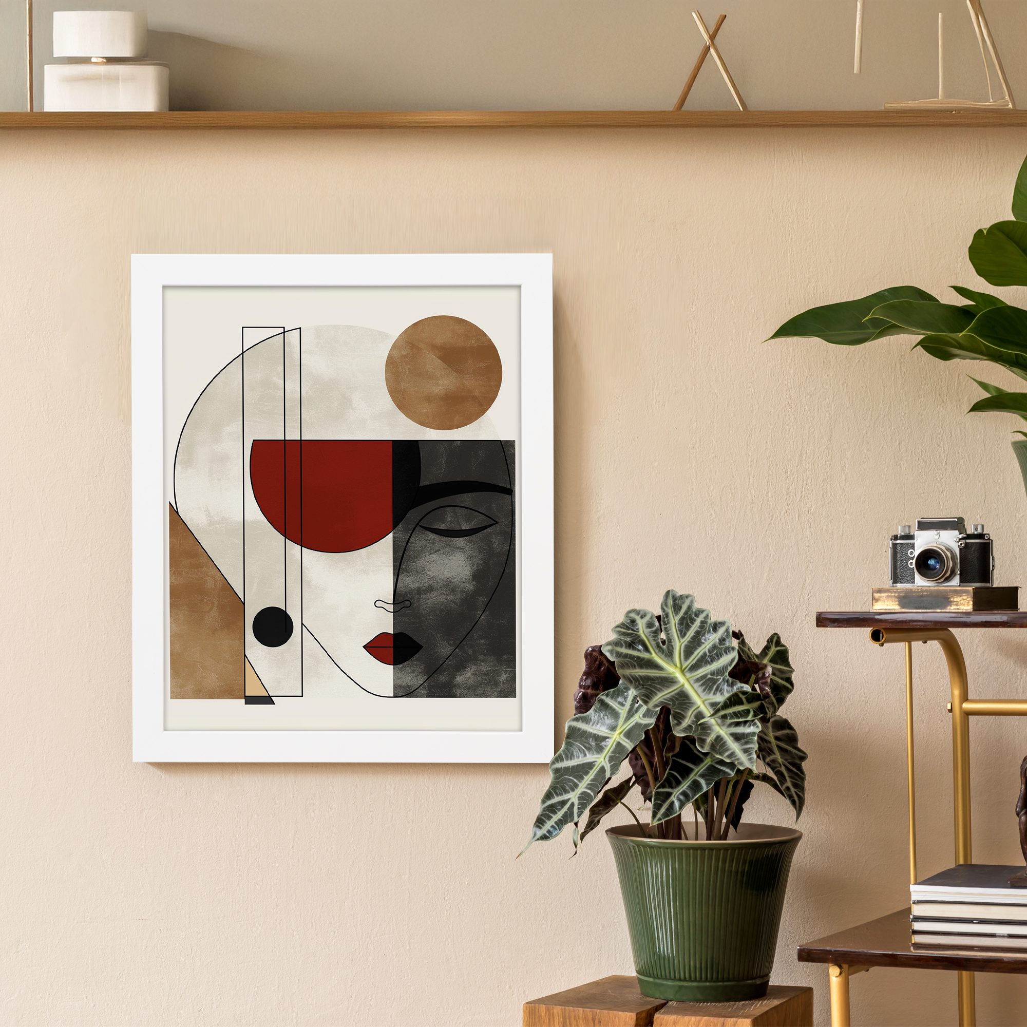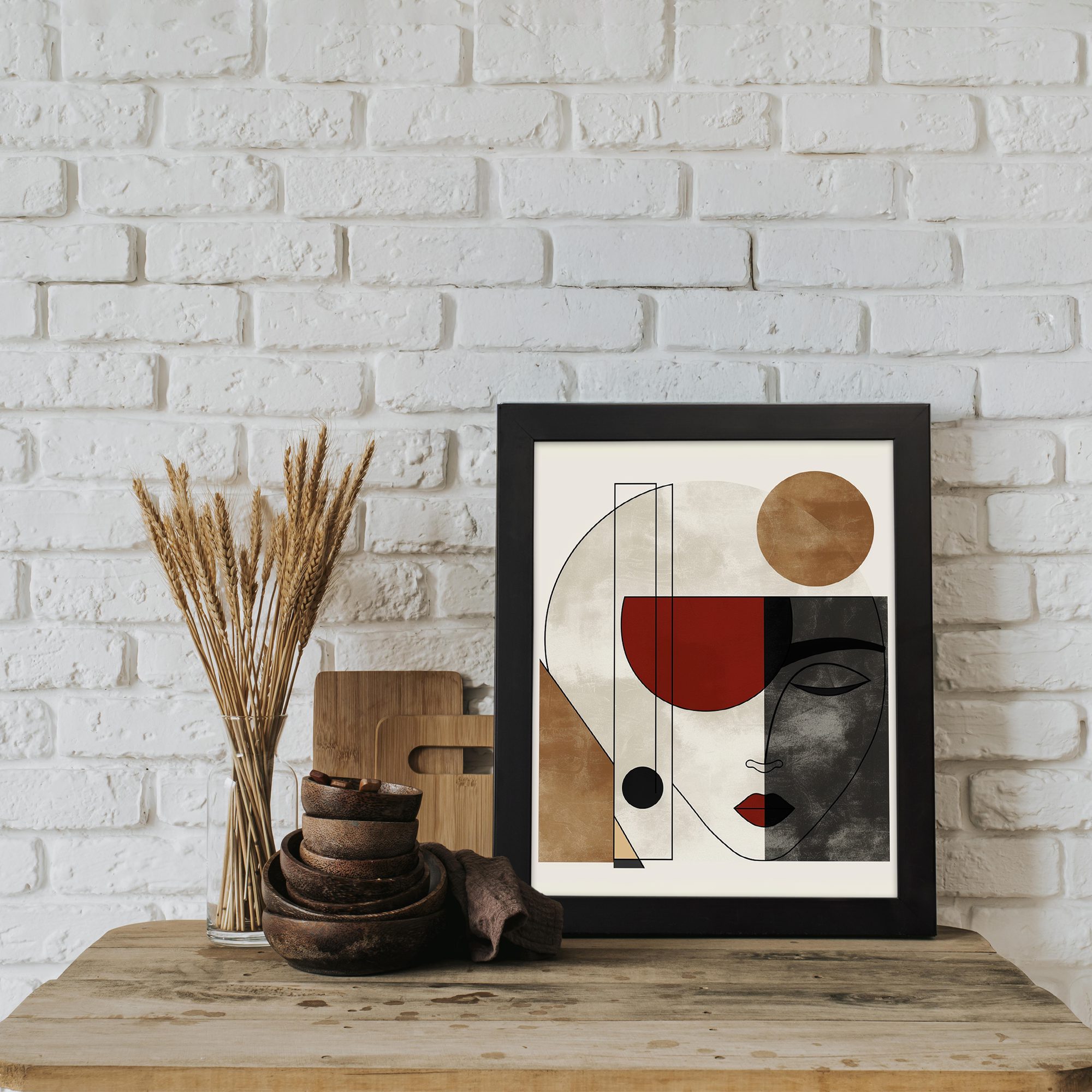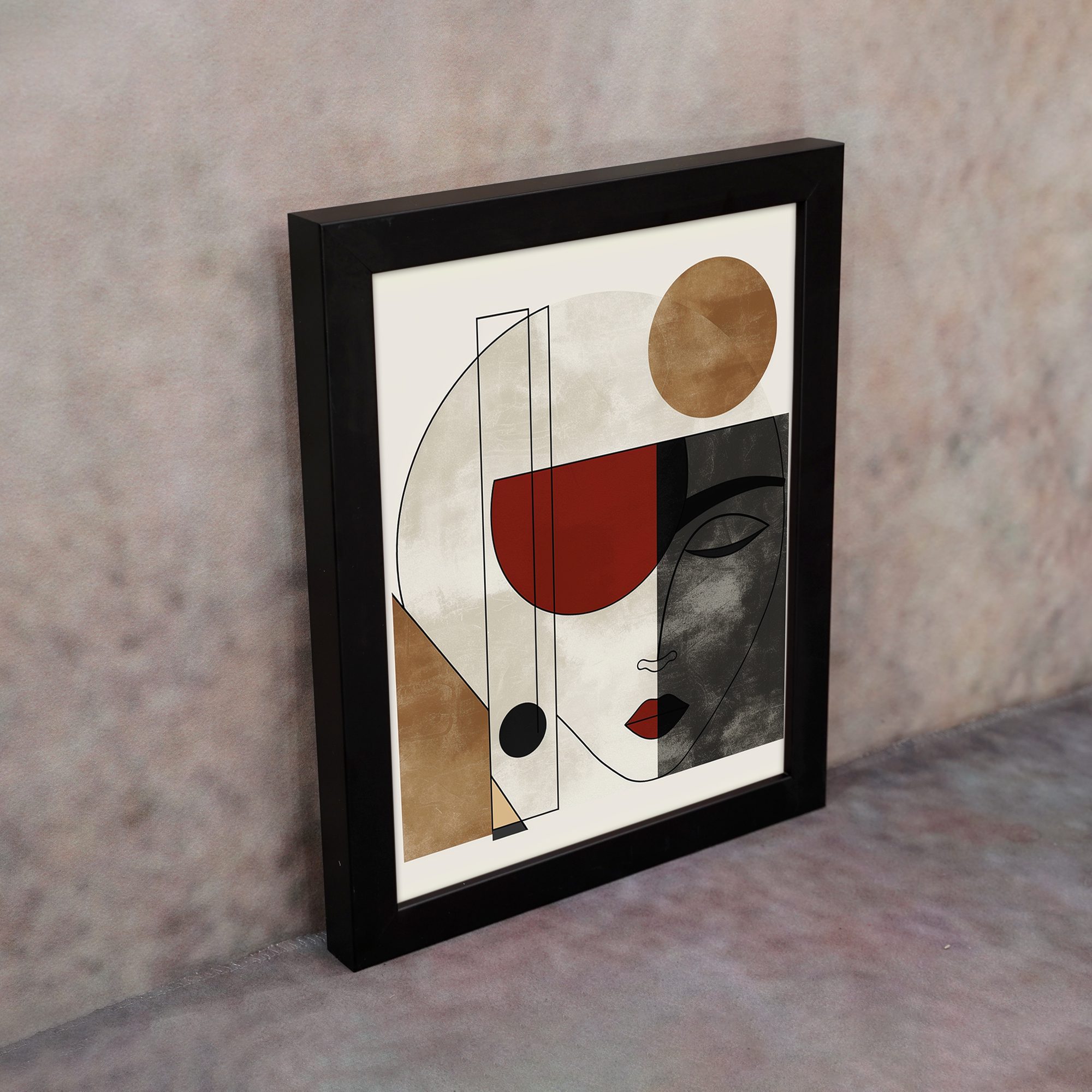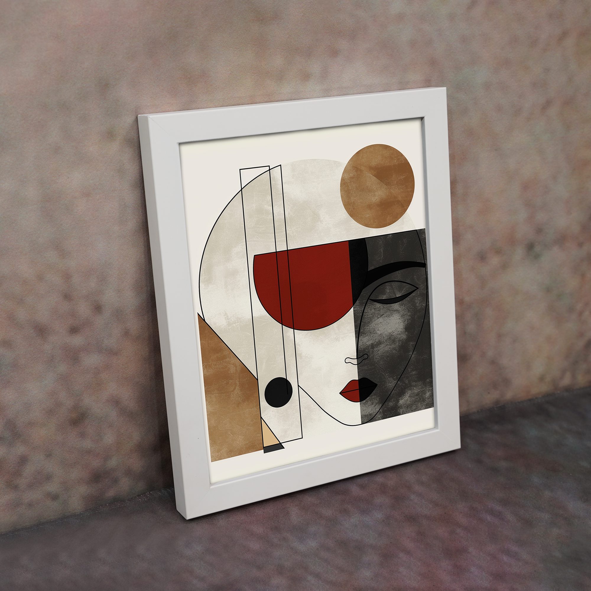 Bring a clean and elegant touch to your space with our Contemporary Wall Art. This design features a minimal abstract face combined with geometric shapes and soft textured blocks. The composition is simple yet visually striking.