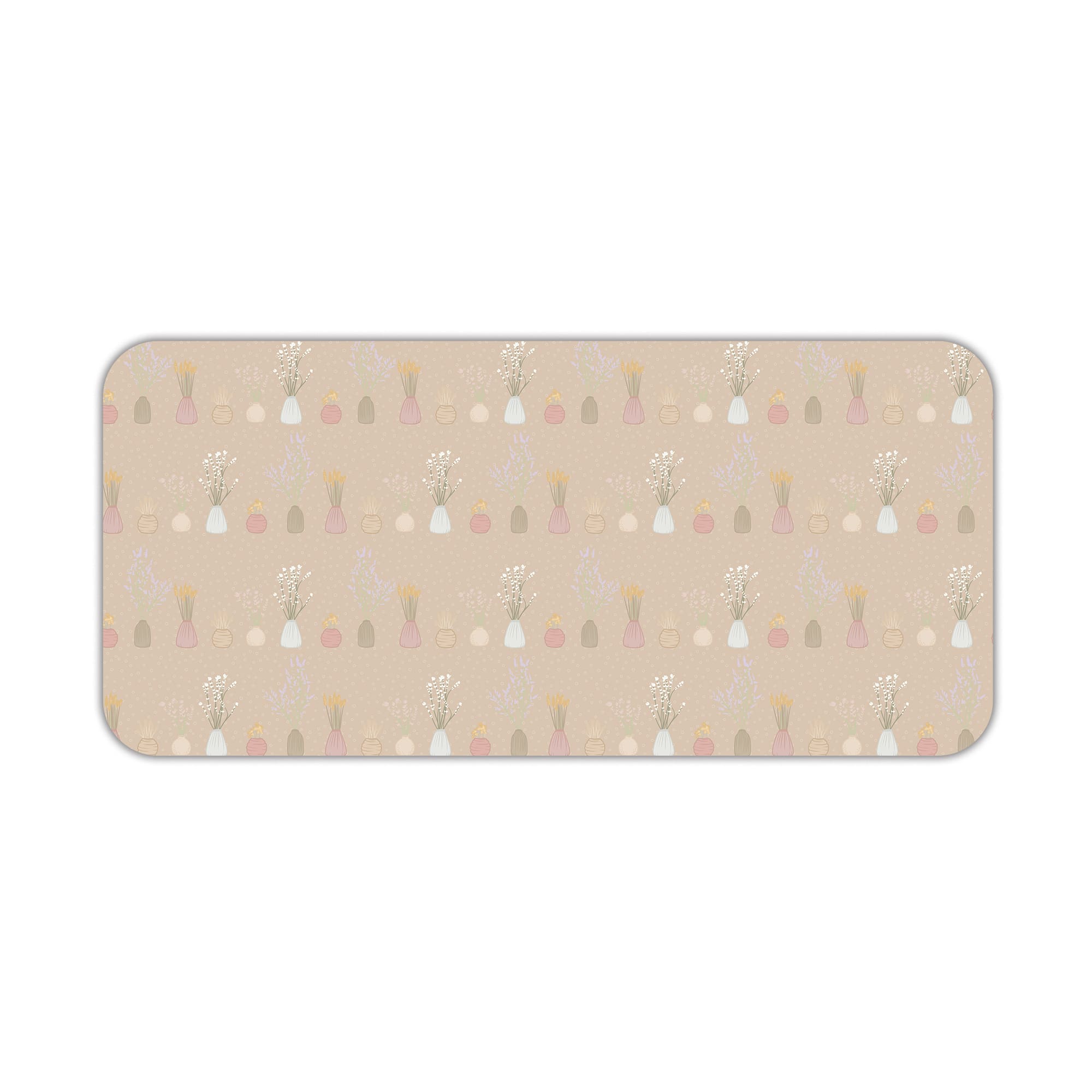 Add a soft and cozy charm to your workspace with this Cute Mini Vase Floral Desk Mat. The design features small decorative vases with delicate flowers arranged in a repeating pattern over a warm beige background, creating a subtle and aesthetic look.