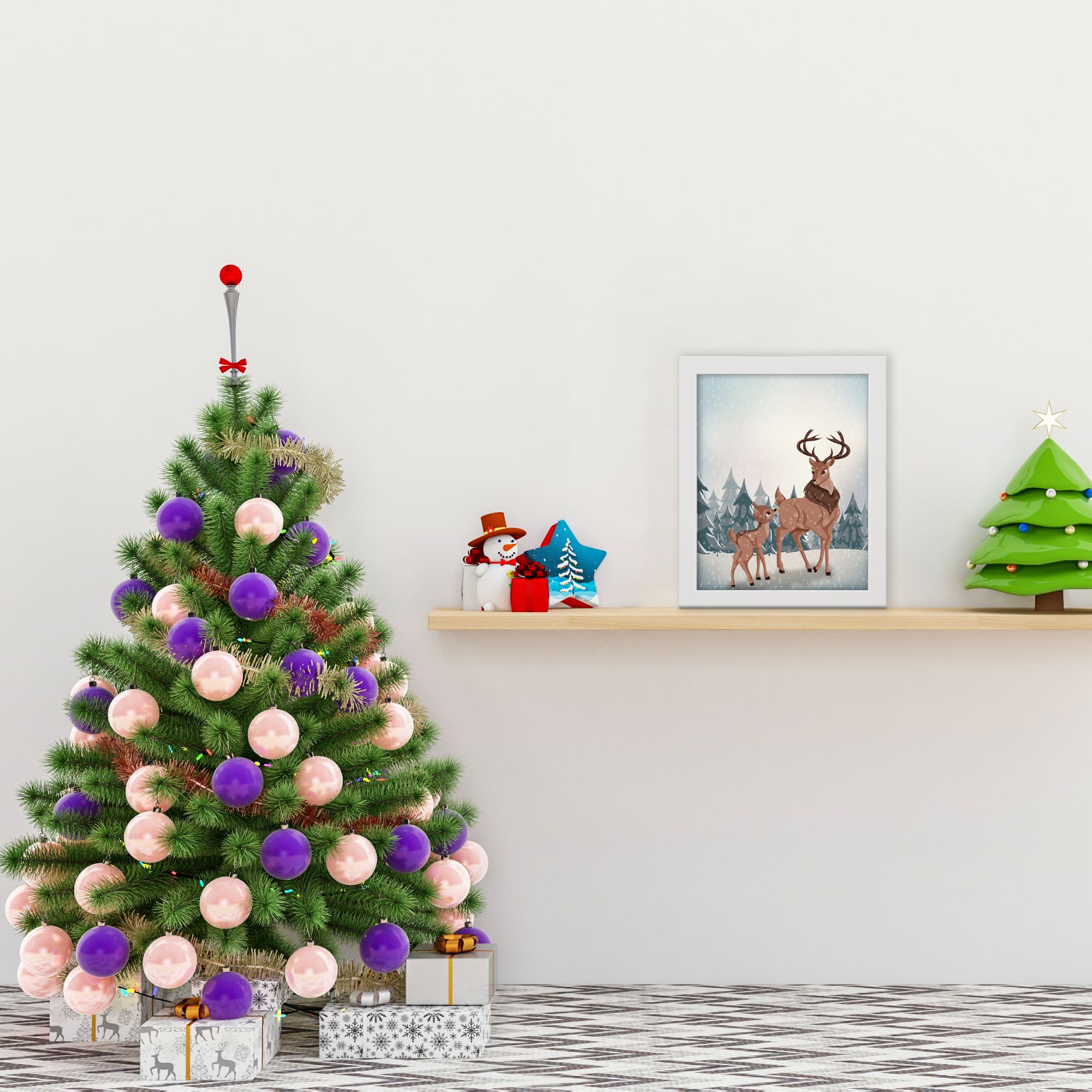 Infidu Beautiful Deer Art Peaceful Winter Forest Wall Print this piece of art, a brown deer with big antlers stands out against a light snowy background. Styled gray and green trees make a peaceful forest scene in a soft, watercolor-like way. This unique holiday print adds a touch of Christmas style to your home.