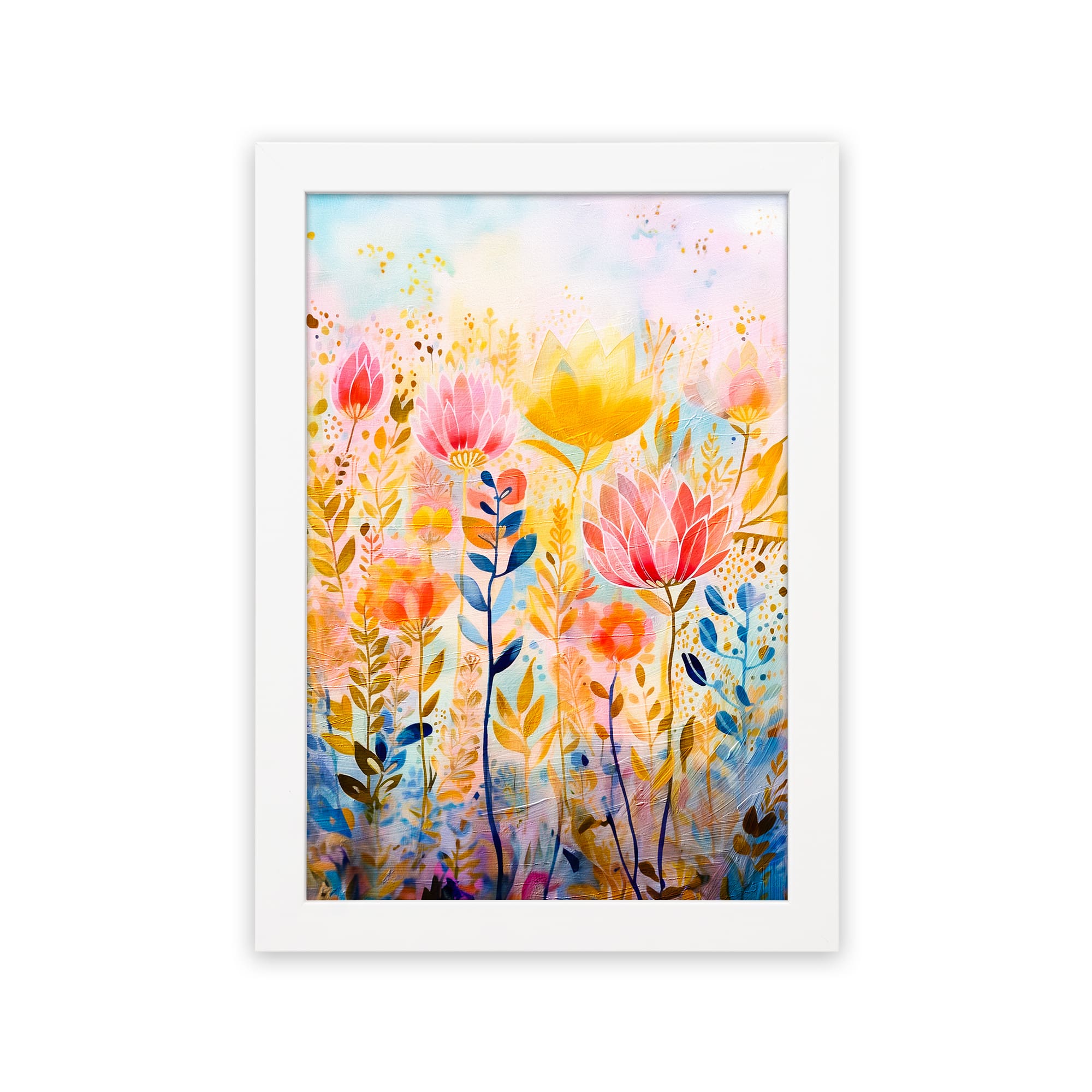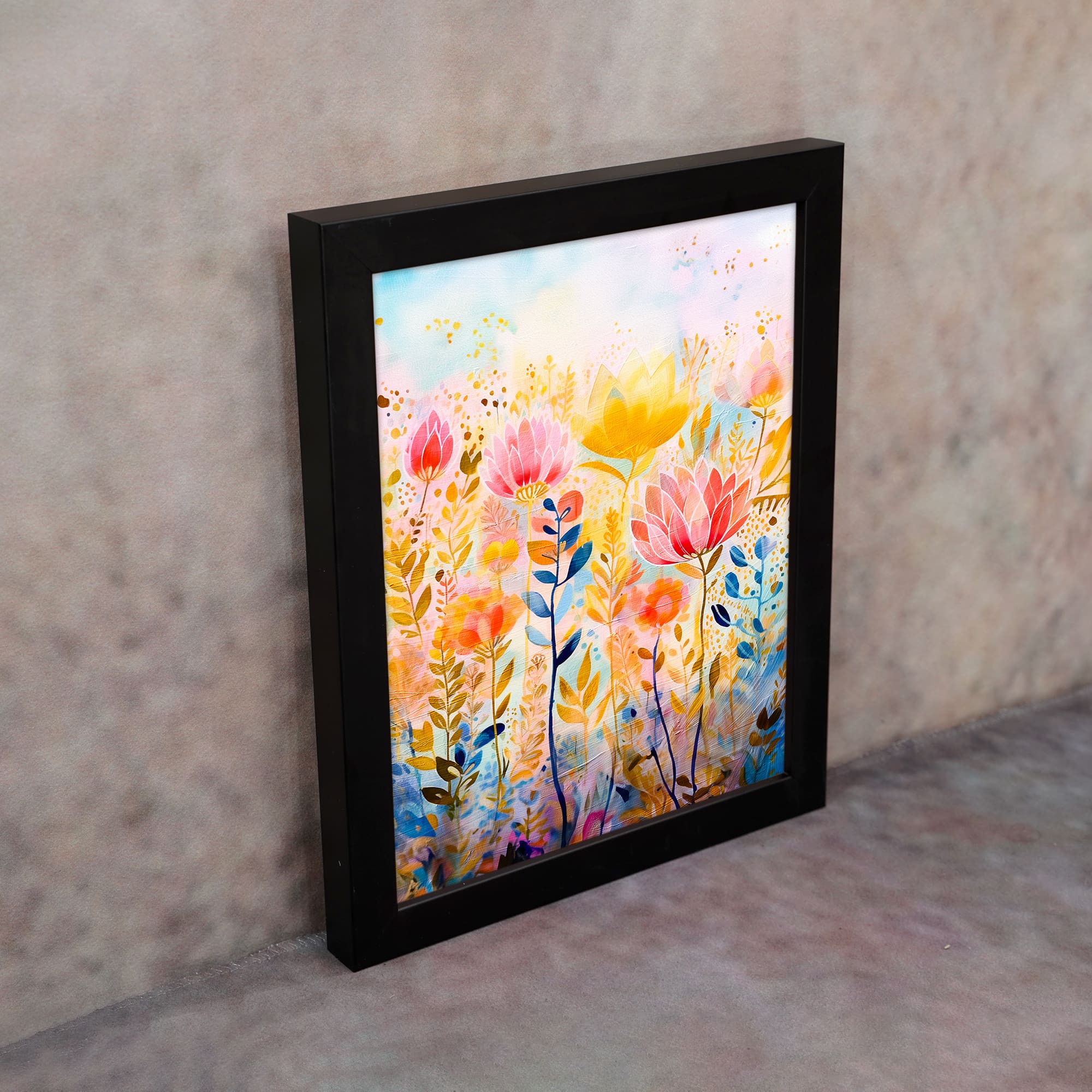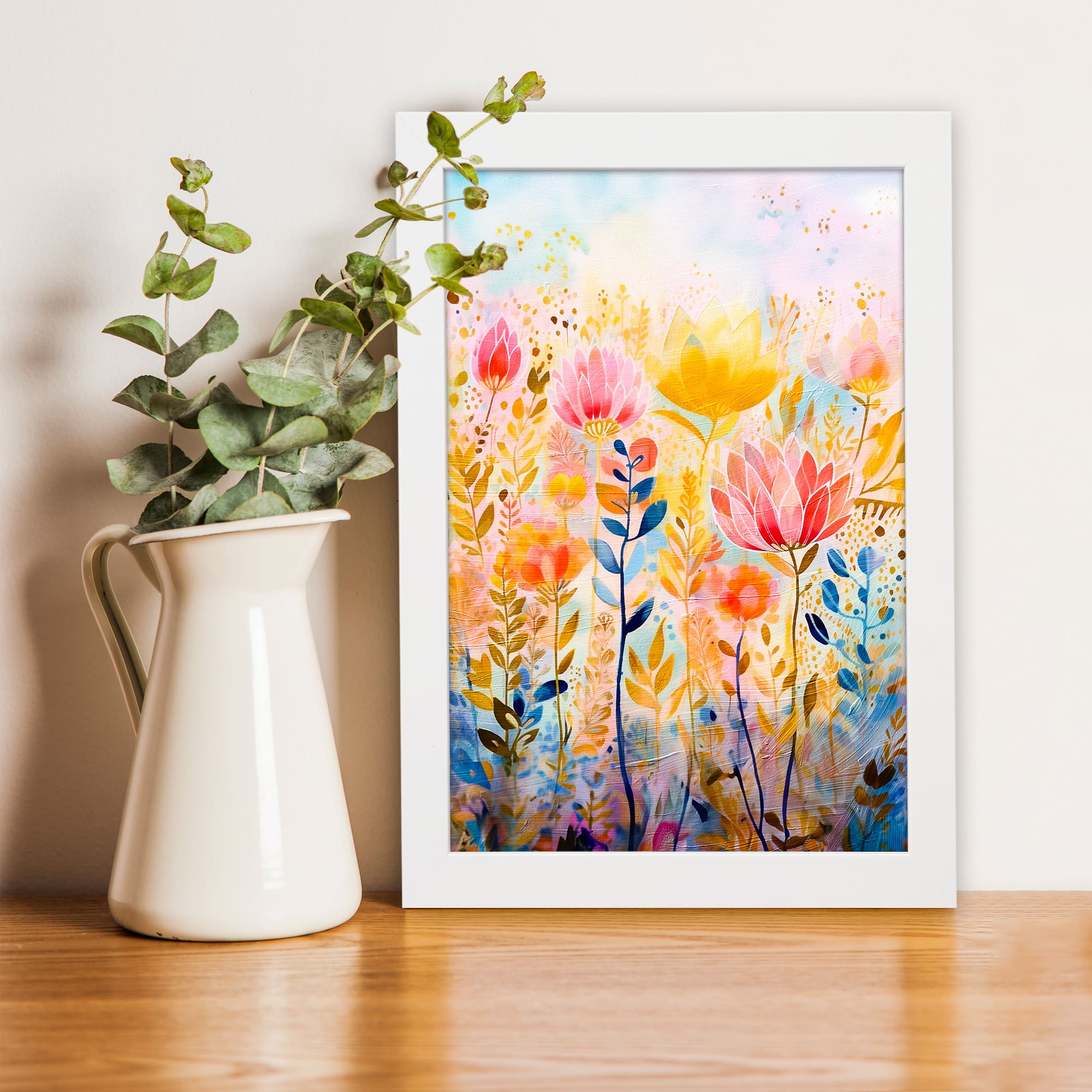 Create a calm and refreshing atmosphere with this Elegant Floral Meadow Wall Art. This artwork features delicate flowers blooming in soft shades of yellow, pink, blue, and orange, set against a light and airy background. The gentle composition gives a peaceful and uplifting feel.