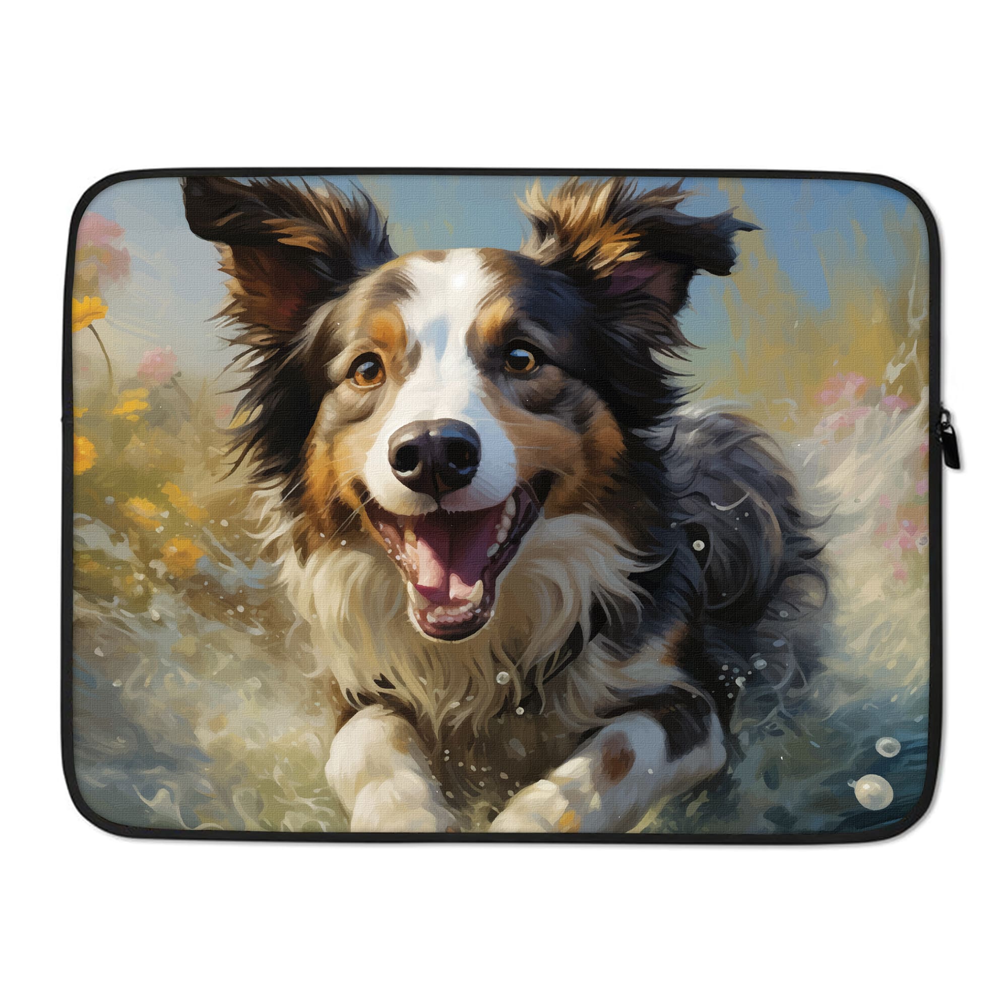 The Infidu image shows a lively dog running through water. This laptop sleeve features a charming picture of a joyful dog, likely a Border Collie, running through water. The colorful picture of the dog in the middle of a splash shows how active and playful it is. The blurred background of nature and the splashing water give the sleeve a feeling of movement and heat. This case is stylish and practical, with strong materials and a secure zip closure that will keep your laptop safe. Skilled digital artists skillfully combined imagination and usefulness to create this high-quality item!