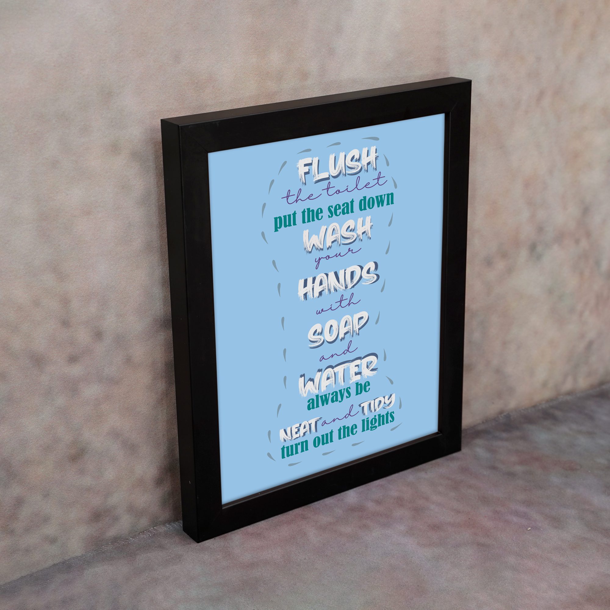 The Infidu Flush The Toilet Wall Art is designed to give your toilet a fresh, modern appearance. This design looks clean and stylish with its soft sky-blue background and white and navy blue text. Modern, clean typefaces show the message, “Flush the toilet, put the seat down, and wash your hands with soap and water always be neat and tidy turn out the lights.” It enhances the appearance of any bathroom and complements modern bathroom decor, country bathroom wall art, and simple styles. Skilled digital artists created this piece, ensuring its high quality and durability. It would look lovely on the wall of your bathroom or make a thoughtful gift!