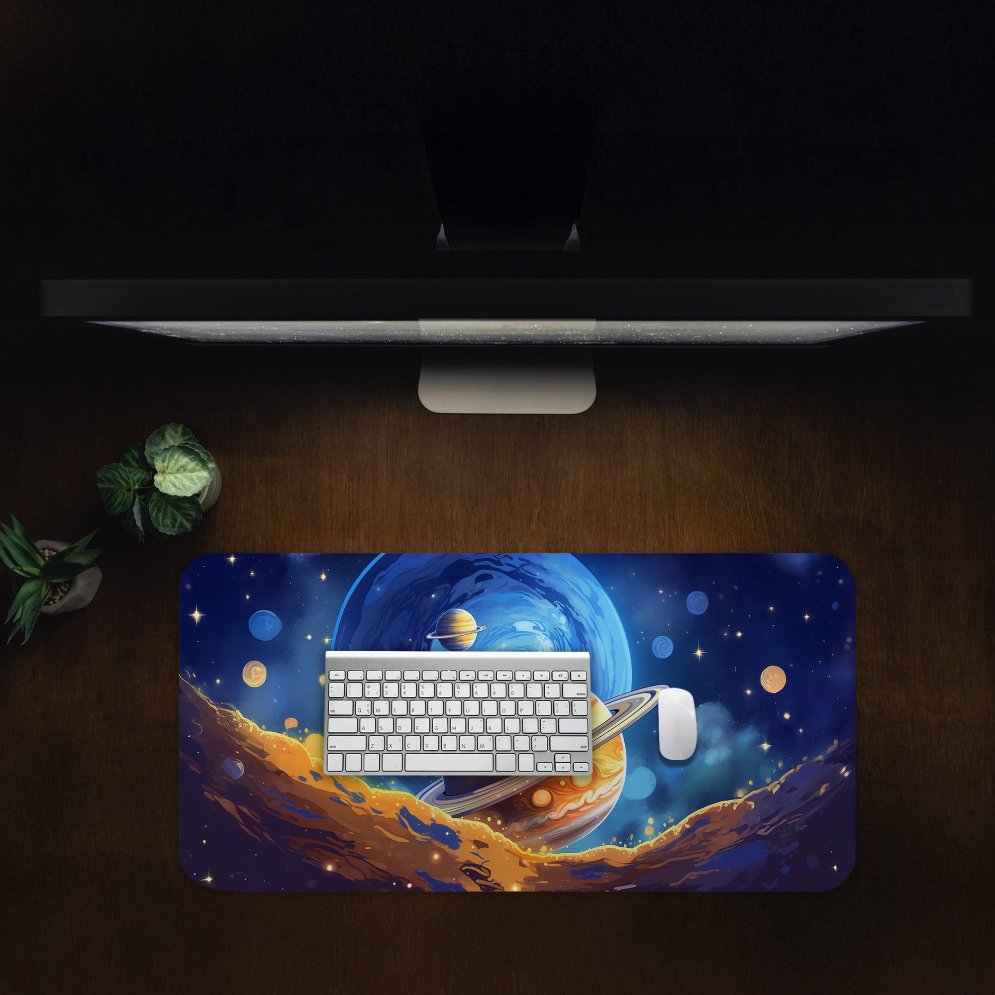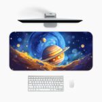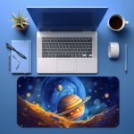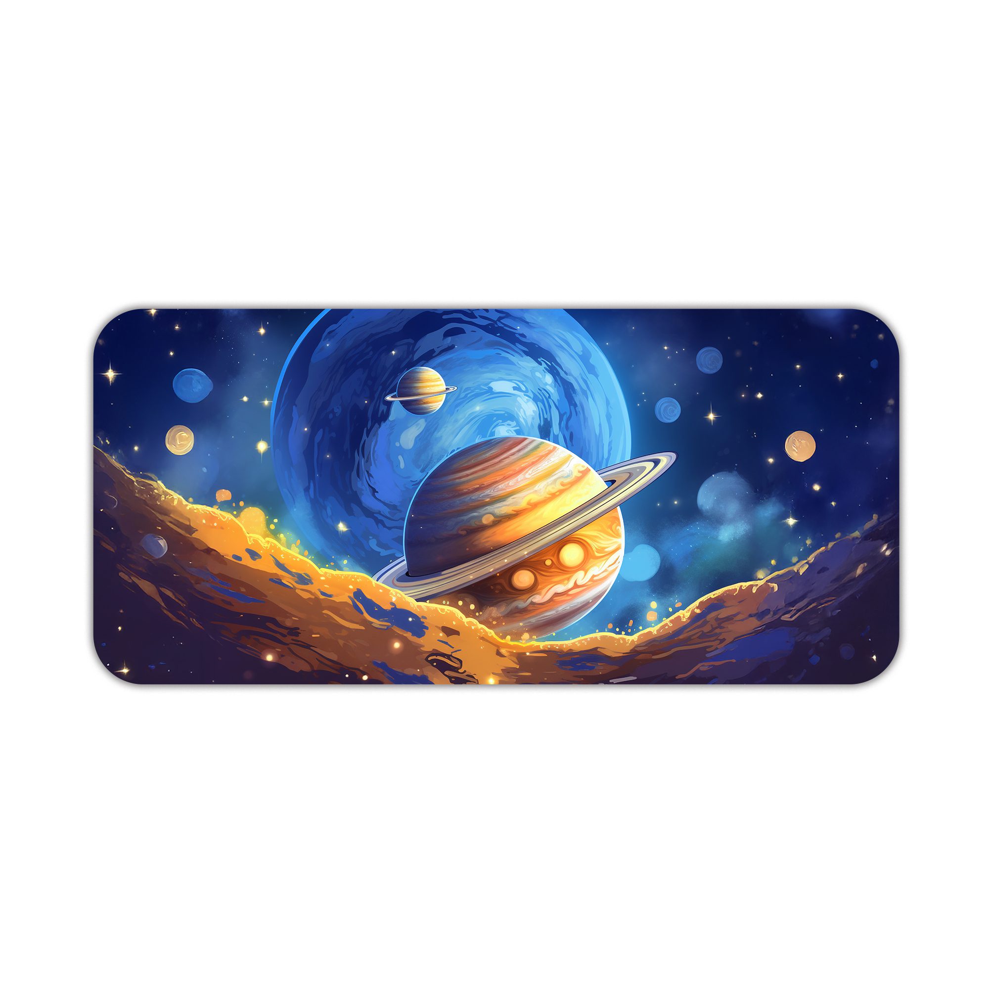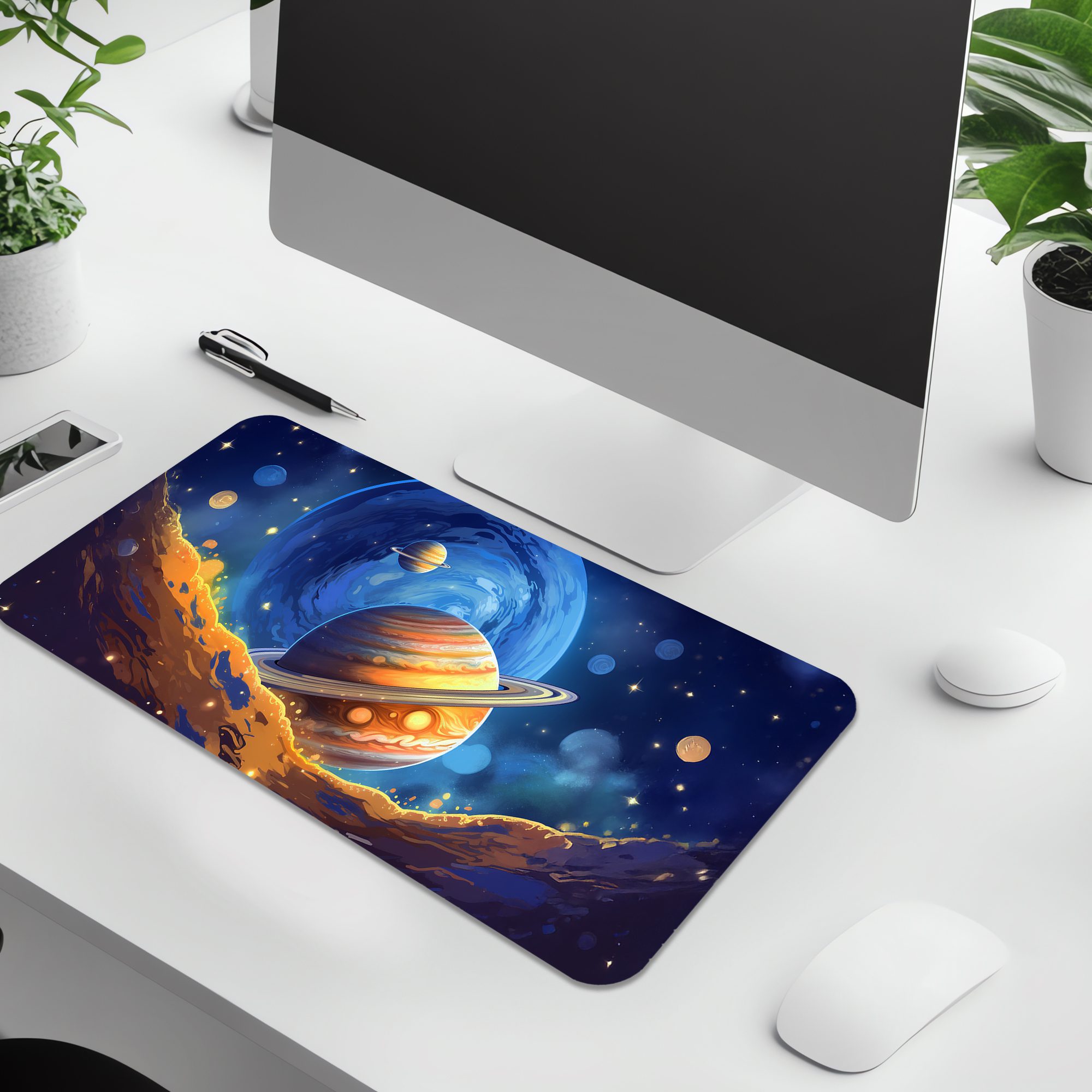 Upgrade your workspace with this Galaxy Space Saturn Mouse Pad featuring a stunning cosmic design. This artwork showcases a glowing Saturn-like planet surrounded by stars, galaxies, and deep space colors in shades of blue, orange, and gold. The smooth visual flow creates a futuristic and immersive experience.