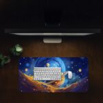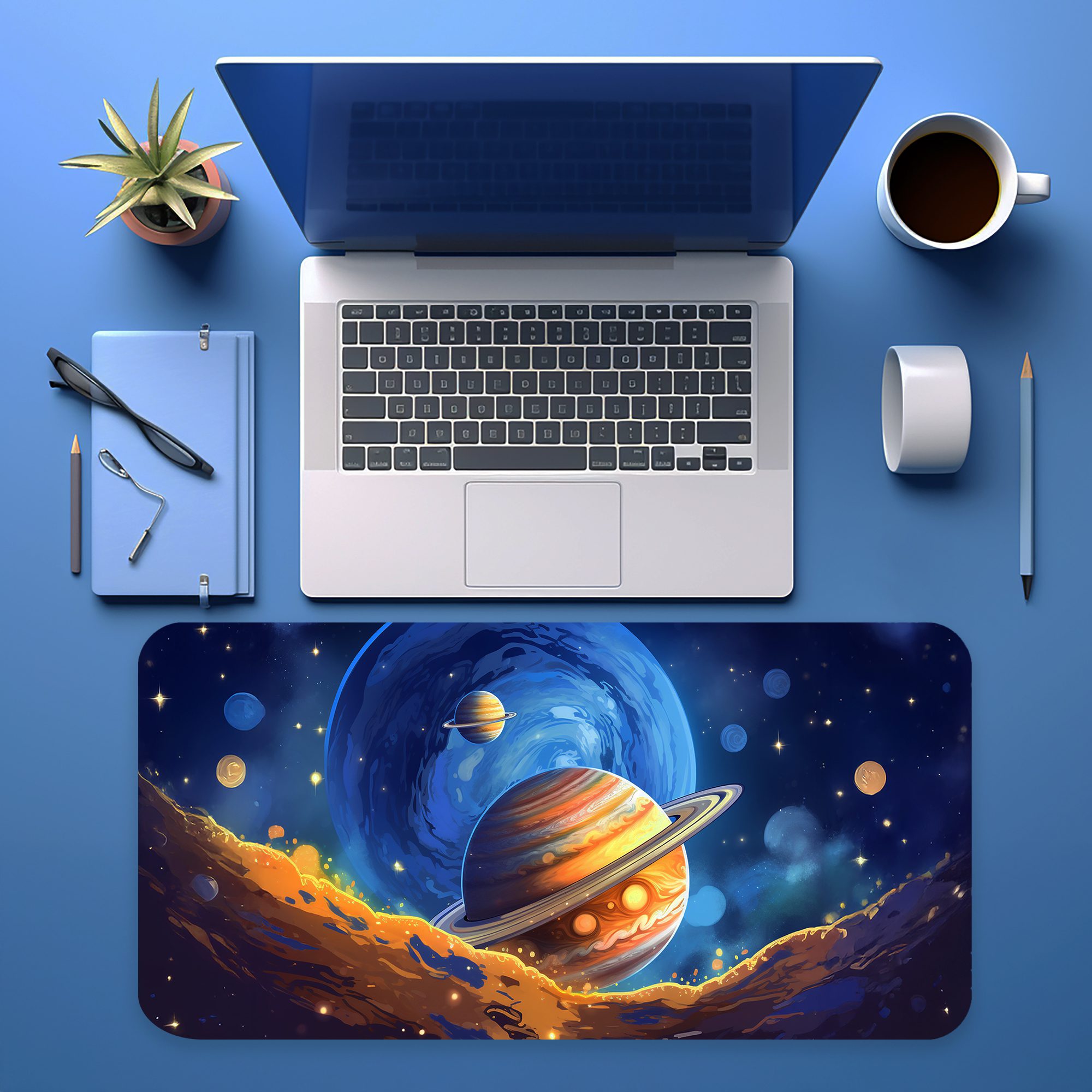 The extended surface provides ample space for both keyboard and mouse, making it perfect for gaming, office work, or creative setups. The vibrant space-themed design adds a unique and modern touch to any desk.
