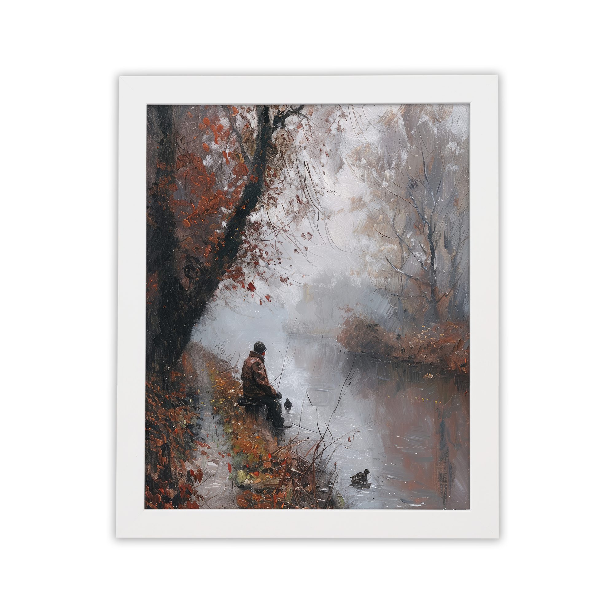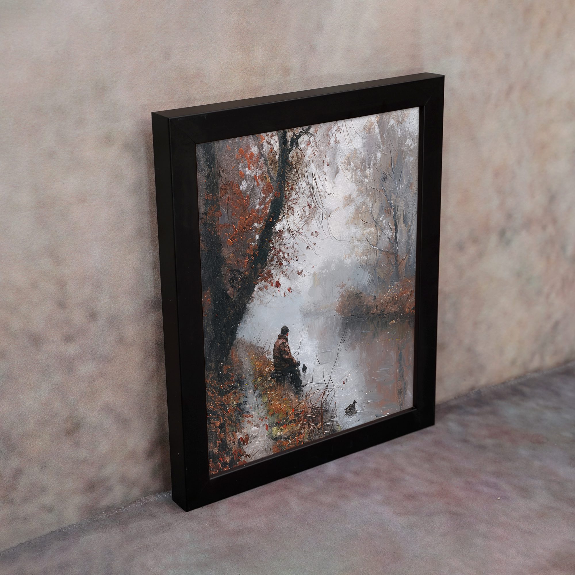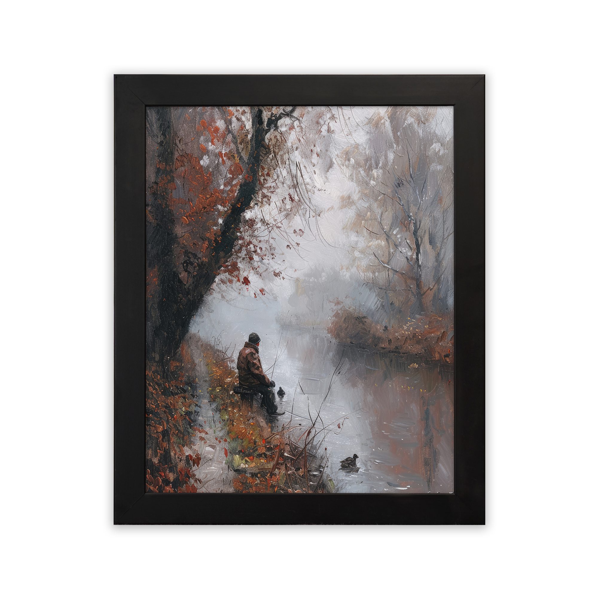 Bring calm and peaceful vibes to your space with this Impressionist River Scene Wall Art. This artwork shows a quiet autumn landscape with soft trees, falling leaves, and a person sitting near the river. The gentle brush strokes and muted colors create a dreamy and emotional feel.