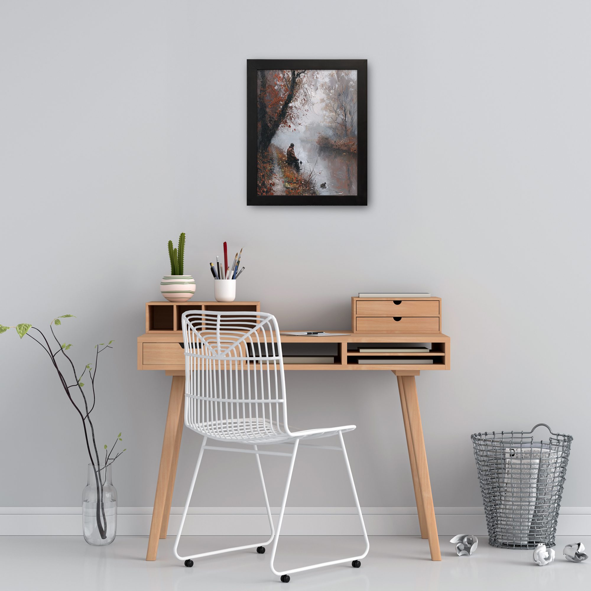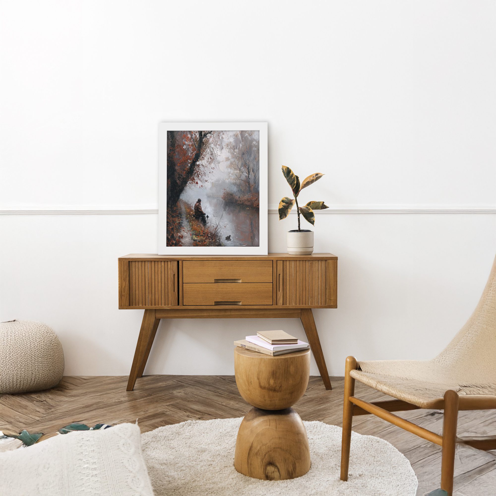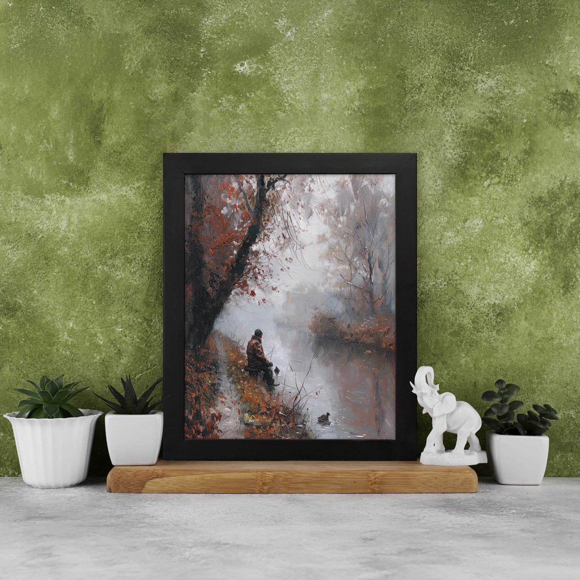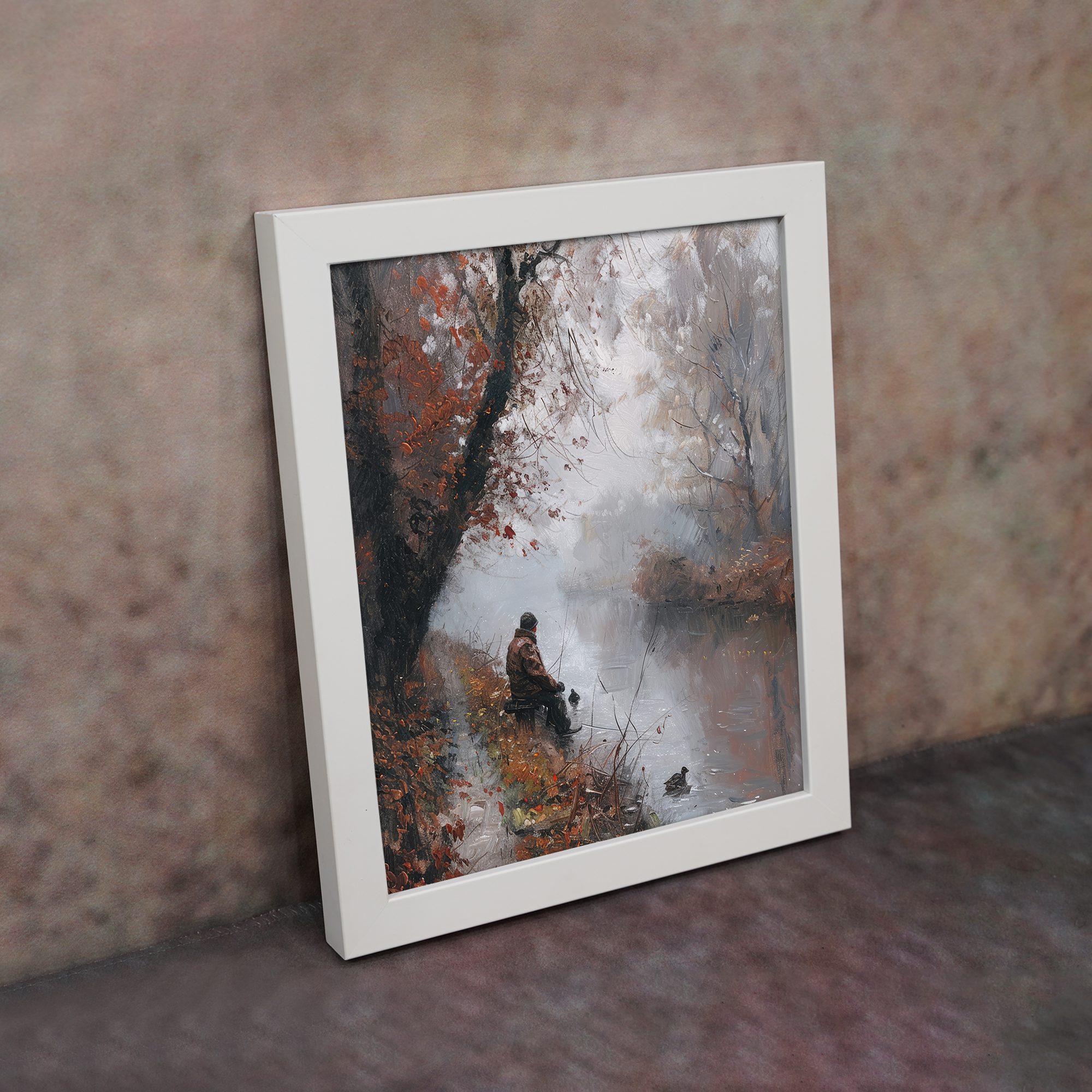 Bring calm and peaceful vibes to your space with this Impressionist River Scene Wall Art. This artwork shows a quiet autumn landscape with soft trees, falling leaves, and a person sitting near the river. The gentle brush strokes and muted colors create a dreamy and emotional feel.