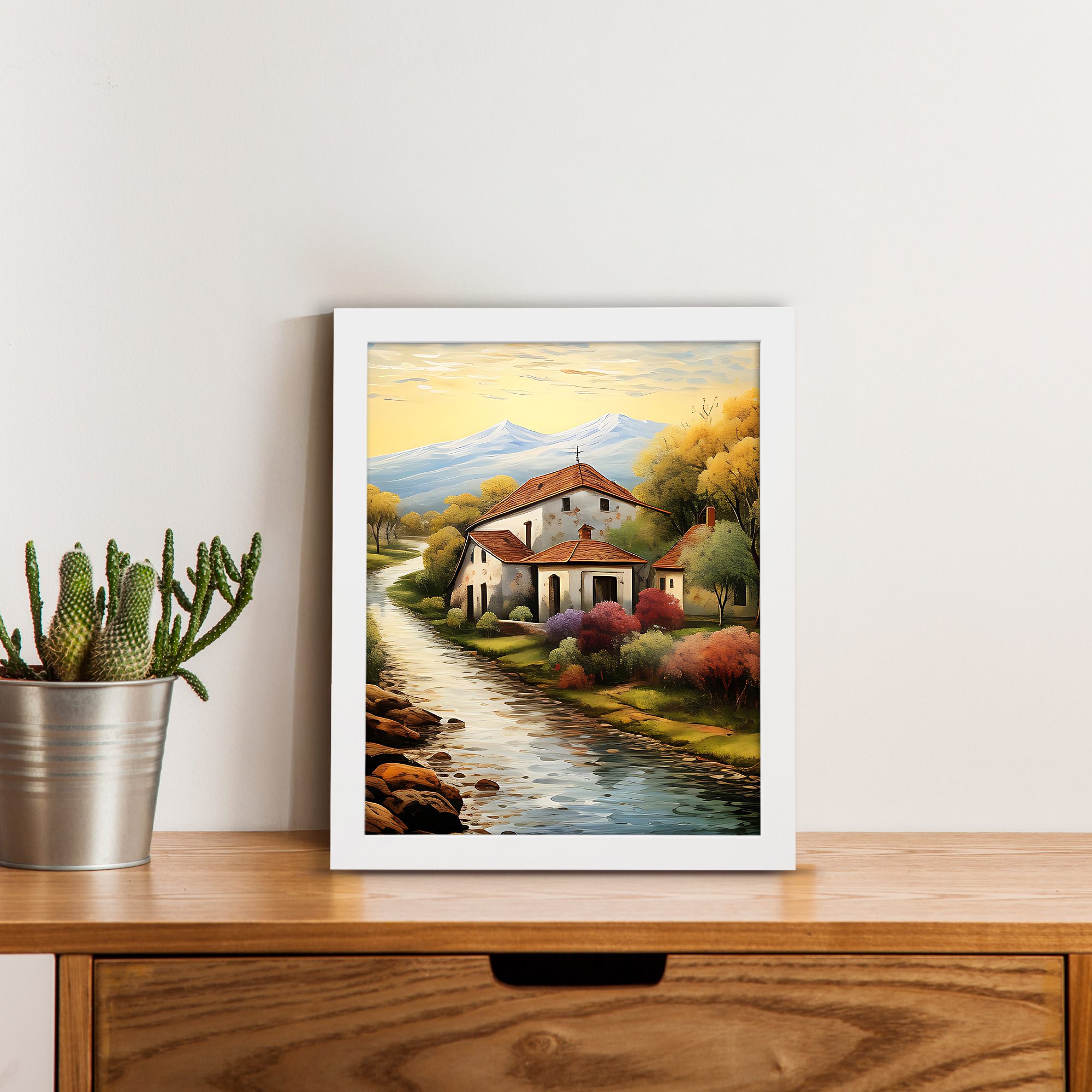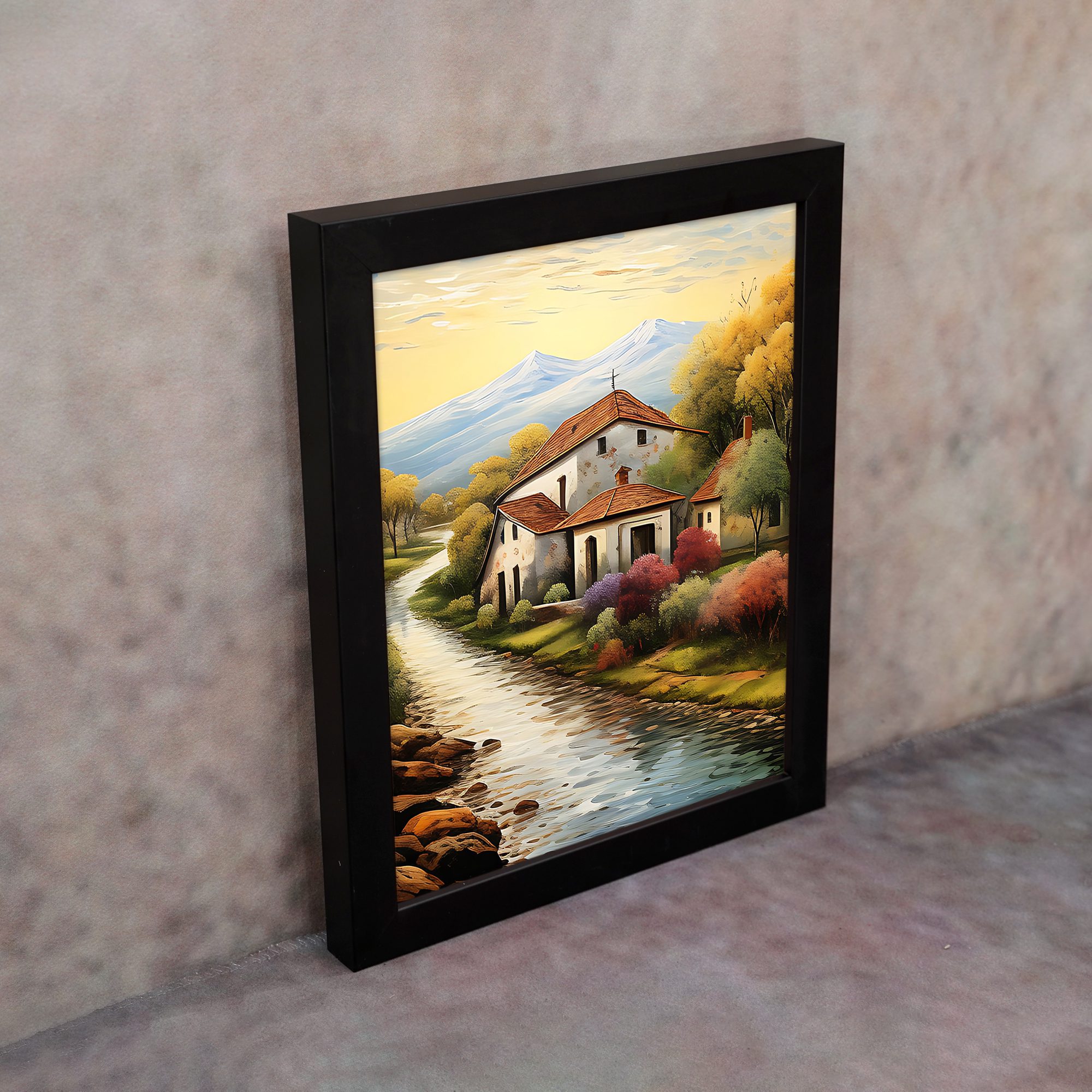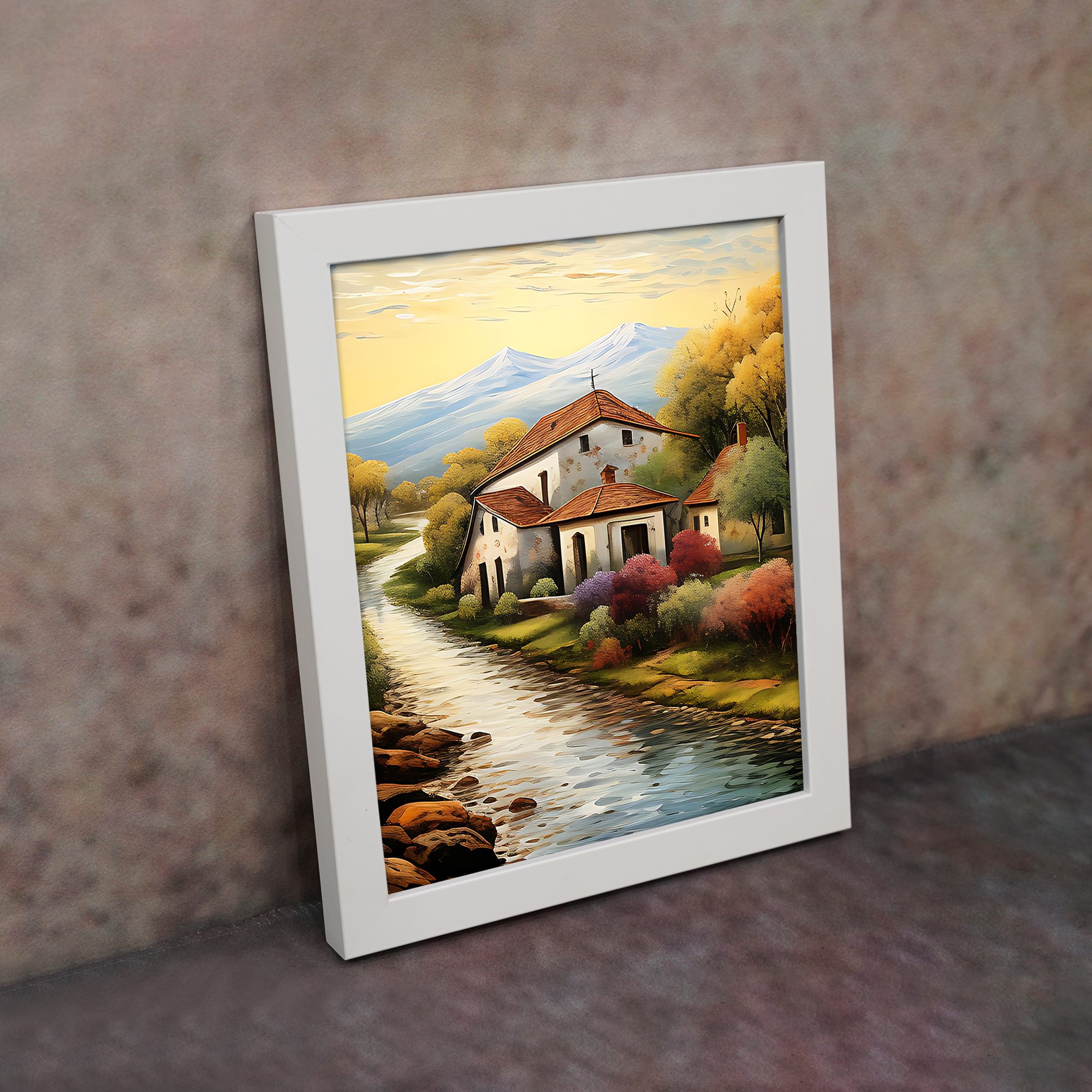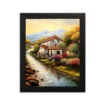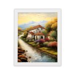 Add a warm and peaceful touch to your walls with this Impressionist Village House Portrait Wall Art. This artwork shows a calm countryside home beside a flowing river, with soft trees and distant mountains. The vertical portrait layout makes the design look elegant and balanced on any wall.
