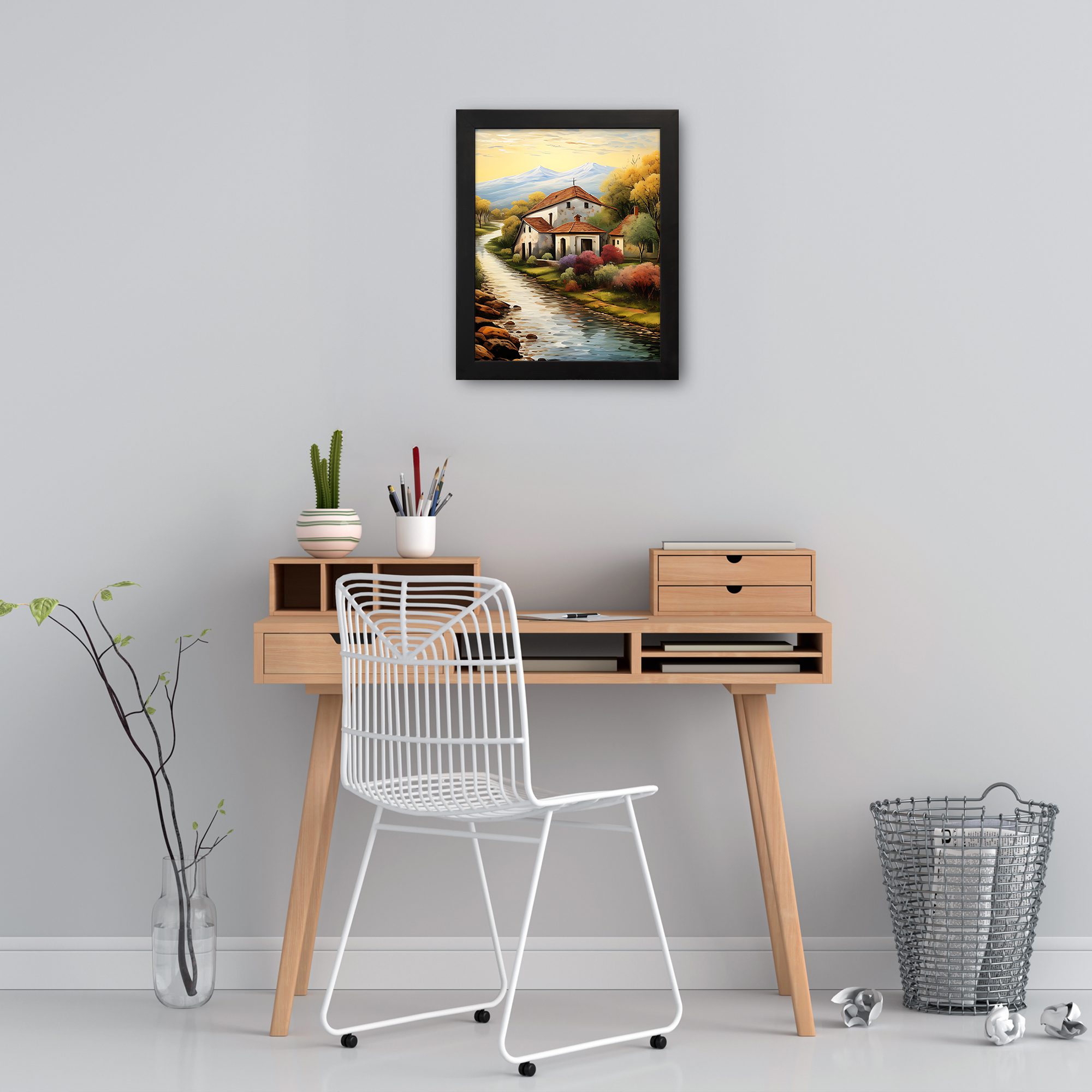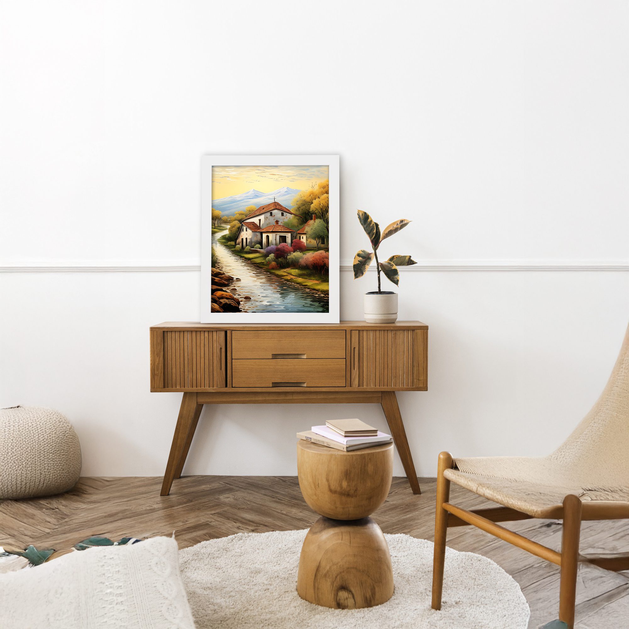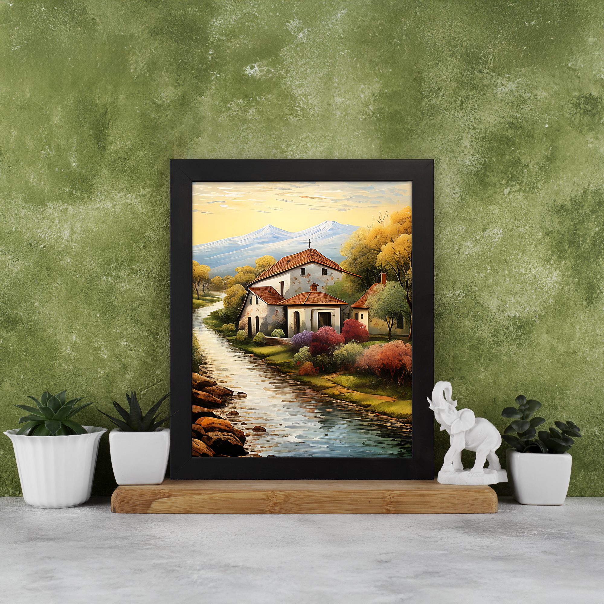 Add a warm and peaceful touch to your walls with this Impressionist Village House Portrait Wall Art. This artwork shows a calm countryside home beside a flowing river, with soft trees and distant mountains. The vertical portrait layout makes the design look elegant and balanced on any wall.