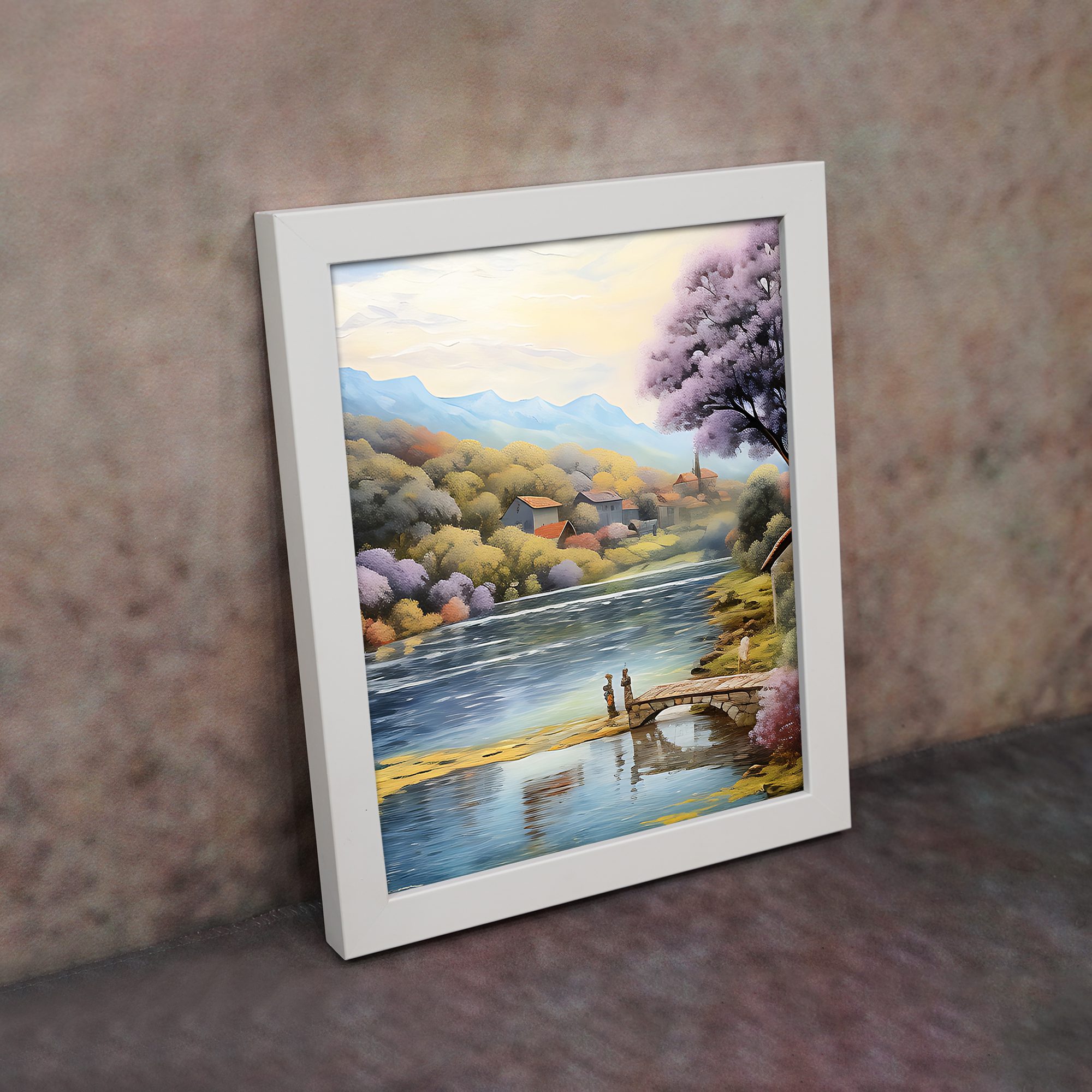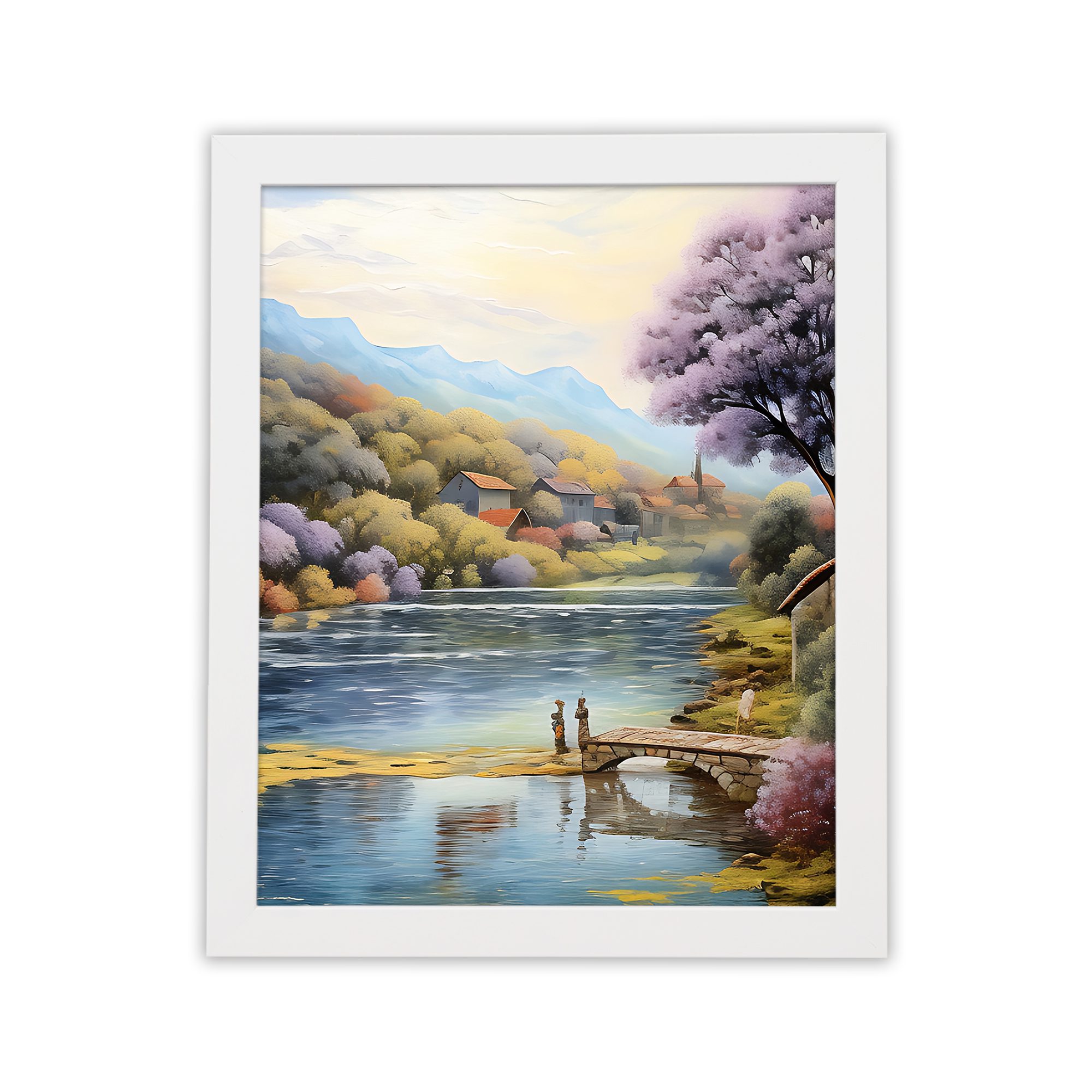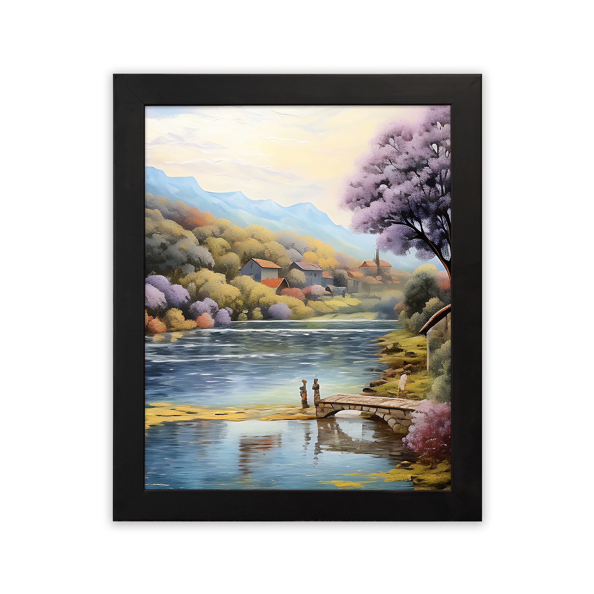 Bring a calm and refreshing vibe to your space with this beautiful lake side village wall art. Designed in a soft impressionist style, this artwork shows a peaceful lake with a wooden dock, surrounded by colorful trees, gentle hills, and a quiet village in the background.