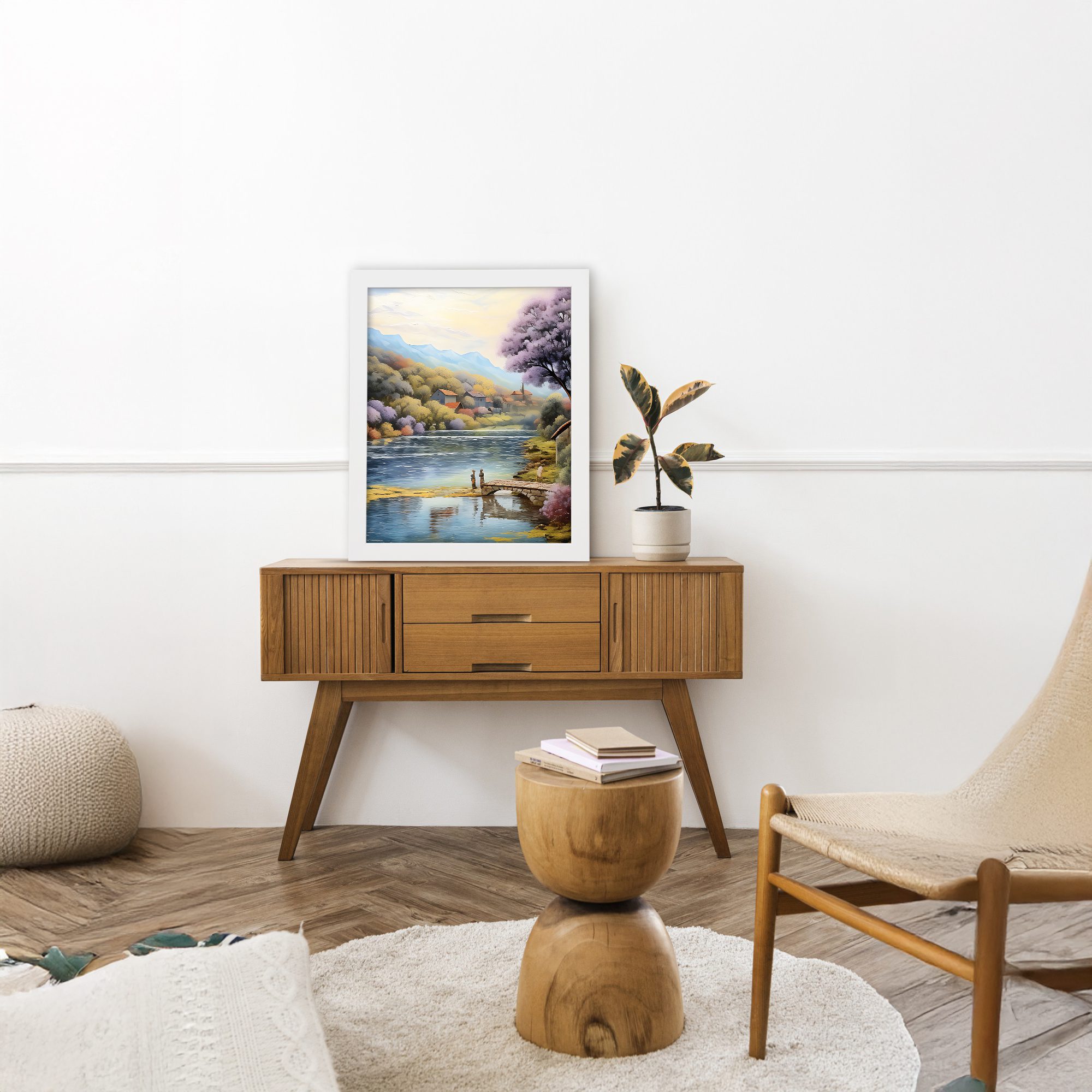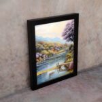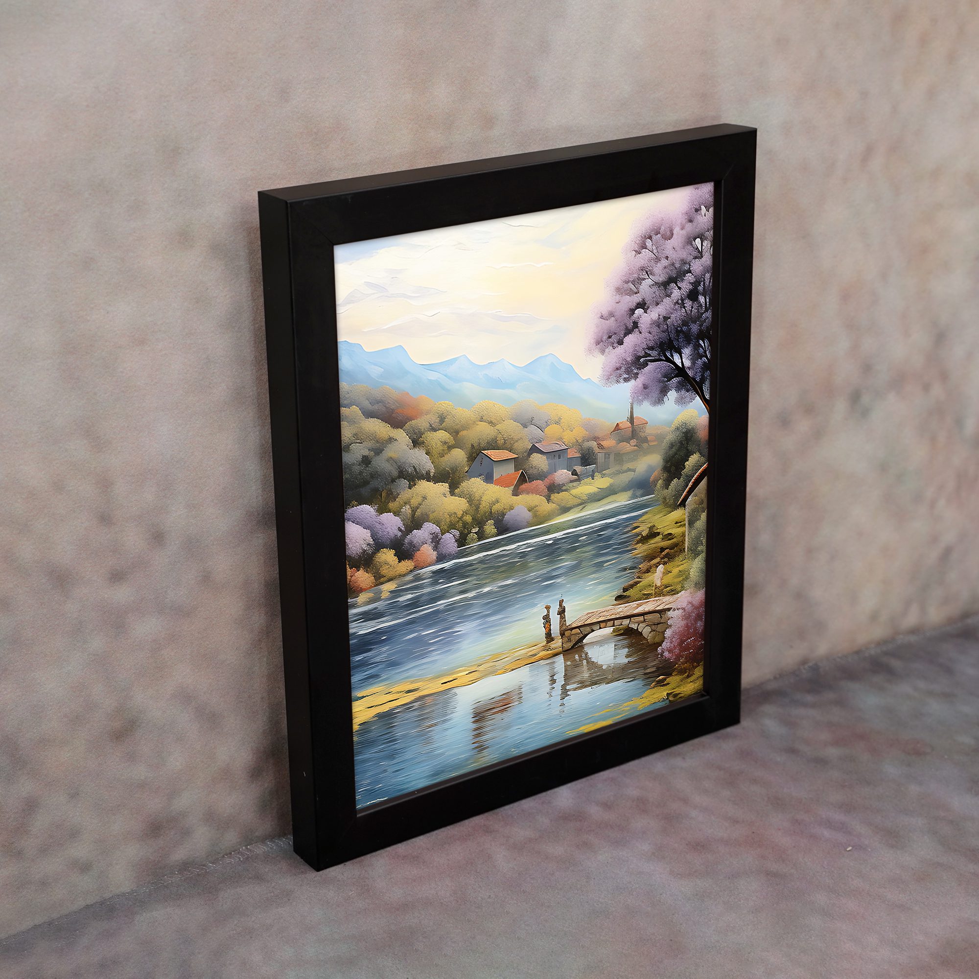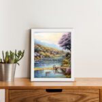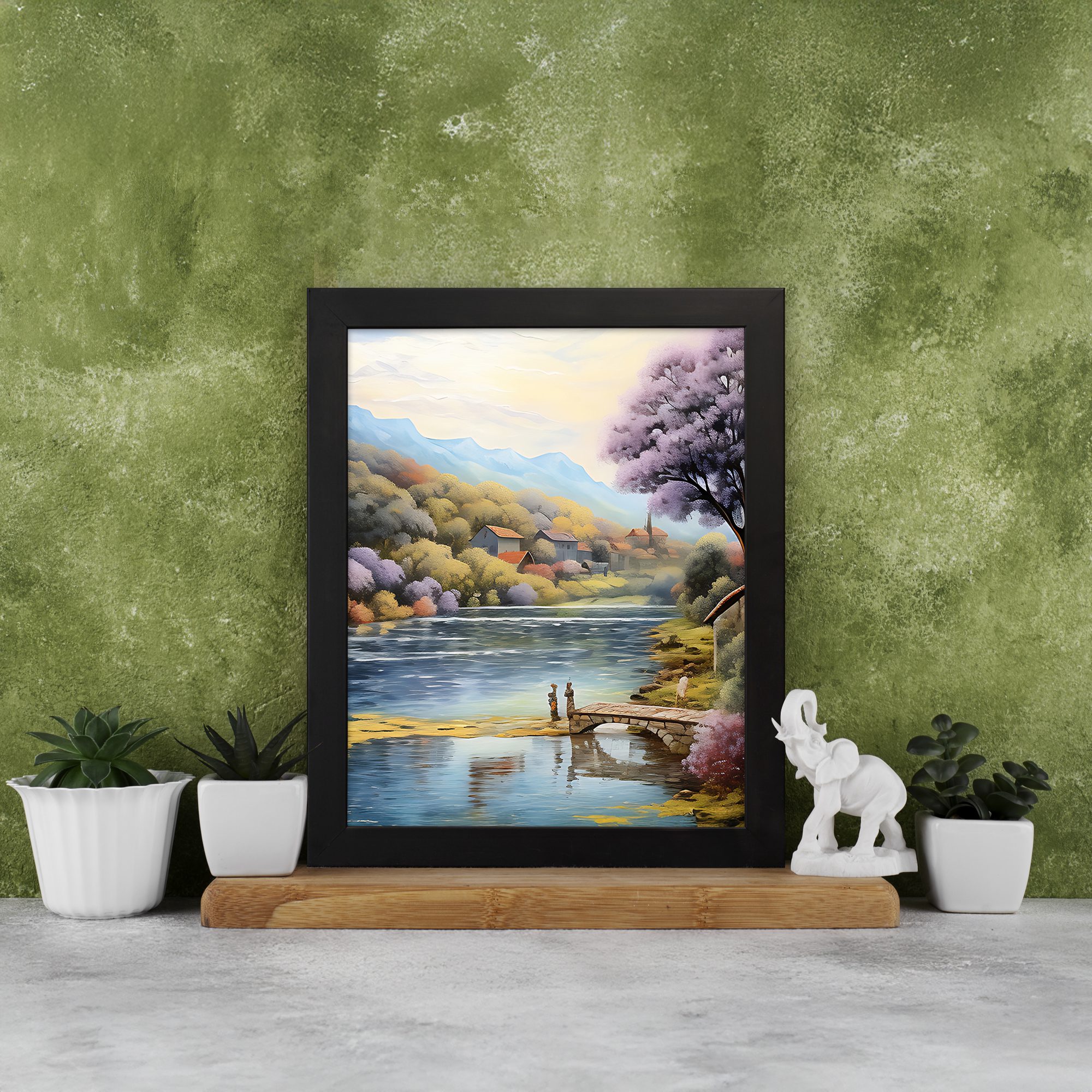 Bring a calm and refreshing vibe to your space with this beautiful lake side village wall art. Designed in a soft impressionist style, this artwork shows a peaceful lake with a wooden dock, surrounded by colorful trees, gentle hills, and a quiet village in the background.